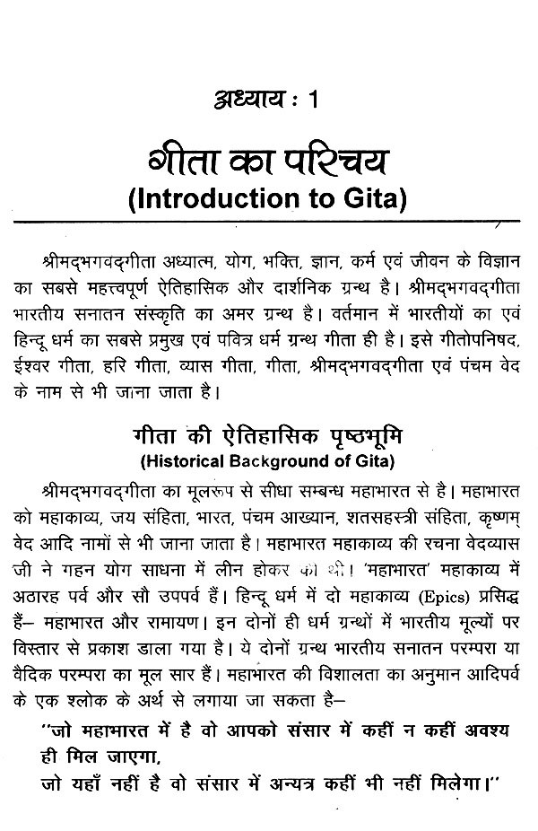 लेखक ने इस अनमोल ग्रंथ के सार को गीता योगामृत नामक पुस्तक के रूप में प्रस्तुत करके पाठकों की राह को आसान कर दिया है। मैं स्वयं को भी भाग्यशाली मानता हूँ कि मुझे इस पुस्तक की भूमिका लिखने का सुअवसः मिला है। पुस्तक में मुख्य रूप से चार अध्यायों में गीता के सार को प्रस्तुत करने का सुन्दर प्रयास गया किया है। पहले अध्याय की शुरुआत में गीता की ऐतिहासिक पृष्ठभूमि की चर्चा की गई है। इसके बाद महाभारत और गीता के आपसी सम्बन्ध को बताया गया है। आप सभी जानते ही है कि गीता महाभारत के भीष्म पर्व का ही भाग है। इसको यहाँ पर विस्तार से बताया गया है, जिससे कि पाठक गीता और महाभारत के सम्बन्ध को आसानी से समझ पाएँगे। पहले अध्याय के अंत में गीता के सभी अठारह अध्यायों का संक्षिप्त परिचय दिया गया है, जिससे पाठकों को गीता के विषयों को समझने में सरलता रहेगी। इसके अतिरिक्त संक्षिप्त परिचय से विषय के प्रति रुचि भी बनती है।