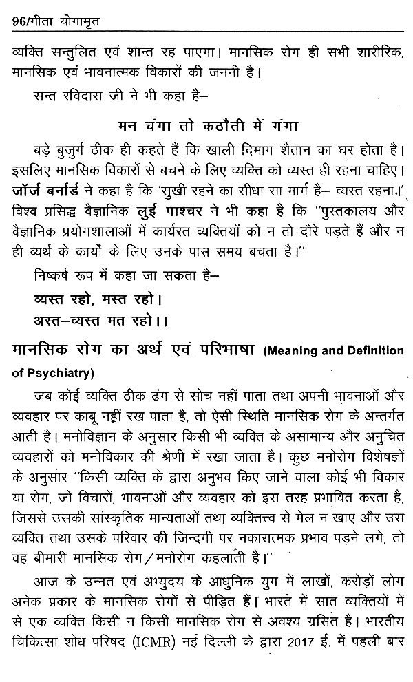 चौथे अध्याय में मानसिक रोगों के उपचार में गीता की भूमिका को बताया गया है। जिनमें मुख्य रूप से चिंता, तनाव, अवसाद, राग, द्वेष, लोभ, क्रोध, भय, अरुचि, अकर्मण्यता आदि मानसिक विकारों का परिचय और गीता द्वारा उनके निवारण का विस्तार से वर्णन किया गया है। ऊपर वर्णित सभी विकारों में गीता की शिक्षाएं कैसे हमारी सहायता करती है? इसे तथ्यों के साथ समझाने का सार्थक प्रयास किया गया है।