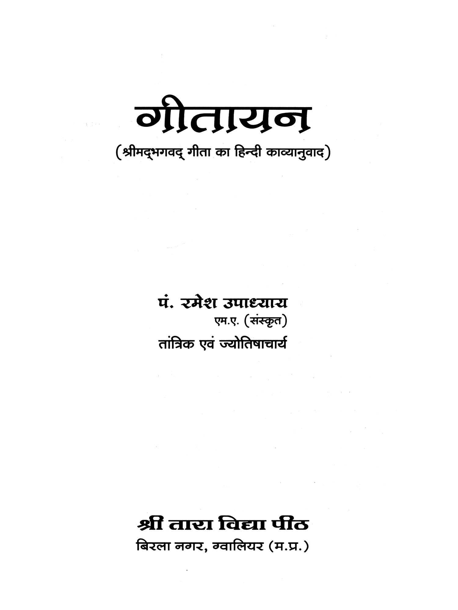 सद्‌गुरुदेव भगवान के श्रम सीकरों से लिखा गया यह "गीतायन" नामक पद्यानुवाद आज पुस्तक का रूप ले रहा है, इस बात की मुझे परम प्रसन्नता है। सहजता, सरलता, ऋजुता, सुगमता, स्वाभाविकता, तटस्थता, अपने सार्थक अनुप्रयोग एवं जन-मानस पर प्रभाव छोड़ने की दृष्टि से यह एक श्रेष्ठ काव्यानुवाद है। मुझे पूर्ण विश्वास है कि "गीतायन" अपनी गुणवत्ता, सकारात्मक परिणामोन्मुखता, भाषा की सुबोधगम्यता, शैली की प्रवाहपूर्णता, सरल छंदात्मकता, विषय की स्पष्टता, व्यापक अनुप्रयोगिता एवं कर्म की कुशलता के महनीय संदेश के कारण निश्चय ही न केवल जन सामान्य पर विशद प्रभाव छोड़ेगा, अपितु उसके लिये अधिकाधिक उपयोगी, प्रासंगिक और श्रेयष्कर भी सिद्ध हो सकेगा।
