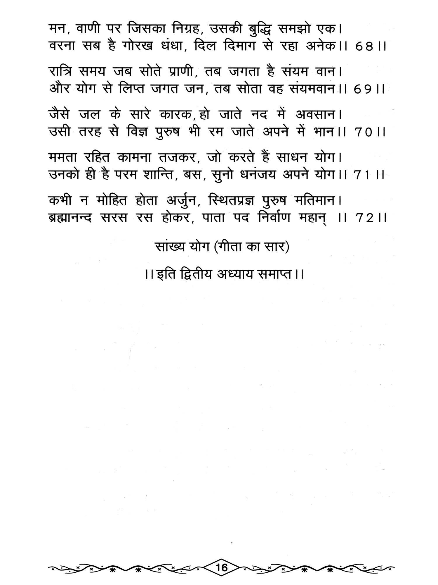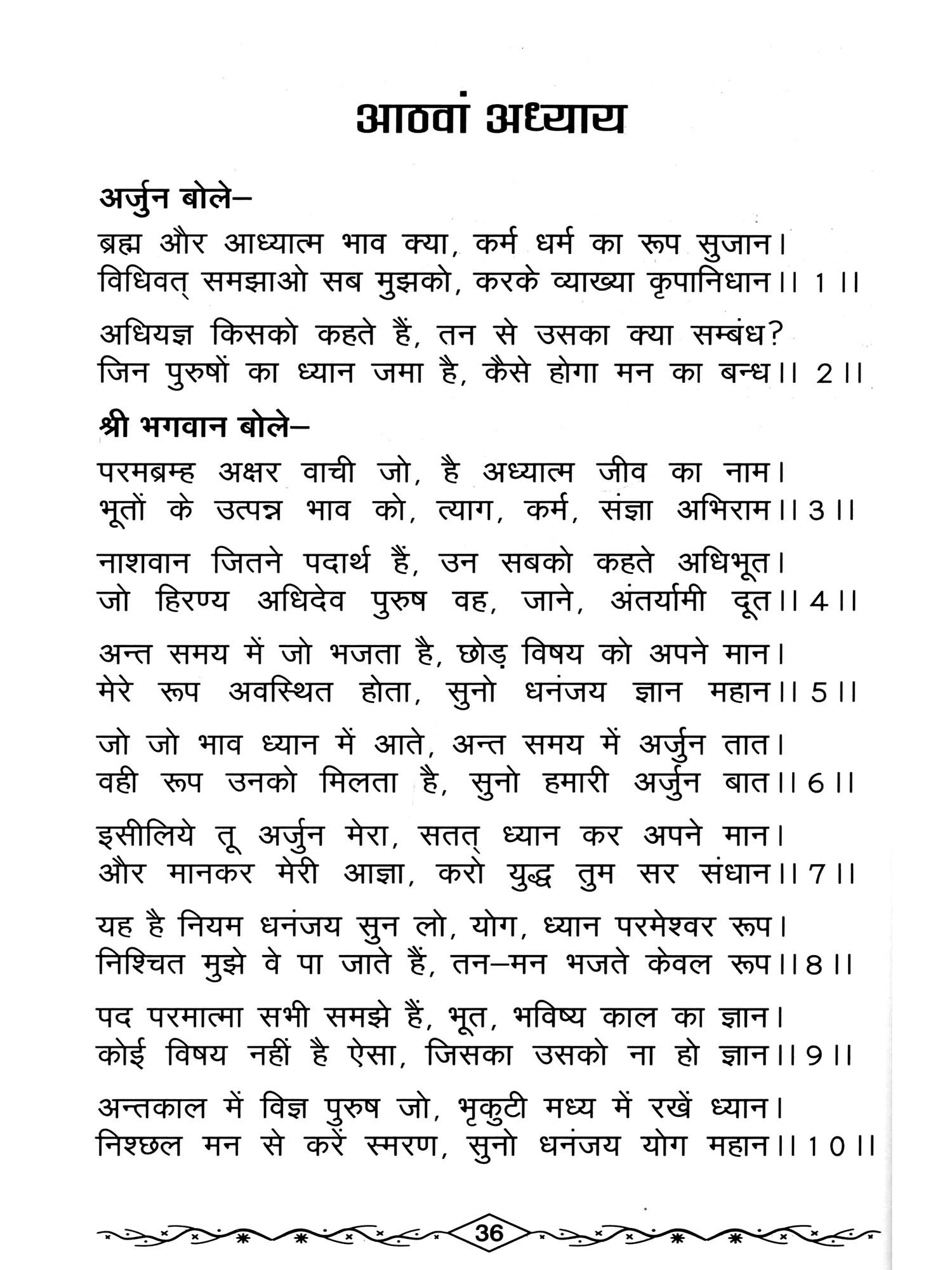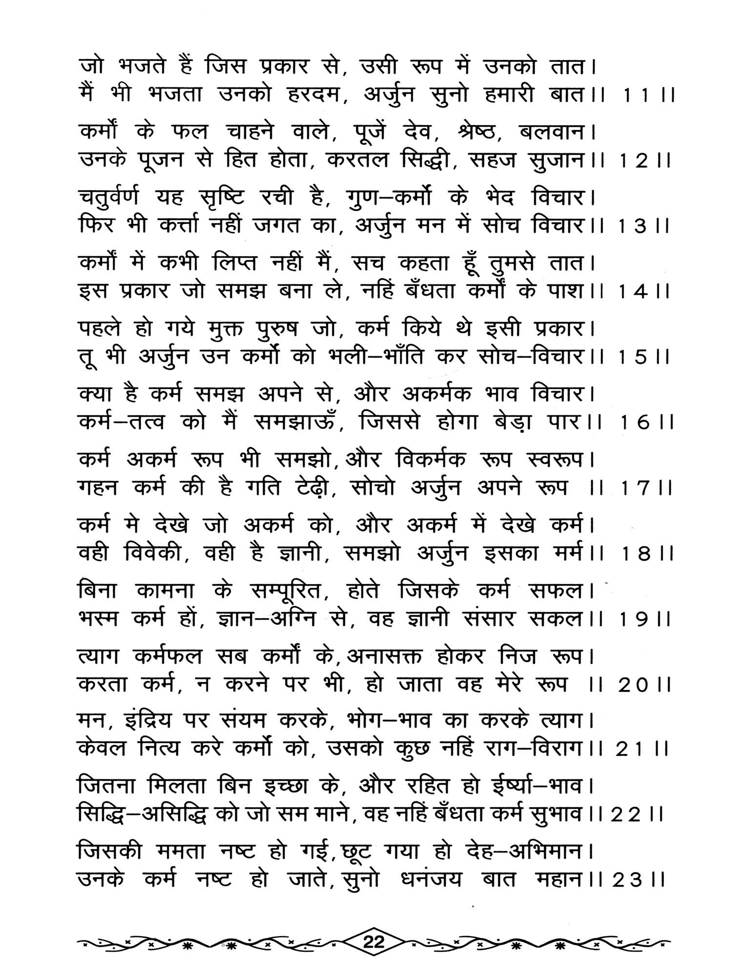 गीता की शिक्षाओं में रुचि रखने वाले आध्यात्मिक, धार्मिक एवं सामान्य पाठकों के मन पर इस पद्यानुवाद का व्यापक, सकारात्मक और स्थायी प्रभाव होगा। बहुत ही हर्ष का विषय है कि इस अनुवाद में मूल ग्रन्थ की आत्मा, भाव, अर्थ और संदेश सम्यक प्रकारेण सुरक्षित बन पड़ा है। इसके लिये प्रातः स्मरणीय मेरे सद्‌गुरुदेव ब्रह्मलीन उपाध्याय जी कोटि-कोटि बधाई के हकदार हैं। गुरु जी का समग्र जीवन गीता में वर्णित निष्काम कर्म, ज्ञान, वैराग्य, भक्ति, संन्यास, ध्यान योग, कर्तव्य पालन एवं परहित के लिए समर्पित रहा है। पूज्य गुरुदेव गीता जी की अग्रलिखित पंक्ति के जीवंत उदाहरण थे, जिसमें कहा गया है-