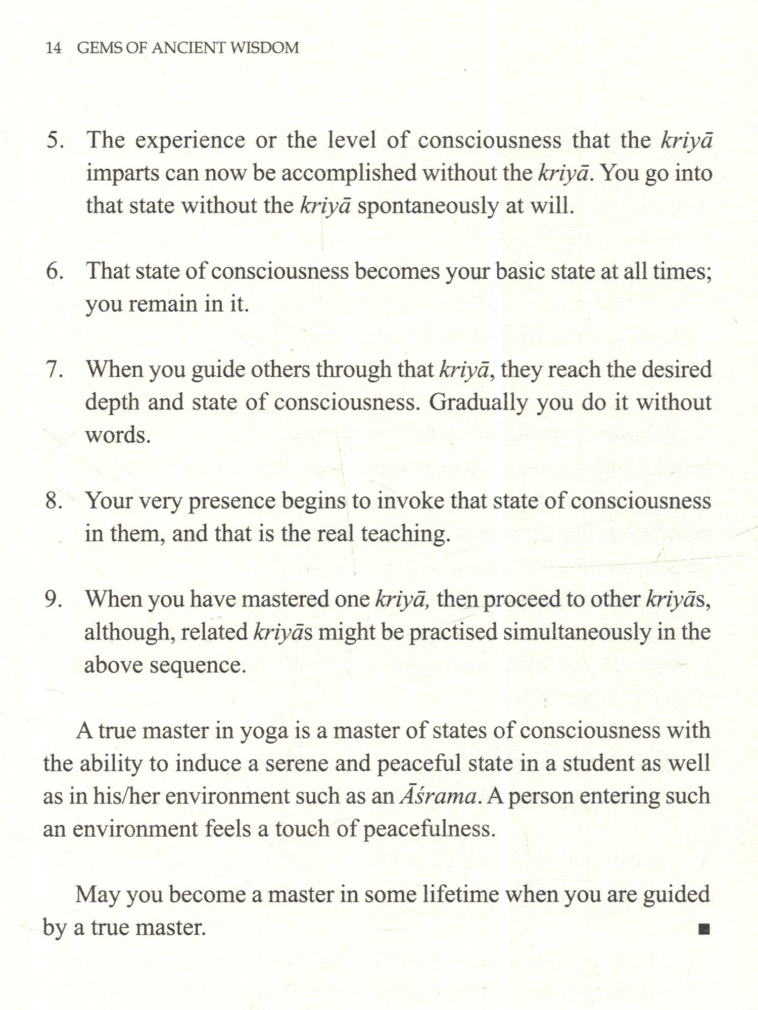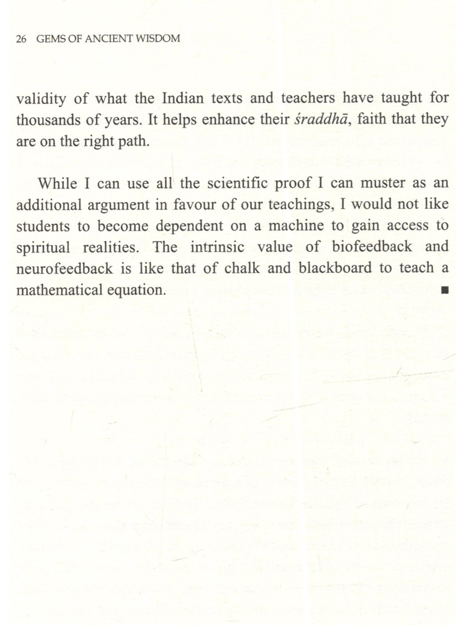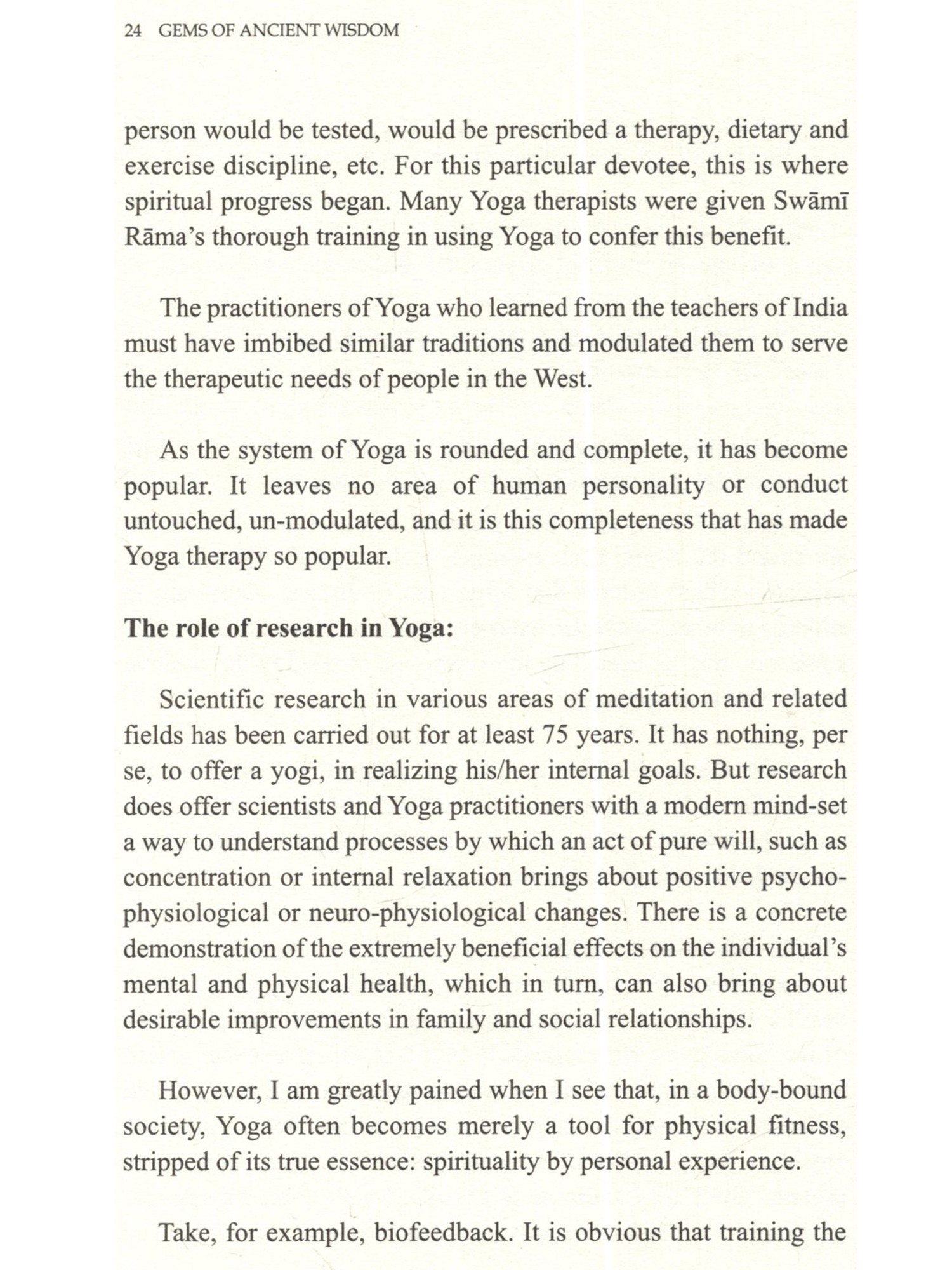 I gave you meditation, you give me contemplation These words of H.H. Swami Veda Bhärati have stayed with me after my first and last meeting with him. These words are truly "Gems of Wisdom" to guide me through my path of Yoga. H.H. Swami Veda Bharati was the master of Masters. I feel honoured and privileged to have met such a master in this lifetime. My meeting with Swami Veda was in many ways a unique experience. When I first met him, he communicated with me in Arabic and I was completely surprised to hear Arabic from an Indian Yogi. He asked me to sit for five minutes meditation with him. I sat with him and didn't realize that the guided meditation actually lasted for 45 minutes. Just after the meditation, he softly told me "You are my daughter". Hearing such sweet words transformed my innermost self and I was born again that day. The divine presence of Swamiji has moved something in me, in a way which is hard to express in words, but if I could, it would be like sleeping in heaven and waking up into my new self. I feel that I am still living with his protective presence around me and with me! I hope I am able to serve him and pass on his Gems of Wisdom to my students and fellow sādhakas. This is where I begin my contemplation! Although Swamiji is not with us physically, his words and wisdom presented in this volume will be a guiding force for many seekers on the path of Yoga and Meditation. The articles chosen for this volume are a few of his Gems of Wisdom, for many a source of inspiration in almost all aspects of one's practice, which he had so kindly offered to the world.
