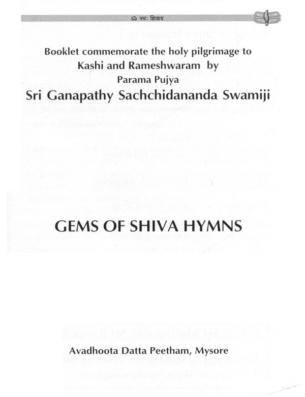 The visits to the pious places of Kashi and Rameshwara are really great. Moreover to make these trips along with the Sad guru is more meritorious. However, some people might not be able to undertake the tour due to some problem or the other. Hence to benefit them also with the merit of the pilgrimage, Sri Swamiji is making this gift of "Gems of Shiva Hymns" in the form of this small book. We wish that all the devotees add these hymns also to their daily prayers and rituals and gain spiritual bliss. We prostrate to the lotus feet of Sri Gurudeva who always works hard and yearns for the welfare of the Universe.