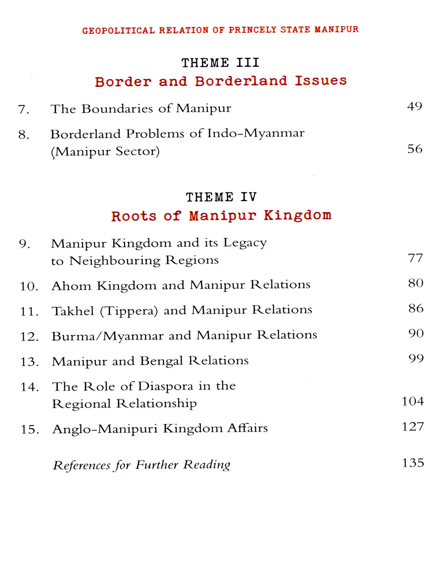The objective of this work is to provide a comprehensive analysis of the geopolitical factors that influenced Manipur's external relations during various historical periods, from its ancient connections to Burma (Myanmar), the Ahom Kingdom (Assam), the Kingdom of Takhel (Tripura), and other entities in the region, to its interactions with British colonial forces. By examining archival materials, historical documents, royal chronicles, and oral traditions, this book seeks to uncover the ways in which Manipur navigated the complex political landscape of its time. Through these complex geopolitical dynamics, Manipur emerged as an independent Princely State and maintained its cultural civilisation for more than 2000 years.