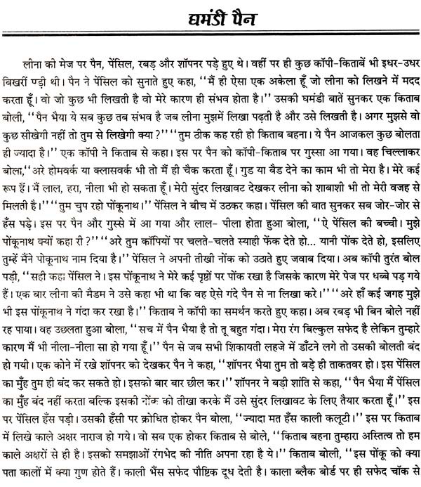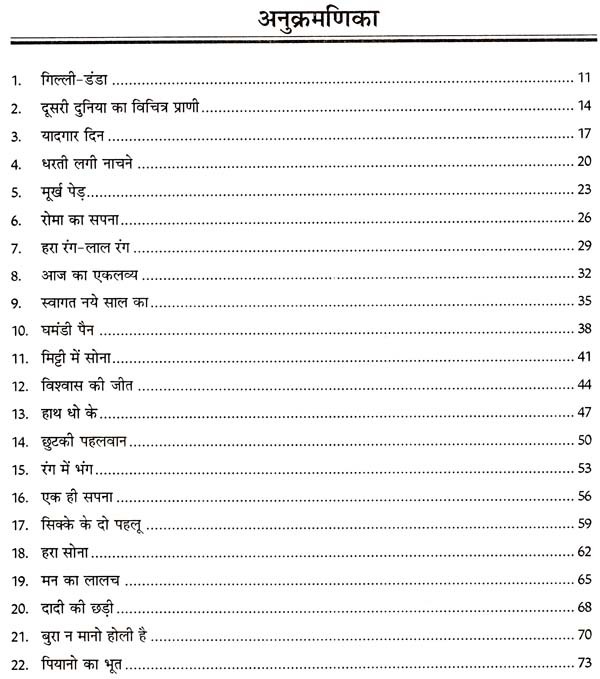 अब बातचीत को 27 कहानियों की भूमिका के लिये उपलब्ध स्थान को देखें तो सारी कहानियों का यहाँ जिक्र संभव नहीं है। फिर भी कहानी 'मूर्ख पेड़', पियानों का भूत, एक ही सपना, अद्भुत खिलौने, मुन्ना भाई, नौकायन प्रतियोगिता, कैसा रहा ड्रामा, मिट्टी के दीये आदि ने आकर्षित किया है। मूर्ख पेड़ में सीख है कि अपनी मजबूती या बड़े होने का घमंड नहीं करना चाहिए। जिस तरह हमारे शरीर के हरेक अंग का महत्व होता है, पेड़ के हर टहनी-पत्ते का महत्व होता है, उसी तरह समाज, देश में सबका अपना-अपना महत्व होता है, सबकी जरूरत होती है।