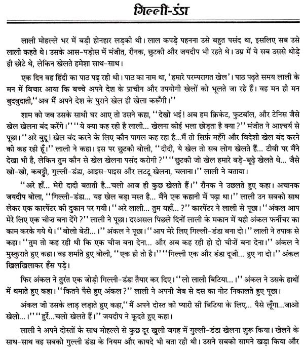 संग्रह की पहली कहानी है 'गिल्ली डंडा'। कहानी में कई संदेश हैं। सबसे पहला तो यही कि हमें महँगे और बनावटी खेलों की बजाय हमारे यहाँ के परंपरागत खेल खेलने में रुचि लेनी चाहिए। एक बच्ची 'लाली' ने यही निर्णय किया। खुशी की बात यह है कि किसी बच्चे ने उसकी बात का विरोध नहीं किया। सारे बच्चे 'गिल्ली डंडा' खेलने के लिये तैयार हो गये। खेल-खेल में बच्चे समाज और देश की सुरक्षा करने तक पहुँच गये निःसंदेह परम्पराओं का पालन लाभप्रद होता है।