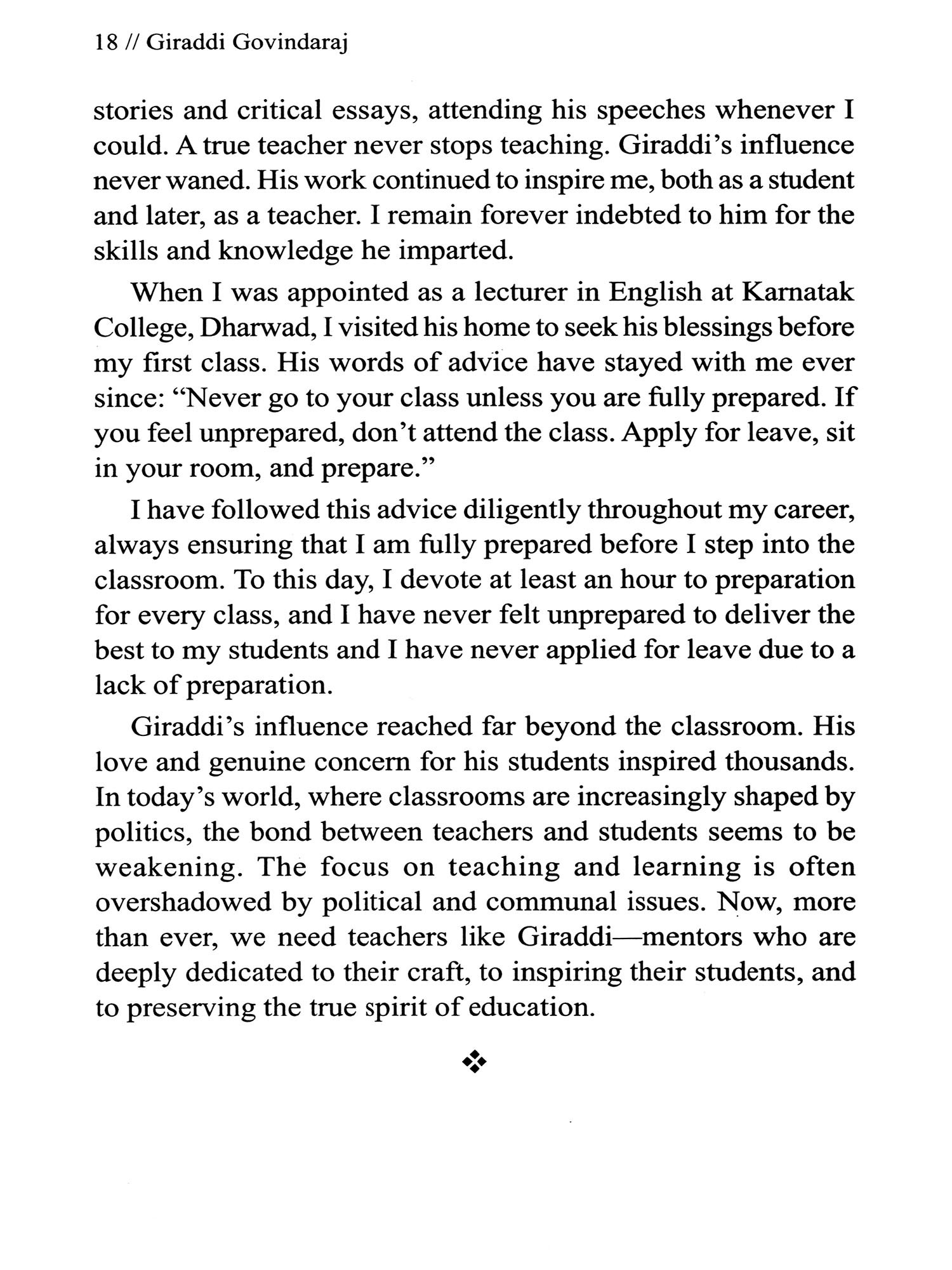 Giraddi Govindaraj, a prominent Kannada critic, short story writer, essayist, translator, and thinker, was my favourite writer and teacher. He taught me literature and language at the Department of English, Karnatak University, Dharwad. He was my role model as a teacher, and I was one of his students who never wished to miss his classes. He was an ideal classroom teacher. Listening to his lectures was like listening to classical music.