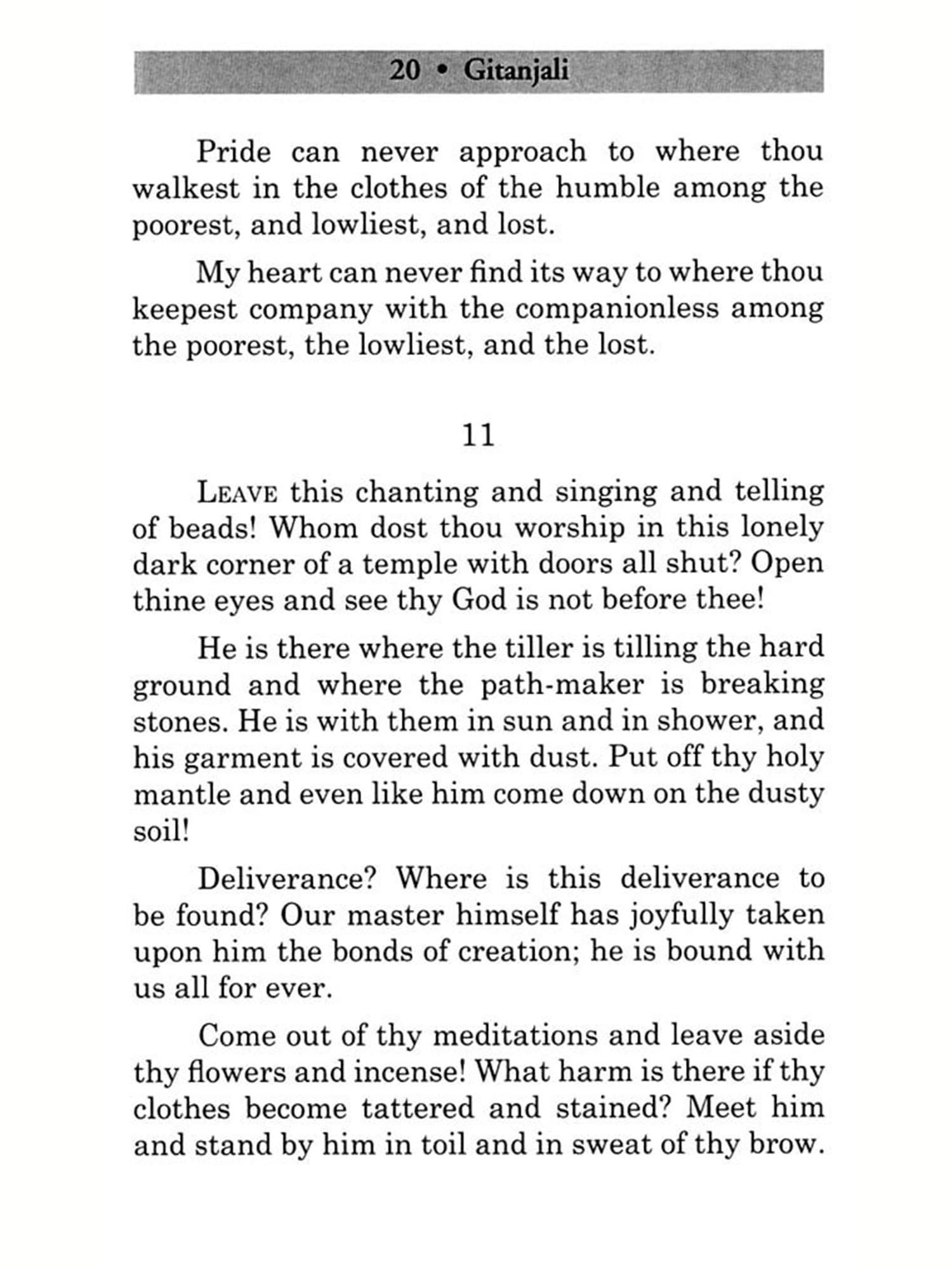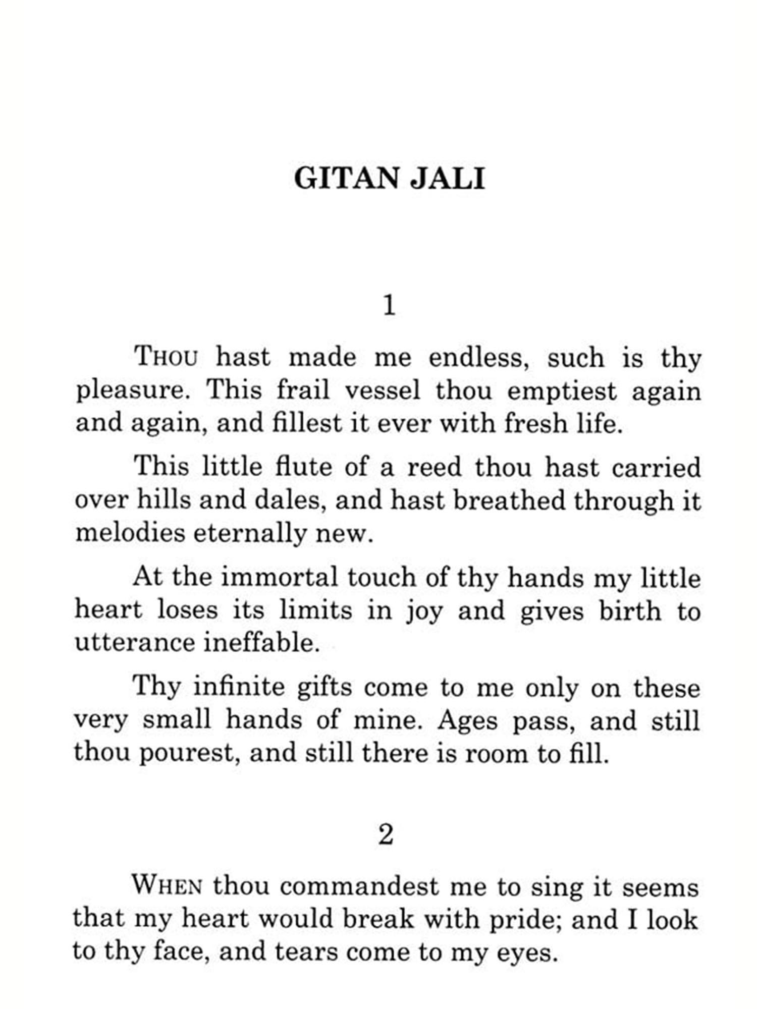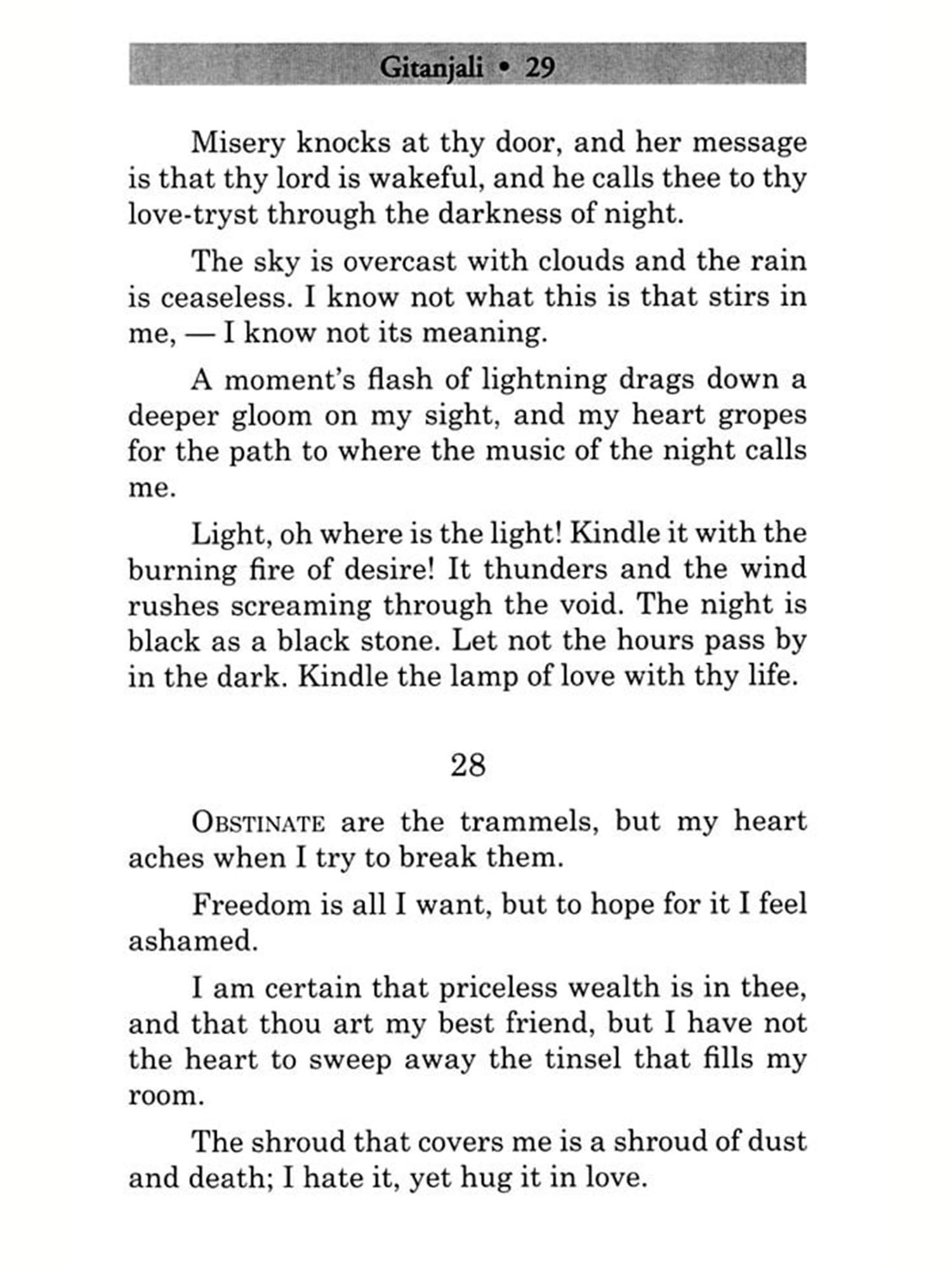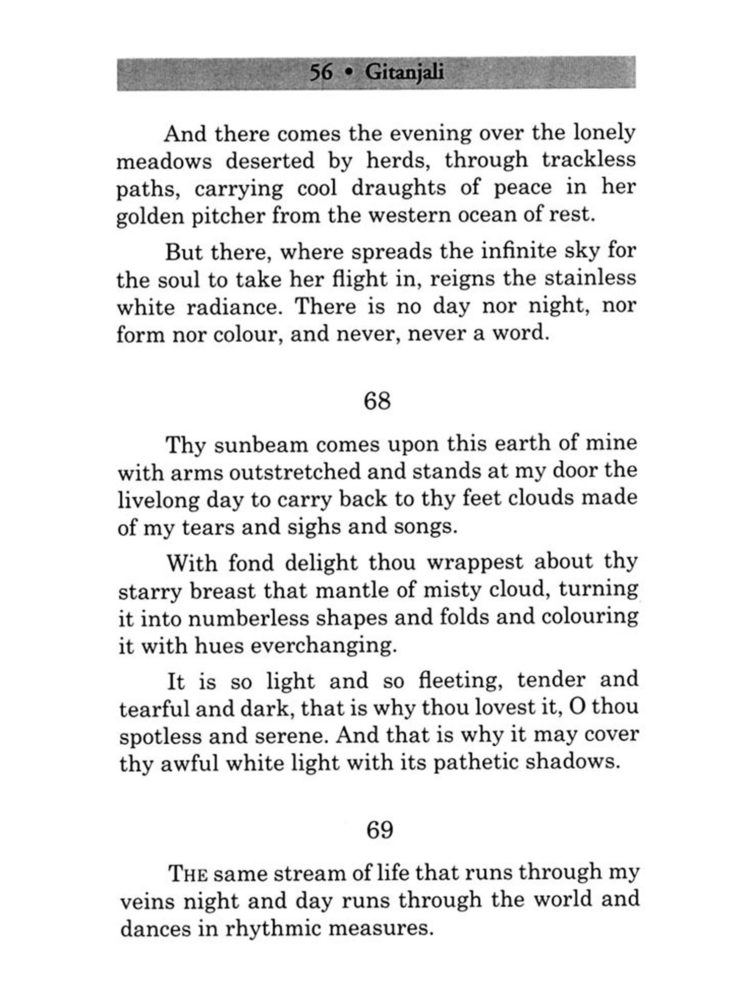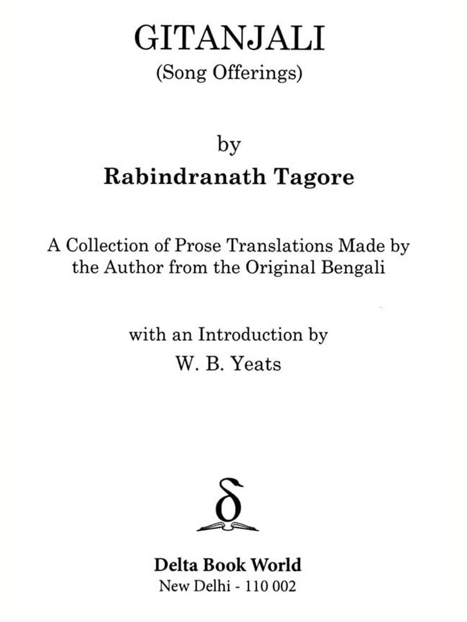 Gitanjali is a collection of 103 English prose poems which are Tagore's own English translations of his Bengali poems. This book contains 53 poems from the original Bengali as well as 50 other poems extracted from Tagore's Achalayatana, Gitimalya, Naivadya, Kheya, and more.