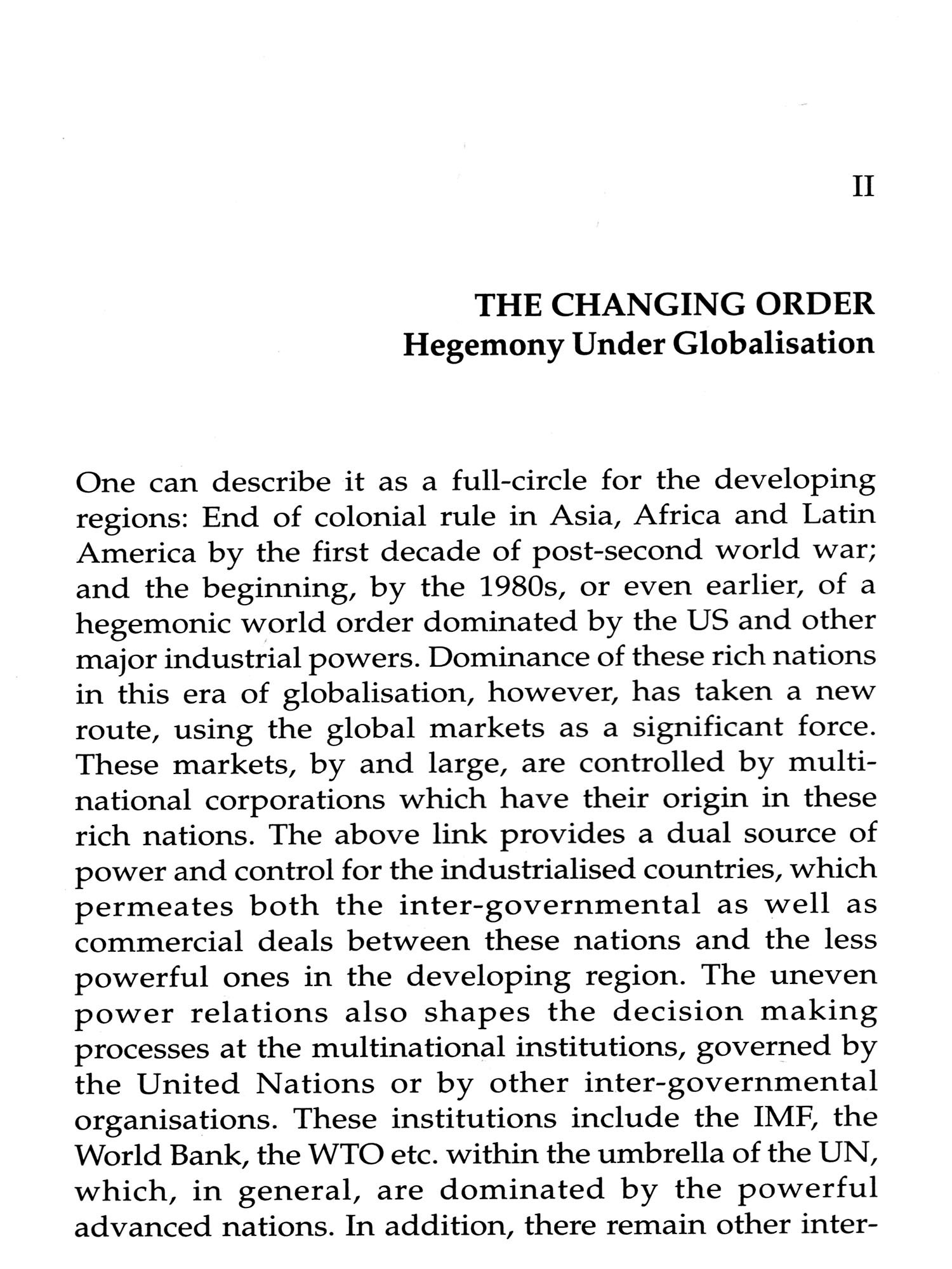 First, globalisation today is far removed from similar processes, which prevailed in the past. It has been a qualitative change for society, economy, institutions and world order which has generated a threetier structure of society consisting of the elites, the well-to-do middle class and the marginalised. The divide cuts across nations, while re-structuring the role, the power, as well as authority of nation states in their new incarnation. However, it can not be denied that global integration, a connecting process for different parts of the world, dates back to centuries of conquests, slavery, indentured labour, migration, colonization, communication, trade and capital flows. One can identify today a new pattern in these manifestations. Globalisation today is not only over-encompassing (as compared to the past) but also is responsible for generating disparity, discontent, concerns and the dissenting voices raised from the angle of the well-being, or even survival, of a large mass of people. These protests do not go un-noticed, unlike what it used to be in the days of formal domination and colonial rule in the past, when such dissents could not be in the public domain.