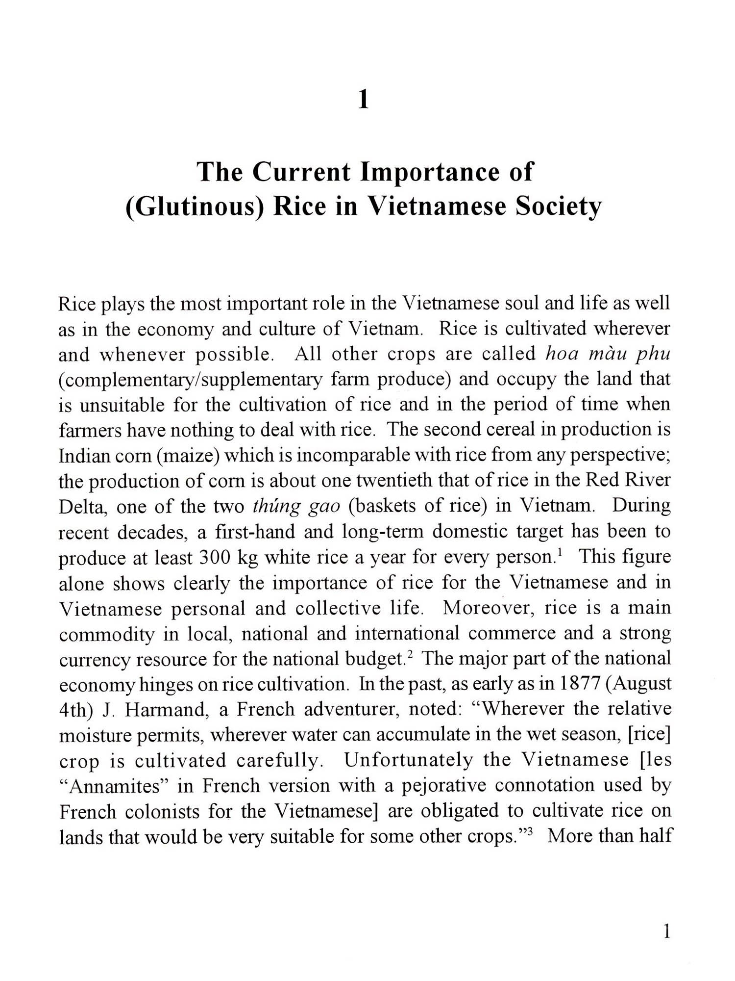 Vietnam, my beloved motherland, is situated on the eastern coast of the Indochinese peninsula, i.e. on the Pacific Rim at the cross-roads between China and West and East and between the two famous civilizations India. This specific geographical position has made Vietnam a center of attraction for various material, spiritual and ideological tendencies. Vietnam, in her turn, actively contributed her particularities to the development of these civilizations. As a result, the daily life, of which two most crucial components are the eating and speaking, is a condensed representation of all these tendencies' dimensions. On the other hand, Vietnam is traditionally a rice-growing country and a great deal of archaeological, ethnological, linguistic and botanical evidence as well as of folklore indicates that rice was domesticated locally. The inhabitants of Hòa Bình culture (circa 10,000 BP) living in caves and gath-ering cereals, probably including rice, used grinding stones to husk (appar-ently wild) rice. In the Phùng Nguyên and Dông Dâu cultures (in the second millennium BC), when people left their caves and settled in hilly regions, rice was cultivated in muddy valleys with the practice hoa canh thuy nâu (clearing soils by firing, and weeding fields by submersion [be-fore seeding]). And from then on, rice was and is by far, the staple food for the Vietnamese. A well-known saying captures the essence of our concept of food ideology: Có thuc mói vuc duoc Dao (to eat is to practice the Way [= the Great Cause]) and "to eat" for the Vietnamese is "to eat rice". In Vietnamese, an com (literally, to eat rice) means simply "to take a meal", which consists in fact of rice and rice products. Therefore, rice penetrates deeply and largely into all other aspects of day-to-day life - in folklore, literature, arts and social sciences as well Among the various kinds of rice, glutinous rice plays an important and extraordinary role in Vietnamese life. I felt it by instinct a half century ago, when I was amazed in a cold winter evening near a hearth at a stilted dwelling, to hear the Thai legend about the conversion of opaque (gluti-nous) rice into transparent (ordinary) rice (this legend is inserted in 3. Glu-tinous Rice in Evolution). The Thai popular conviction directed my mind since that time on. However, research at that time did not pay much attention to glutinous rice, although it still occupies an important place in the diet of some ethnic groups and has been retained in all ritual and religious ceremonies of a majority of the Kinh population. Its main and splendid parts were lost already under a lot of layers of the dust of time but, as a Chinese proverb emphasizes, When the rites were lost, they could be found again through the people of the countryside. And one of the characteristics of the Vietnamese people of the countryside is their poem-loving mentality; the finest essence of their spirit, in all their ups-and-downs, concentrates on numerous rhythmical lullabies, ballads, sayings, proverbs, folksongs, and even folktales... ture,.... In this context, to study rice the eating through folklore, litera-both written and oral language is to tackle the material and even spiritual life's core of the Vietnamese. It is interesting to identify a peculiarity of Vietnamese: for centuries, the official written language was the Chu Nho or Chu Hán, inaccessible to most of the common Vietnam-ese, i.e. a language for a handful of elite and for communication with the mandarinate.