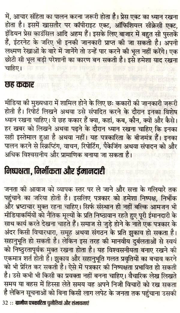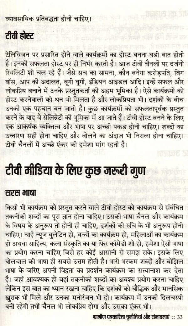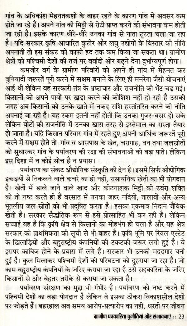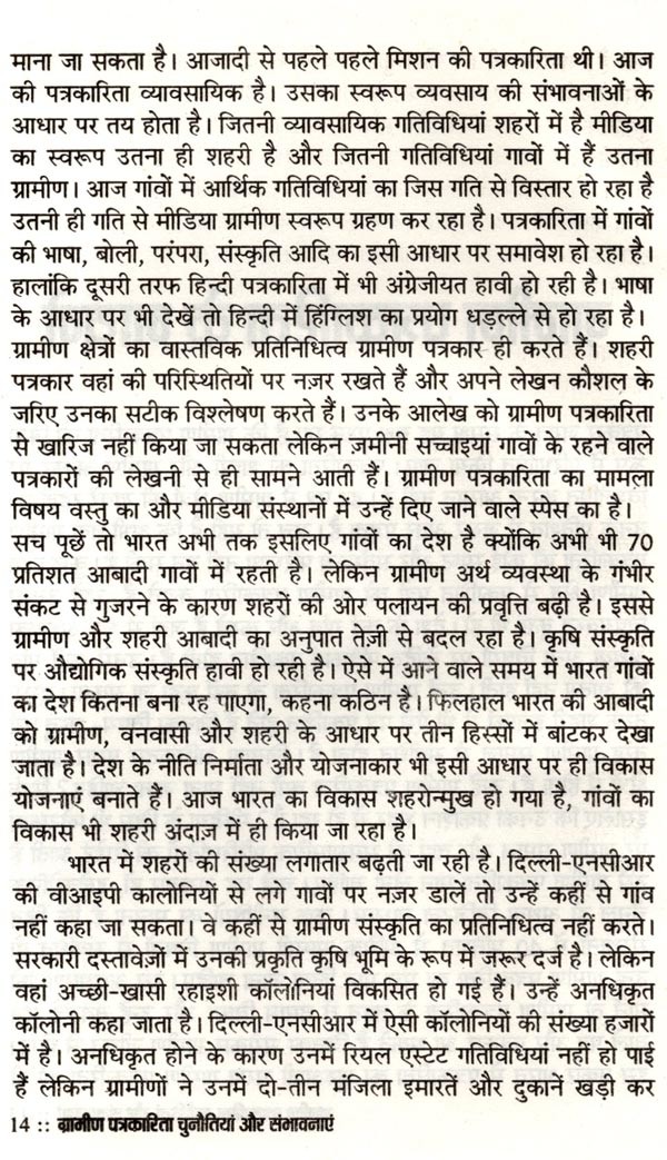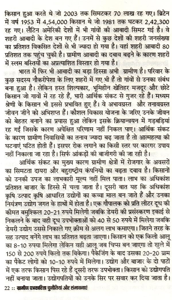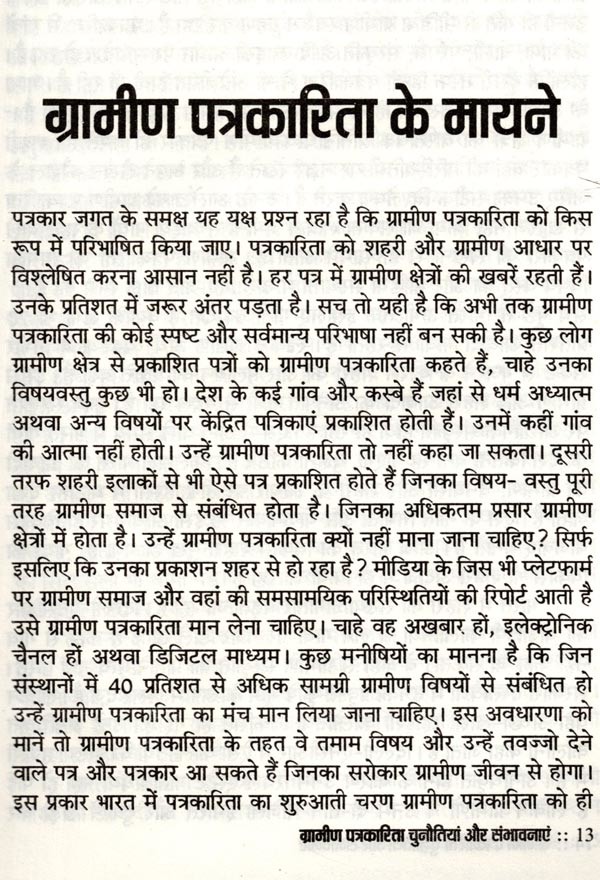 ग्रामीण पत्रकारिता चुनौतियां और संभावनाएं भारत को गाँवों का देश कहा जाता है। आबादी का 70 प्रतिशत हिस्सा अभी भी गाँवों में रहता है। उसकी आजीविका का साधन कृषि और उस पर आधारित उद्योग हैं। लेकिन विडम्बना यह है कि आज़ादी के सात दशक बीत जाने पर भी यह राजनीतिक मुद्दा ही बना रह गया। प्रशासनिक स्तर पर विकास के केन्द्र में कभी ग्रामीण भारत नहीं आ पाया। विकास का प्रवाह शहरोन्मुखी ही रहा। 70 प्रतिशत आबादी की उपेक्षा कर भारत को समृद्ध बनाने का दिवास्वप्न देखा जाता रहा। देश में कहीं भी गाँव को शहर नहीं बनाया गया बल्कि शहर की गाँवों में घुसपैठ कराई जाती रही। बात सिर्फ बुनियादी सुविधाओं की नहीं, संस्कृति की है। हिन्दी और भाषाई पत्रकारिता भी काफ़ी हद तक शहरोन्मुखी रही है। लेकिन हाल के वर्षों में भारत के ग्रामीण समाज में एक तरफ नवसाक्षर वर्ग उभरा है तो दूसरी तरफ बेहतर क्रयशक्ति से लैस नव उपभोक्ता वर्ग भी सामने आया है। मीडिया इस नये पाठक वर्ग तक पहुँचने को लालायित है और कार्पोरेट कम्पनियाँ नये उपभोक्ता वर्ग तक अपनी पहुँच बनाने को ग्रामीण हाट तक पहुँचने को बेकरार हैं। इसके कारण ग्रामीण पत्रकारिता को एक नयी ऊर्जा प्राप्त हुई है। ग्रामीण पत्रकारों को मीडिया संस्थानों में स्पेस मिलने लगा है। वरिष्ठ पत्रकार सुशील भारती ने ग्रामीण भारत को करीब से देखा है और उनके अन्दर हो रहे परिवर्तनों को समझने की निरन्तर चेष्टा की है। उनका मानना है कि आनेवाला समय ग्रामीण पत्रकारिता का है। वह समय दूर नहीं जब गाँवों-क़स्बों से समाचार पत्रों के संस्करण प्रकाशित होंगे और ग्रामीण पत्रकारों के लिए पत्रकारिता आजीविका का भरोसेमन्द साधन बन जायेगी। इस पुस्तक में उन्होंने ग्रामीण भारत में होनेवाले बदलावों की चर्चा के साथ पत्रकारों को उनकी भावी भूमिका के लिए तैयार होने के गुर भी बताये हैं। पत्रकारिता के क्षेत्र में सक्रिय और इसमें रुचि रखने वाले लोगों के लिए यह एक उपयोगी पुस्तक हो सकती है। वैसे भी ग्रामीण पत्रकारिता पर केन्द्रित पुस्तक का अभी अभाव है। इस लिहाज से इस पुस्तक को अवश्य पढ़ा जाना चाहिए।