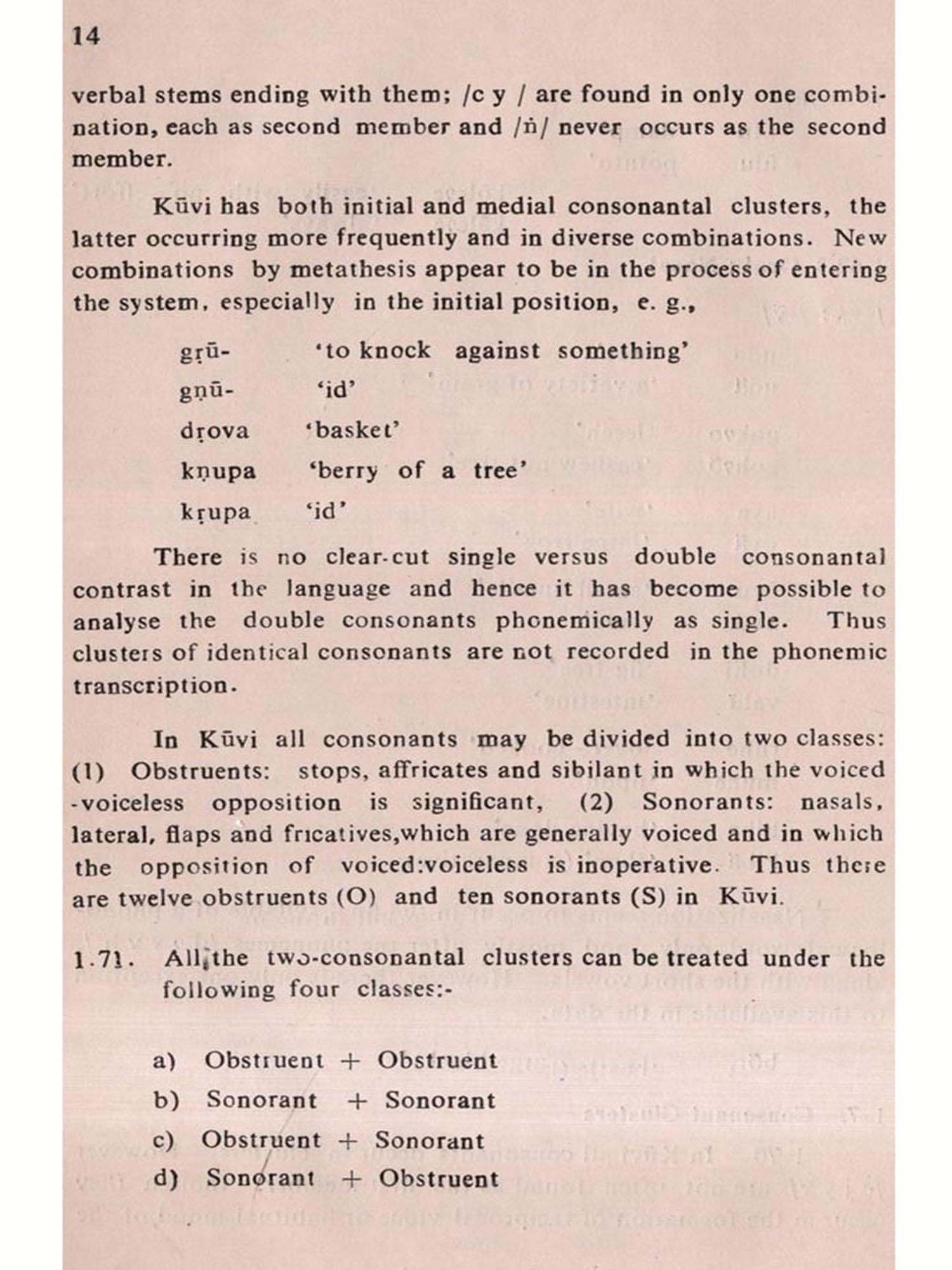 I welcome this opportunity of expressing my sense of deep indebtedness to the Rev. lan Kleinig and Mrs. Enid Kleinig an Australian missionary couple, stationed in Jeypore from 1966 to 1974, for their work among the Konds of Koraput District. They not only undertook the responsibility of my hospitality during my field trips, but also generously placed at my disposal the whole of their valuable collection of Kuvi words based on their language study mainly concentrated on the Kond villages in the Deomali and Meyamali hills.