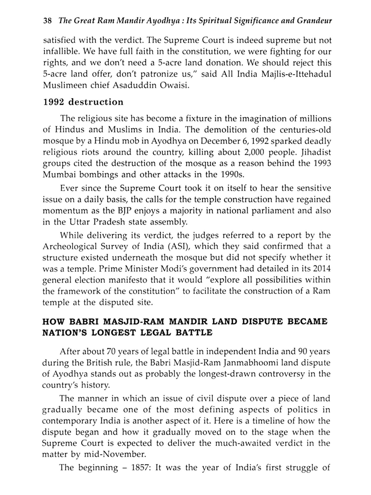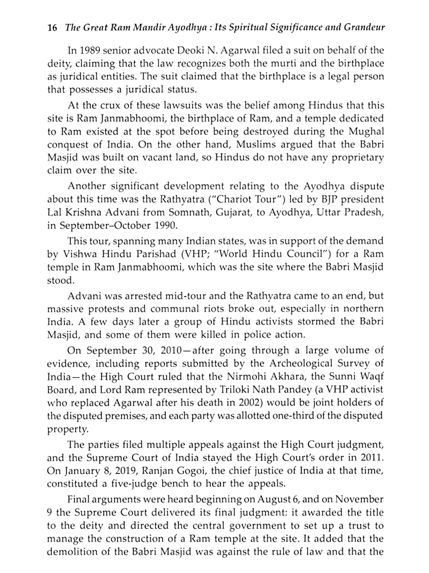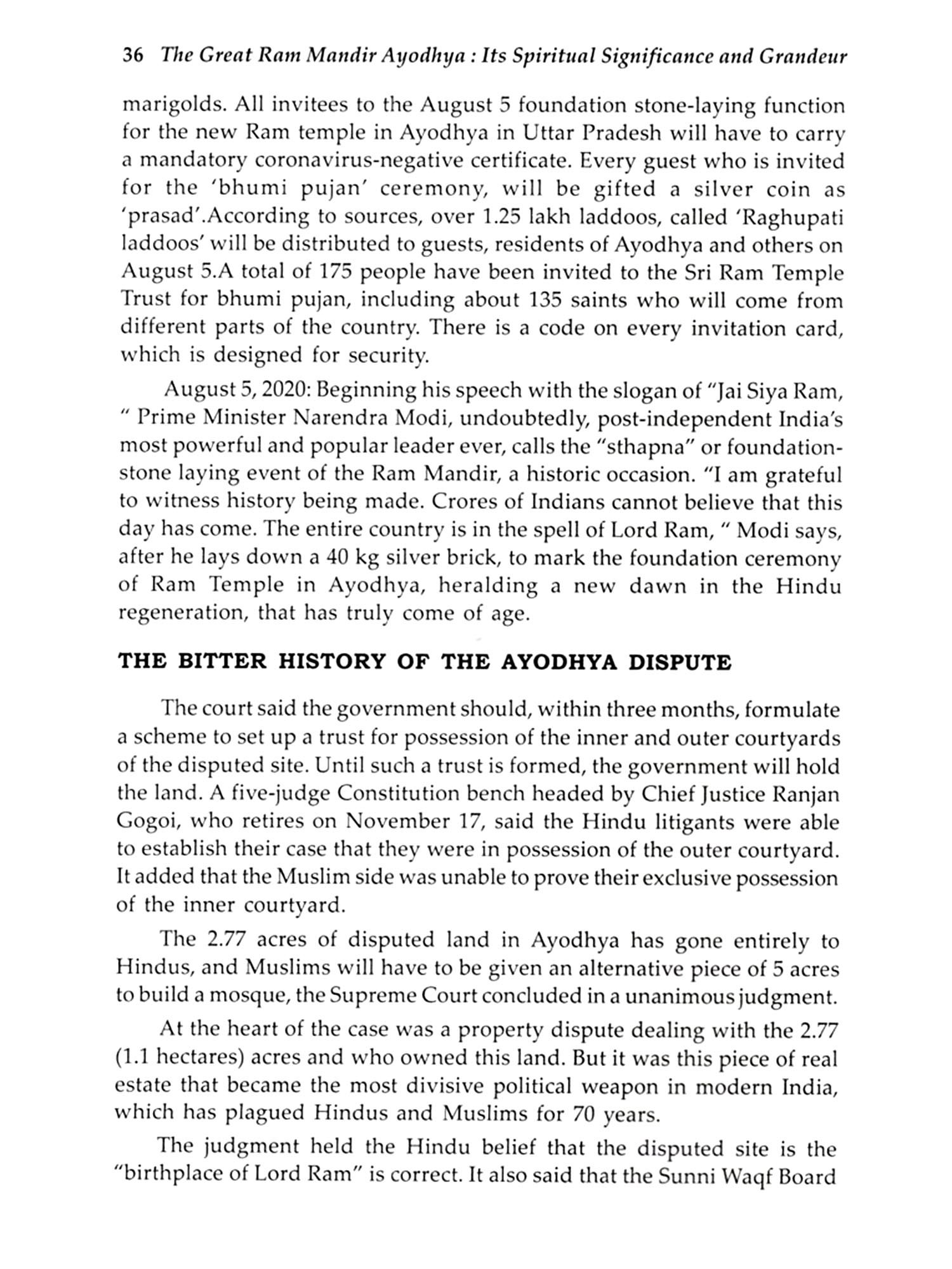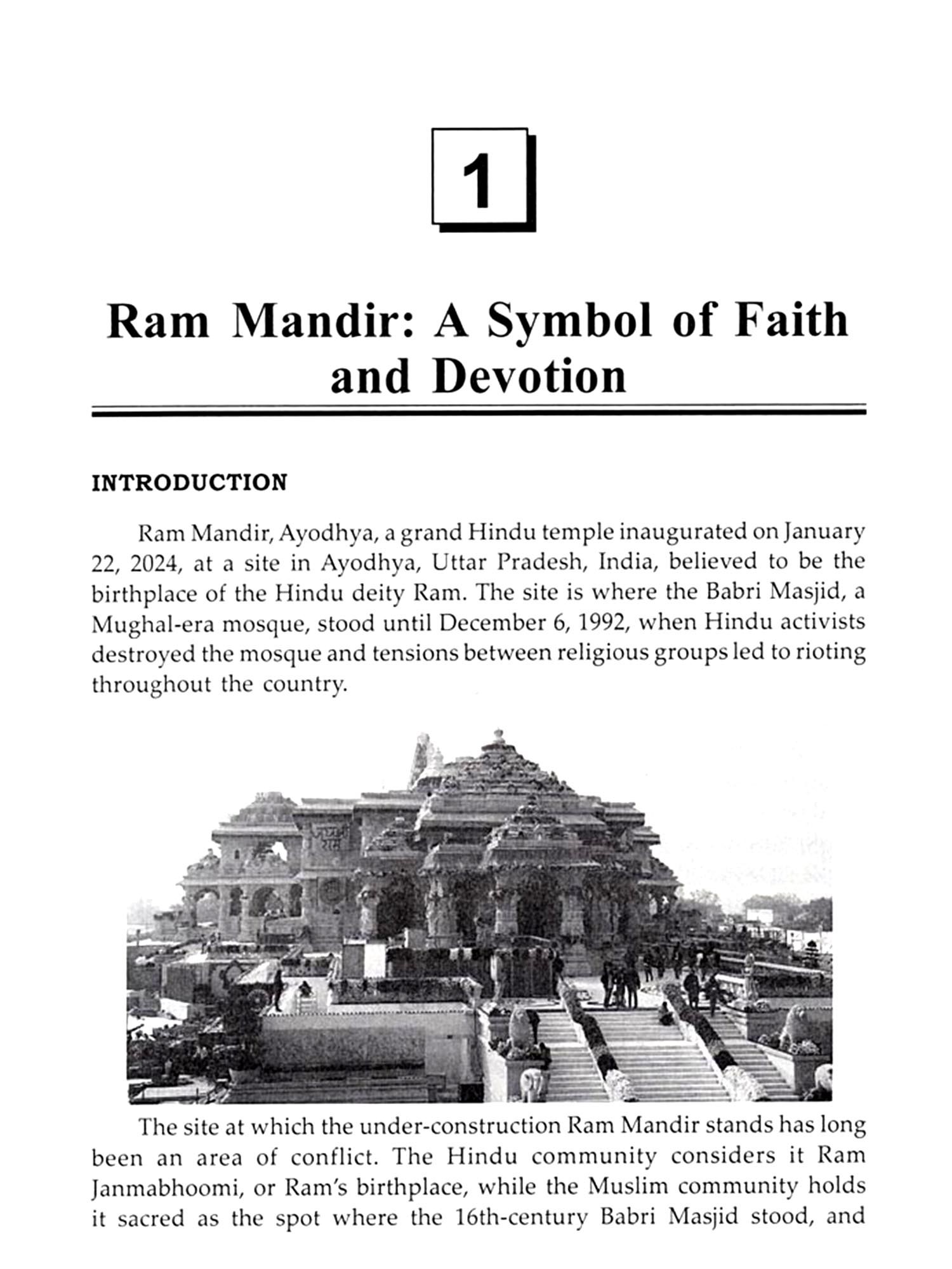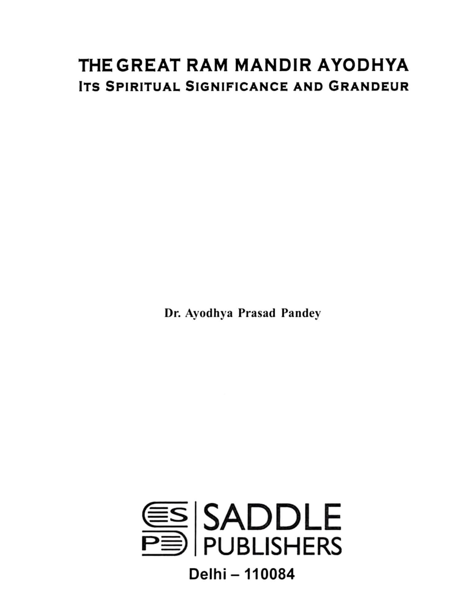 The Ram Mandir in Ayodhya holds immense spiritual, historical, and cultural significance for millions of Hindus worldwide. Located in the city of Ayodhya, Uttar Pradesh, this temple is dedicated to Lord Rama, the revered deity and hero of the ancient Indian epic, the Ramayana. Ayodhya is believed to be the birthplace of Lord Rama, making the site one of the most sacred places in Hinduism. The construction of the grand Ram Mandir is a symbol of faith, unity, and revival of cultural heritage. After years of legal and political struggles, the temple's construction began in 2020, marking the fulfilment of a long-awaited dream for devotees. The temple, designed with intricate architecture, is expected to be a masterpiece, combining traditional Indian architectural styles with modern elements. Beyond its architectural magnificence, the Ram Mandir is a beacon of spiritual significance. It represents the victory of dharma (righteousness) over adharma (unrighteousness), as depicted in Lord Rama's life and his triumph over the demon king Ravana. The temple is set to be a centre of pilgrimage and devotion, attracting millions who seek spiritual solace and blessings. The completion of the Ram Mandir will undoubtedly elevate the spiritual landscape of India and resonate deeply with the values of unity and devotion. This book explores the spiritual significance, history, and architectural grandeur of the Great Ram Mandir in Ayodhya, highlighting its deep cultural and religious importance.