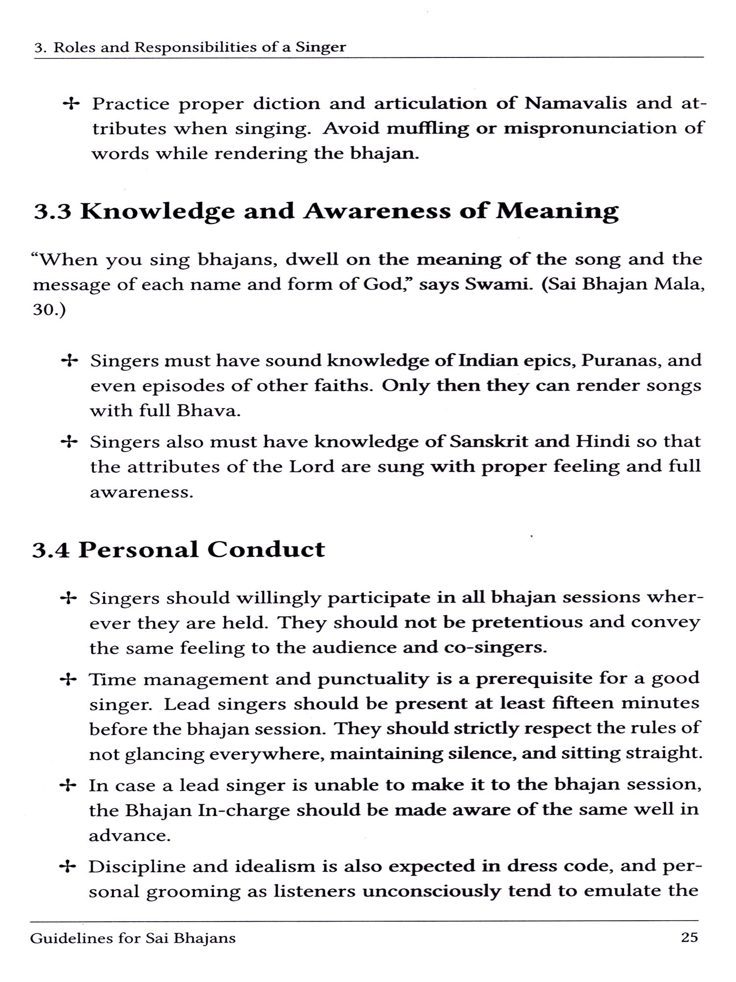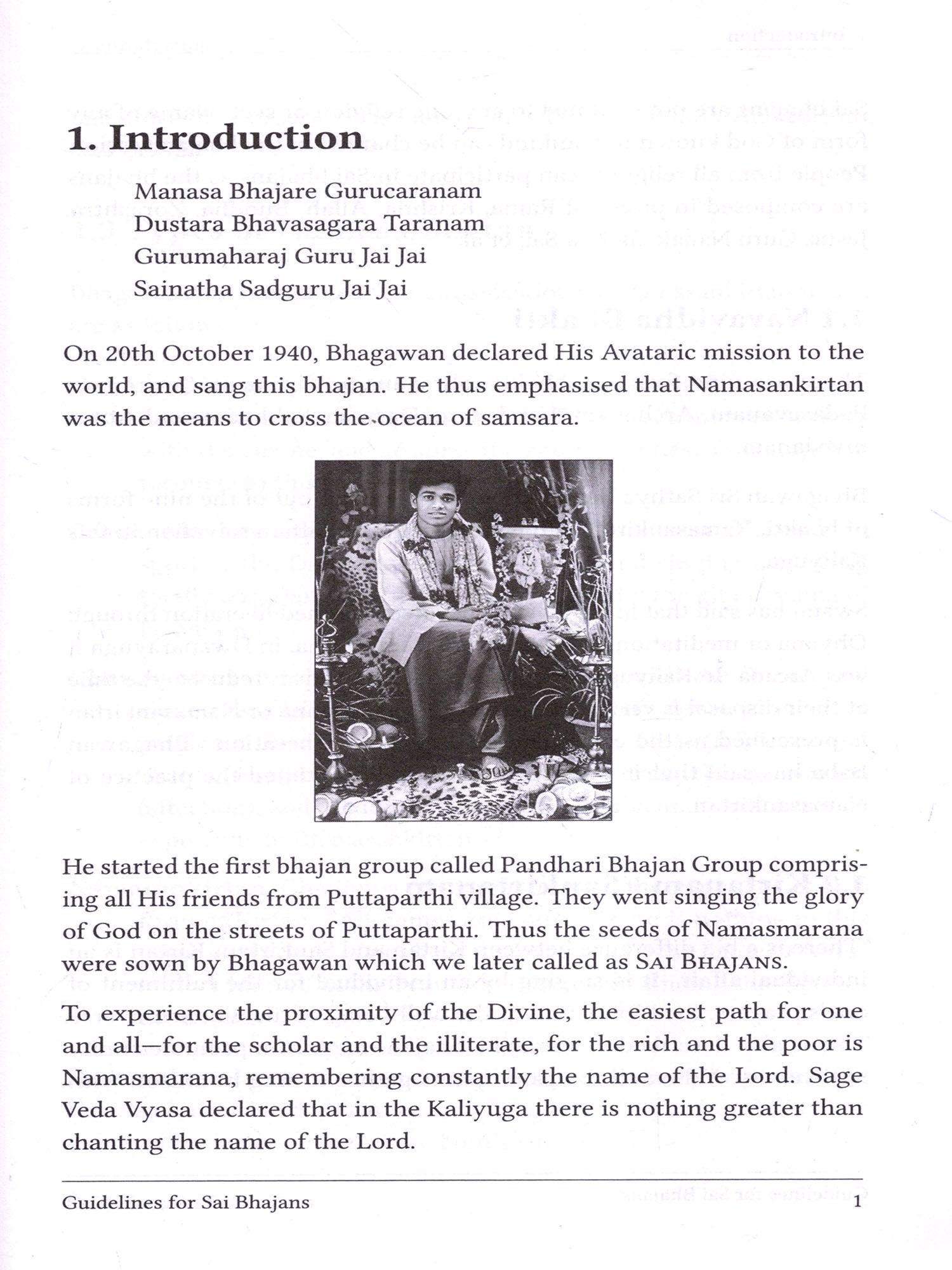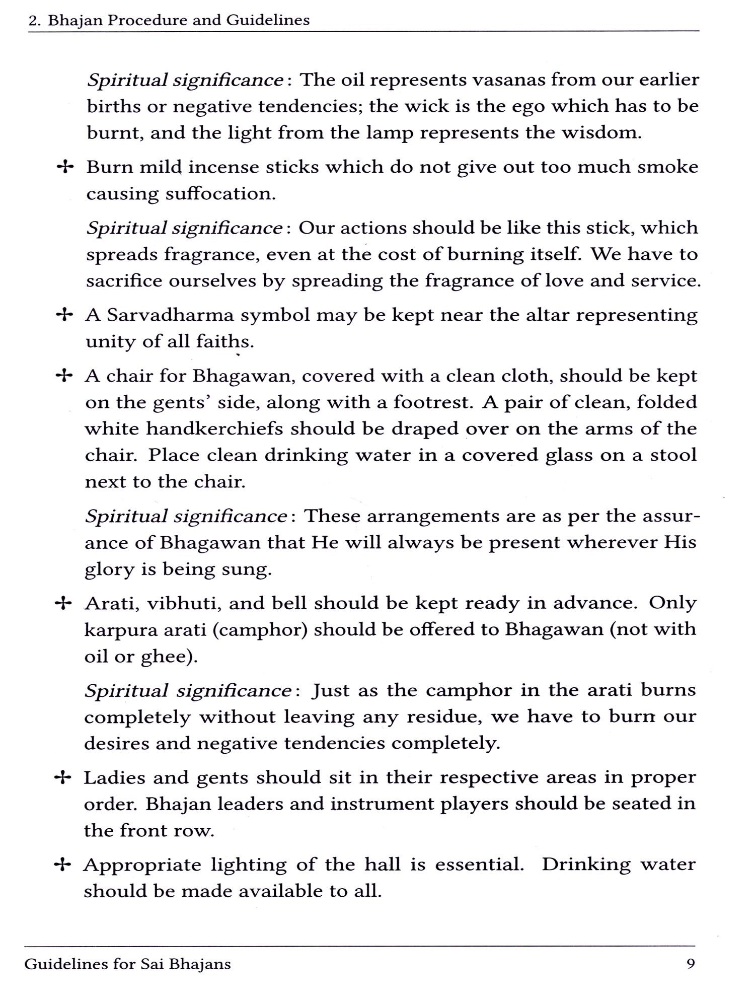 It is therefore necessary that there is uniformity in the Sai bhajan sessions everywhere with observance of proper discipline and dedication. It is with this objective that this guide has been prepared to enable the proper conduct of bhajans at all Sai Bhajan Mandalis and the Sathsangs.