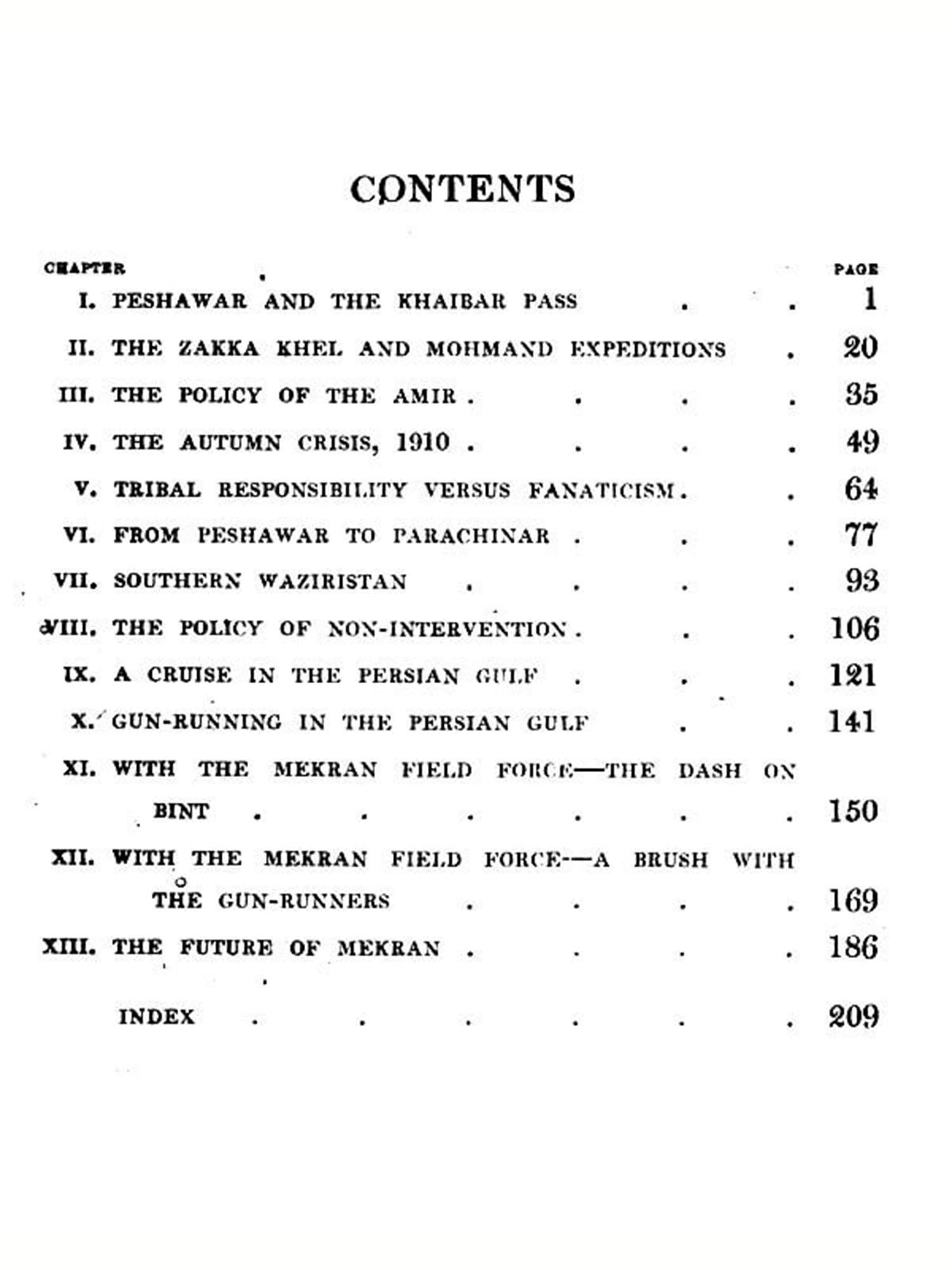 The interest of the British public had been centred on the internal problems of the Indian Empire, and chiefly those connected with the Hindu portion of the population. As a result of the alarming wave of sedition that swept over Bengal, accompanied by Brahmanical revivals in the two Presidencies, the affairs of the North-West Frontier, together with the problems connected with the Mahommedan subjects of the King-Emperor, had gradually been relegated to a hazardous obscurity. and had not received the attention they deserved. The crisis on the frontier in the autumn of 1910, as a direct result of the suppression of the arms traffic in the Persian Gulf, had the effect of switching tha limelight once again on to this most interesting quarter. People were at last beginning to realize that if the arming of the Pathan belt continued a frontier rising in the future would be an affair of infinitely more gravity than theretofore. But in spite of this the operations of the blockading squadron in the Persian Gulf were not sufficiently recognized as an integral part of frontier policy, and had attracted attention more from the hazardous nature of the undertaking than from any bearing that the ultimate suppression of the traffic might have on the tranquillity of the frontier. It was with this object., namely, of emphasizing the connection between the operations of the blockading squadron and the preservation of peace on the Pathan border, that the author ventured on the publication of this book. Though the book hardly brings the history of the frontier comprehensively and updated, it had proved to be of vital significance due to dearth of literature on the subject.