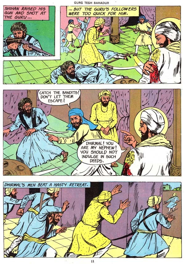 Tegh Bahadur became the Guru of the Sikhs at a time when the Mughal Emperor, Aurangzeb's policy of religious intolerance and persecution had antagonised a vast section of his subjects. The Satnamis rebelled in the Punjab. These rebellions were mercilessly crushed. But in the Deccan, Shivaji's power continued to be in the ascendent and in 1674, he proclaimed himself king. This made Aurangzeb all the more ruthless in his religious persecution. Denied the freedom to follow their faith, the Hindus of Kashmir approached Guru Tegh Bahadur for help and guidance. The Guru carried the conviction - more than four hundred years ago, when religious intolerance and persecution were common all over the world- that every individual must have the freedom to worship the faith of his or her choice. He wrote to the Emperor, reminding him that the Holy Koran does not sanction forcible conversion. He expressed his willingness to hold discussions on the subject with the Emperor and his advisers on matters of religion and added, " If they succeed in converting me to their opinion, I will embrace your Islam and all the Hindus too might do the same. If, on the contrary, they do not succeed in converting me to their opinion, then I request that henceforth all religious persecution should be stopped." Great ingenuity was used in devising new kinds of torture for the Guru and his closest disciples, but Aurangzeb failed to crush their spirit. Thus for a great principle which today is cherished by people in most parts of the world, the Guru laid down his life. Even to this day, he is remembered as Hind-di-chadar , (literally, the coverlet of India), protector of India's honour. **Sample Pages**