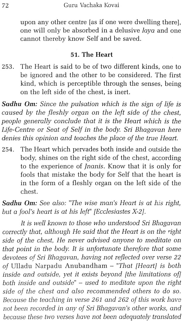 Whereas Upadesa Undiyar and Ulladu Narpadu consist entirely of stanzas composed by Sri Bhagavan, Guru Vachaka Kovai - the treasure-house of Sri Bhagavan's sayings collected and strung together as a garland of Tamil verses - consists mostly of stanzas composed by Sri Muruganar. Of the 1282 stanzas, 1254 were composed by Sri Muruganar and only 28 by Sri Bhagavan. However, each of the stanzas composed by Sri Muruganar embodies one of the actual sayings of Sri Bhagavan, and all of them were shown to Sri Bhagavan, who approved them and wherever necessary corrected them. On some occasions when Sri Muruganar submitted one or more newly composed stanzas to Him, Sri Bhagavan found that He could express the same idea in a more beautiful form or in a more terse manner, and hence He would compose a new stanza of His own, which would also be included in Guru Vachaka Kovai3. Thus each stanza of Guru Vachaka Kovai presents in a well-wrought and finely polished setting a pearl that fell from Sri Bhagavan's lips, and the whole work forms a systematic and detailed exposition of His teachings and carries His imprimatur.
