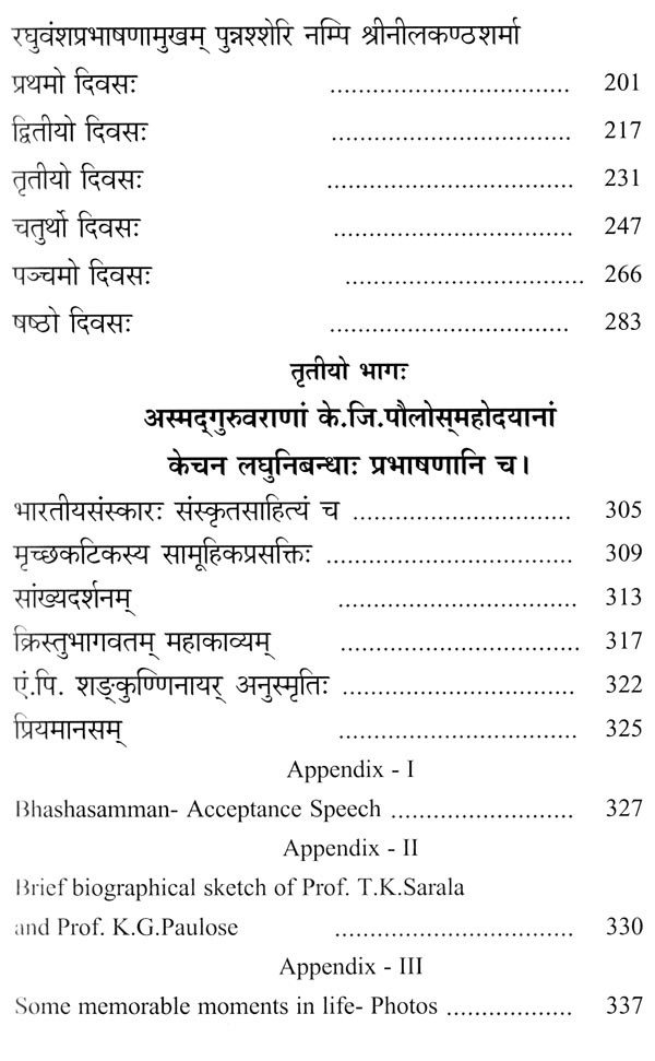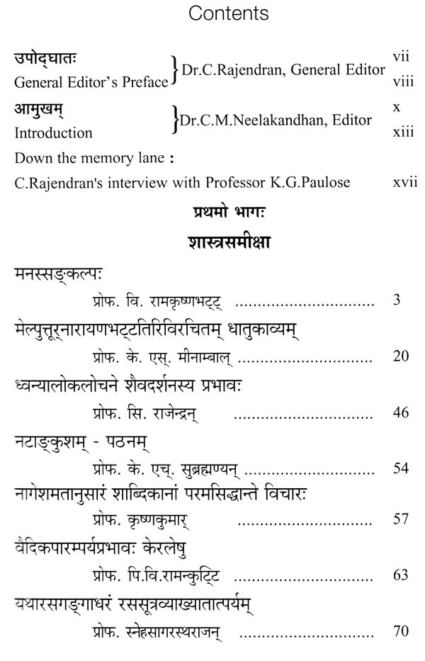 The present volume is divided into three sections. The first section is devoted to articles on various Sastras written by scholars of repute. The second section reproduces the famous talk entitled Punnasseriprabhasanam delivered by the great Sanskrit scholar and preceptor, Punnasseri Nambi Neelakantha Sarma, the founder of the famous Sanskrit College of Pattambi. It may be recalled in this connection that it was Prof. Paulose who published this rare work of immense cultural value for the first time. The third section contains the articles and lectures of Prof. Paulose which would give us an idea of the range and depth of his all round scholarship.