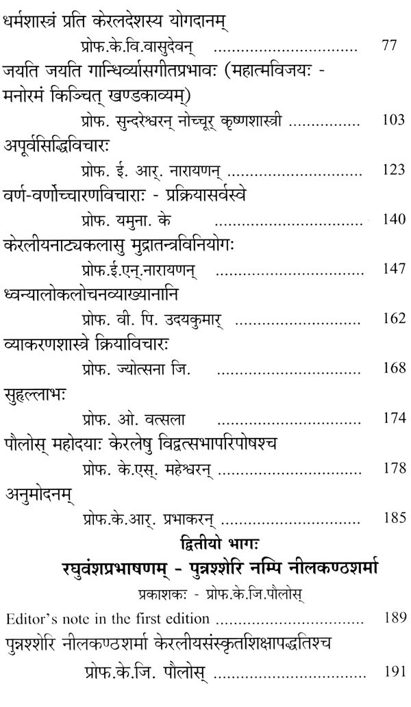 Prof. V.Ramakrishnabhatt (Manassankalpah), Prof. K.S. Minam-bal (Melputtur Narayanabhattaviracitam Dhatukavyam), Prof. C. Rajendran (Dhvanyalokalocane Saivadarsanasya Prabhava), Prof. K.H.Subrahmanyan (Natankusam - Pathanam), Prof. Krishnakumar (Nagesamatanusaram Sabdikanam Paramasiddhante Vicara), Prof. P.V.Ramankutty (Vaidikaparamparyaprabhavah Keralesu), Prof. Snehasagarastha Rajan (Yatharasagangadharam Rasasutravyakhya-tatparyam), Prof.K.V.Vasudevn (Dharmasastram Prati Keraladesasya Yogadanam) Prof. Noccur Krishnasastri Sundareswaran (Jayati Jayati Gandhirvyasagitaprabhavah), Prof. E.R.Narayanan (Apurvasiddha-ntavicarah), Prof. Yamuna K (Varnavarnoccaranavicarah Prakriyasarvasve), Prof. E.N. Narayanan (Keraliyanatyakalasu Mudratantra-viniyogah), Prof.V.P.Udayakumar (Dhvanyalokalocanavyakhyanani), Prof. G. Jyotsna (Vyakaranasastre Kriyavicarah), Prof. O.Valsala (Suhrllabhah), Dr. K.S. Maheswaran (Paulose Mahodayah Keralesu Vidvatsabhapariposasca). Dr. K.S. Maheswaran in the end of his article gives a note on some personal experience of how Prof. Paulose encouraged and promoted him in Sanskrit Sastra studies while he was a BA Student when he went for a Vakyarthasadas at Trippunithra. In the end of the first part, a verse in Sanskrit praising Prof. Paulose by his student Dr.K.R.Prabhakaran, is also given.