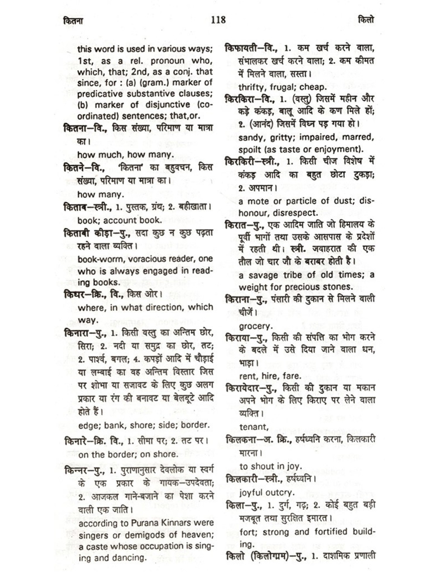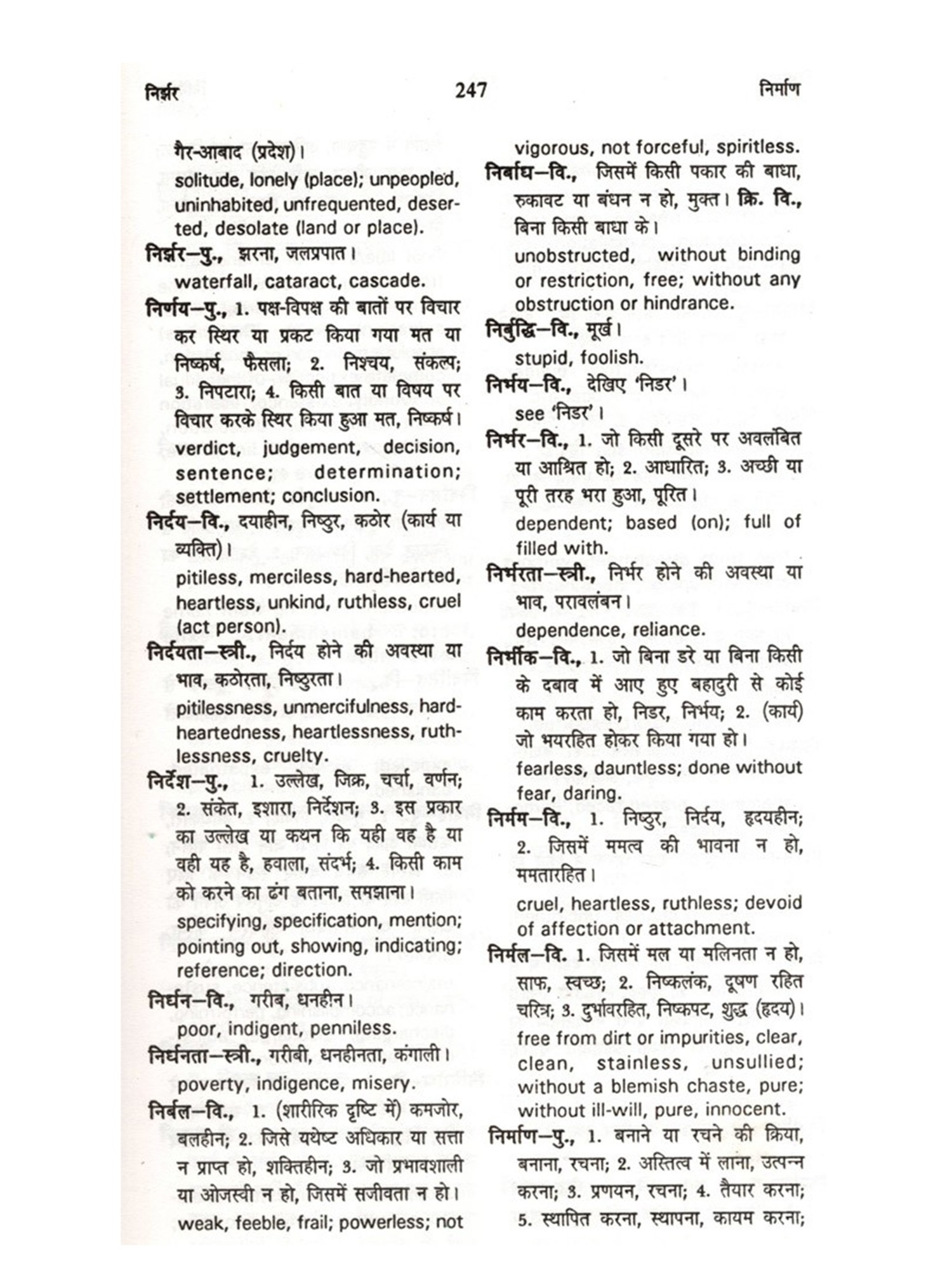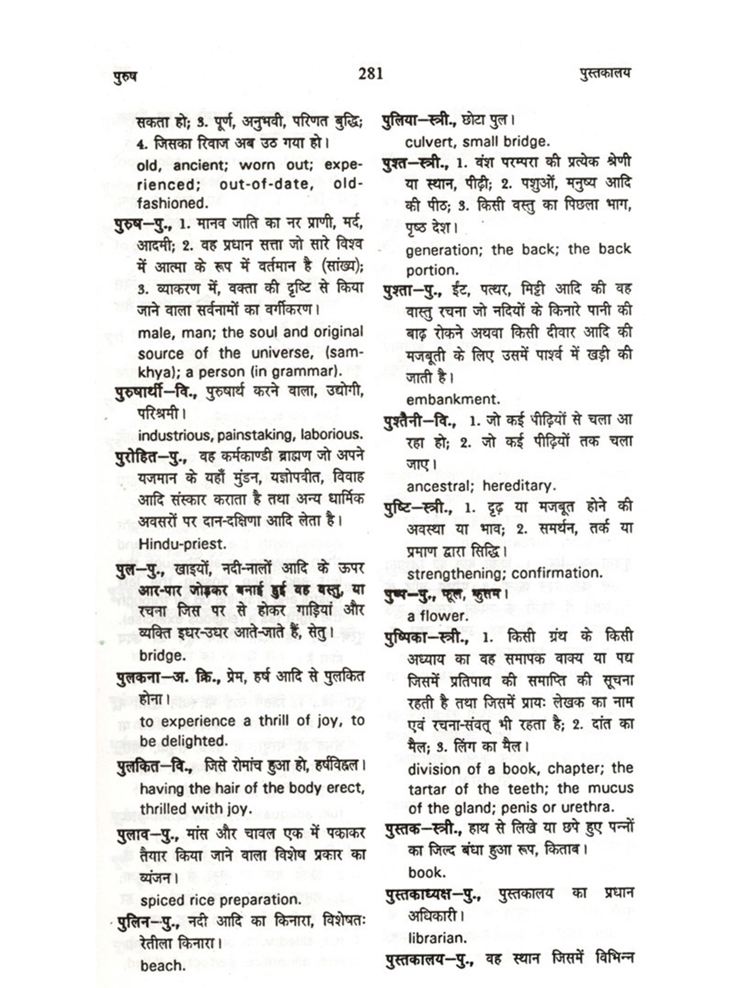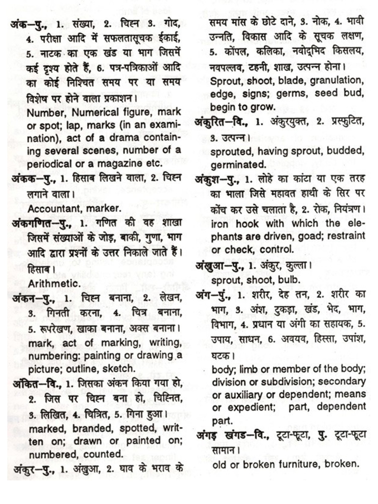 The various meanings of the Hindi words are made clear by additional indications in brackets and are immediately followed by the English equivalents. Different shades of meaning are separated by a semi-colon. The meanings are normally numbered; where this was deemed superfluous the different meanings are separated by a semi-colon.