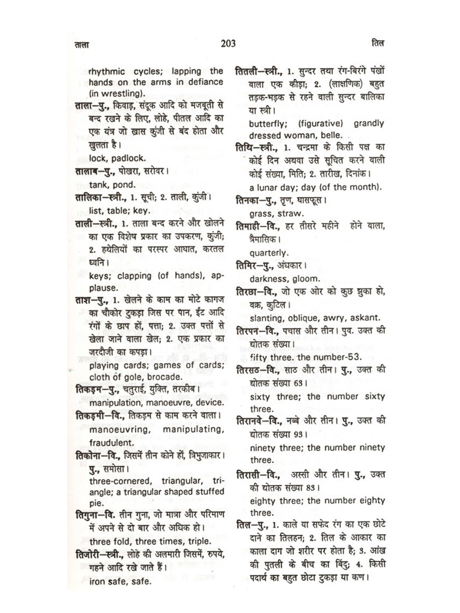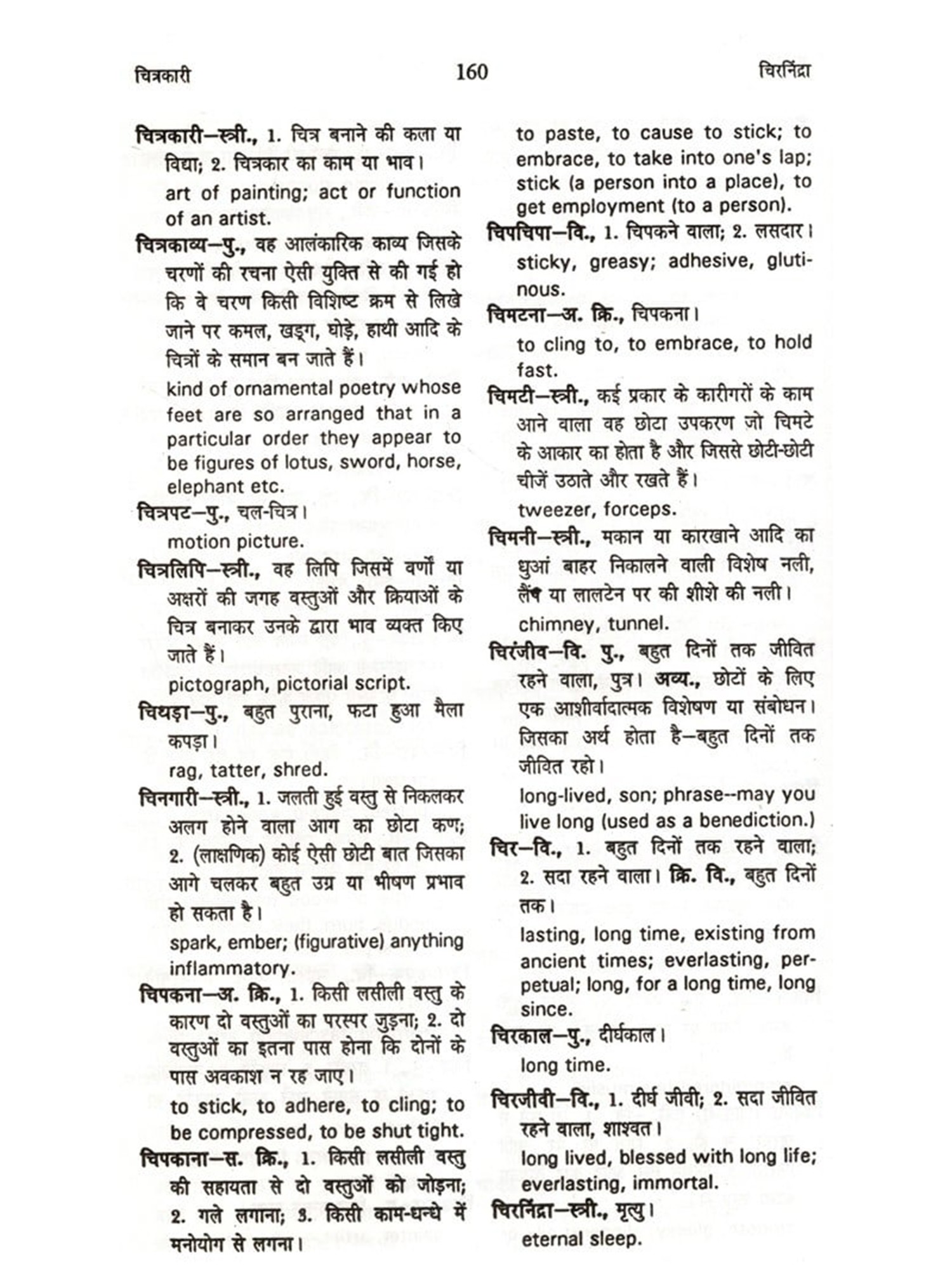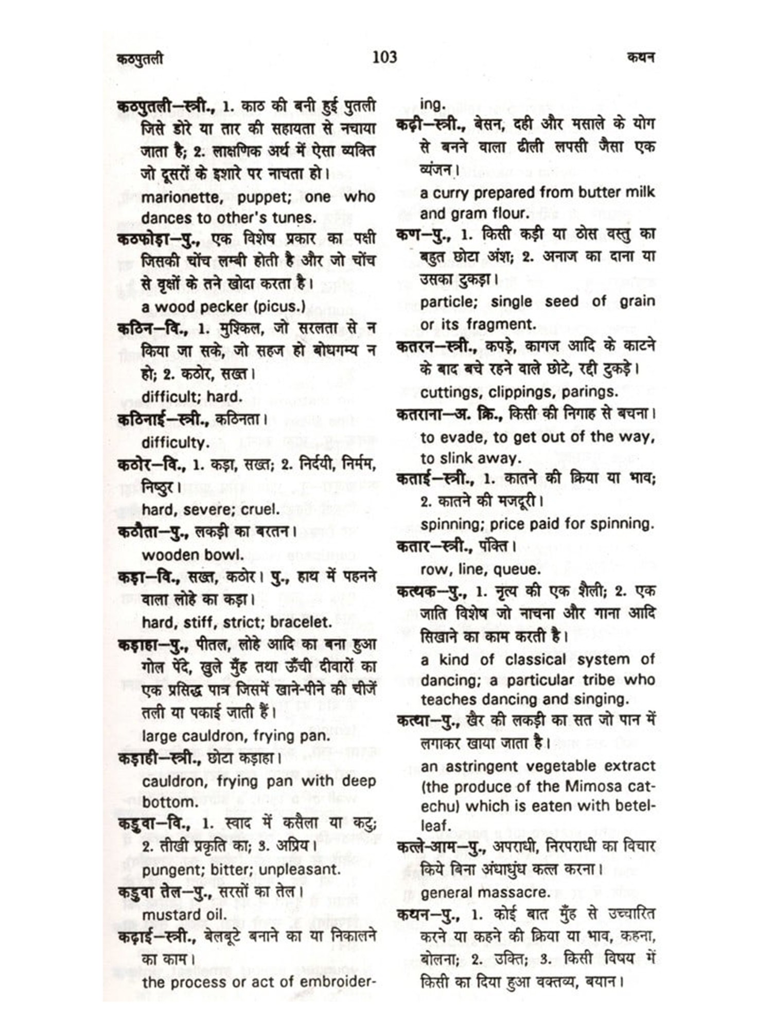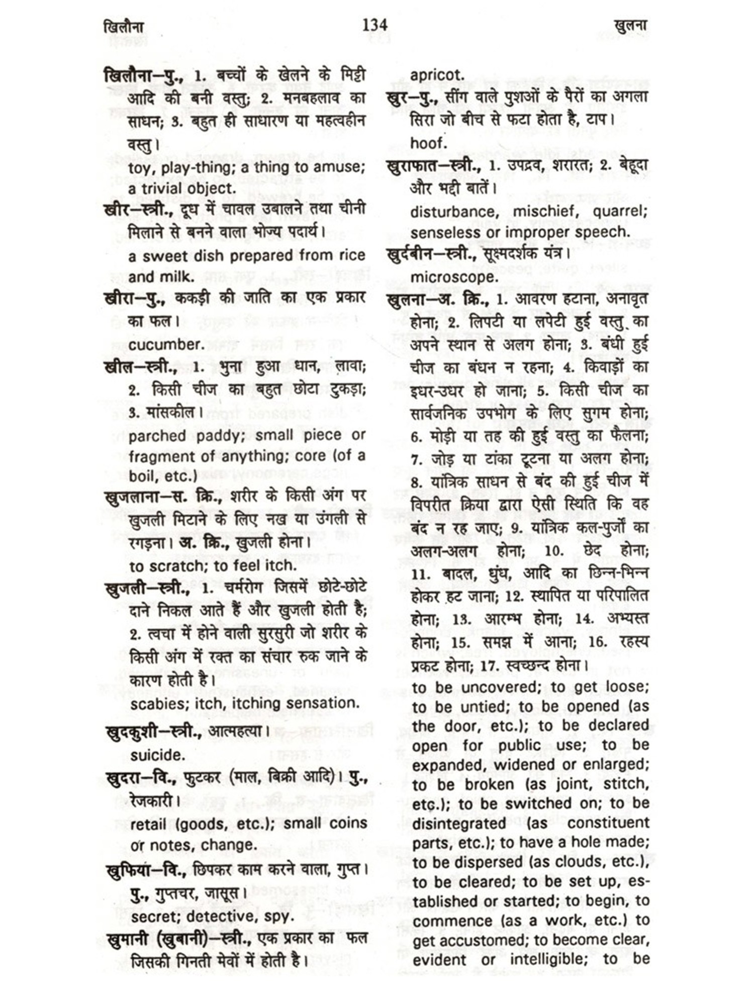 The various meanings of the Hindi words are made clear by additional indications in brackets and are immediately followed by the English equivalents. Different shades of meaning are separated by a semi-colon. The meanings are normally numbered; where this was deemed superfluous the different meanings are separated by a semi-colon.