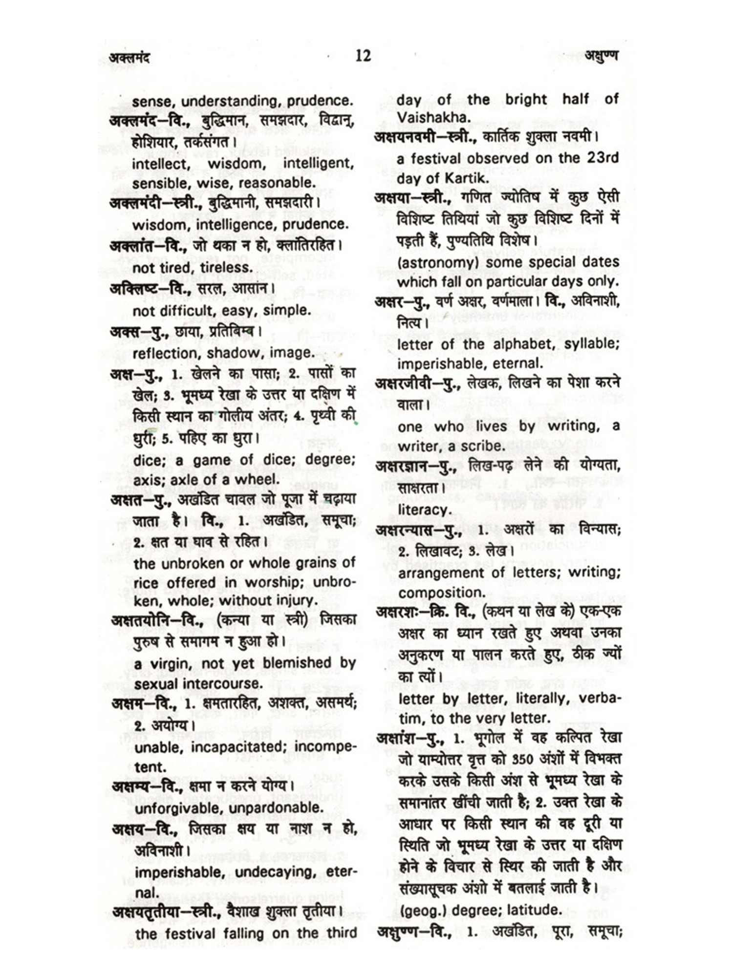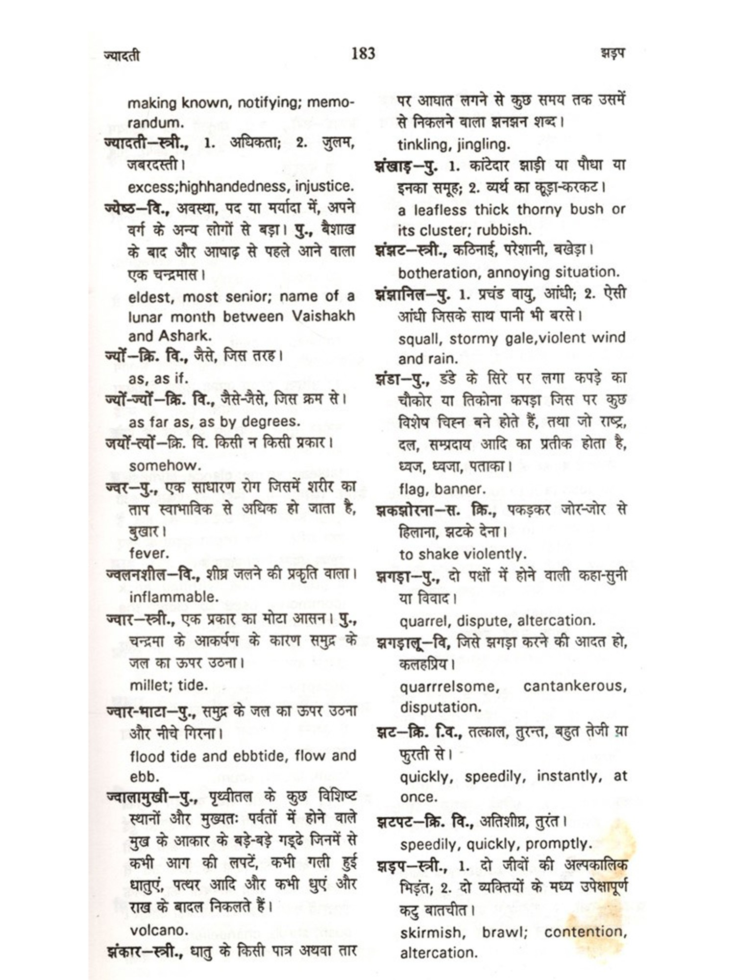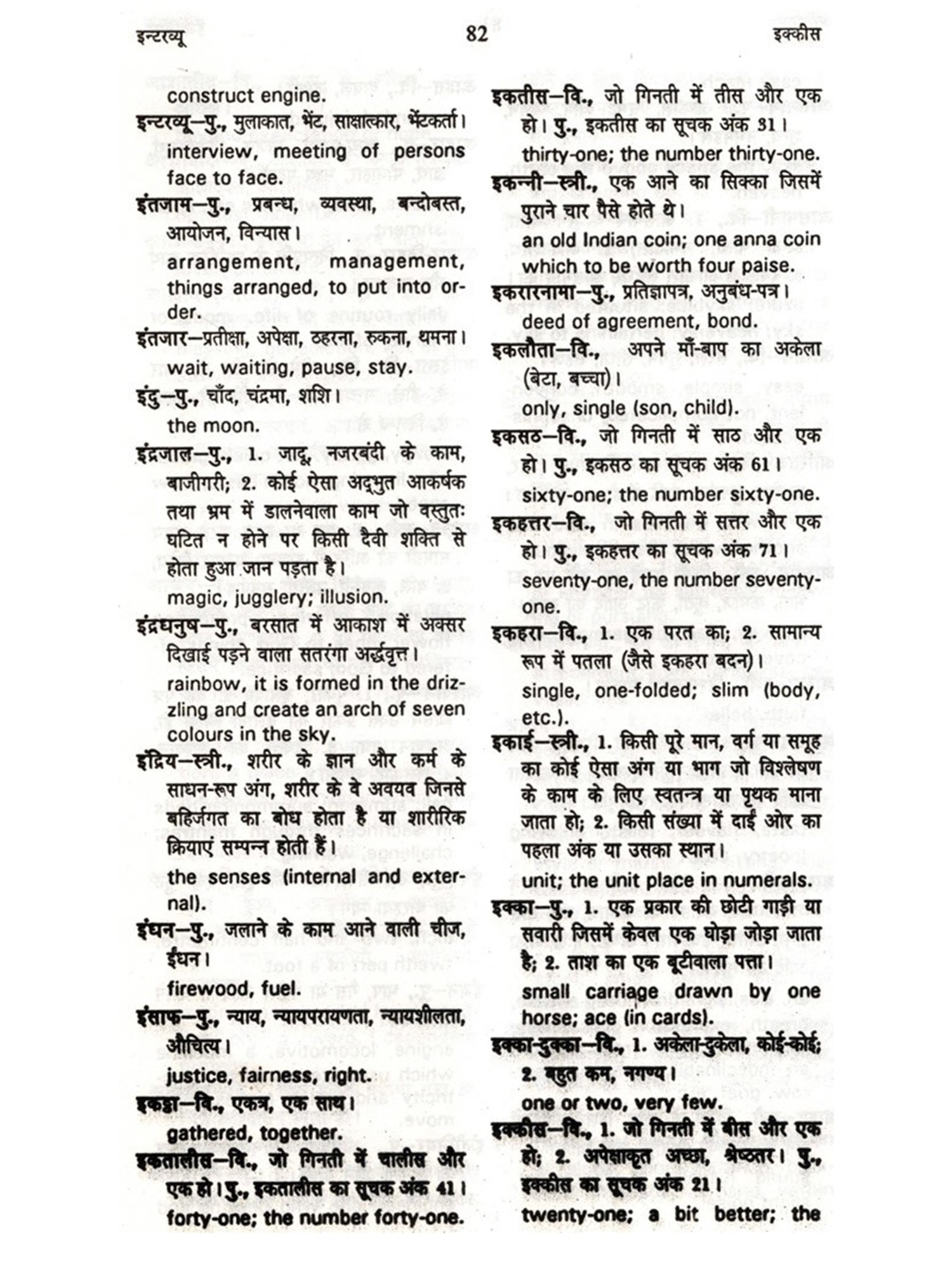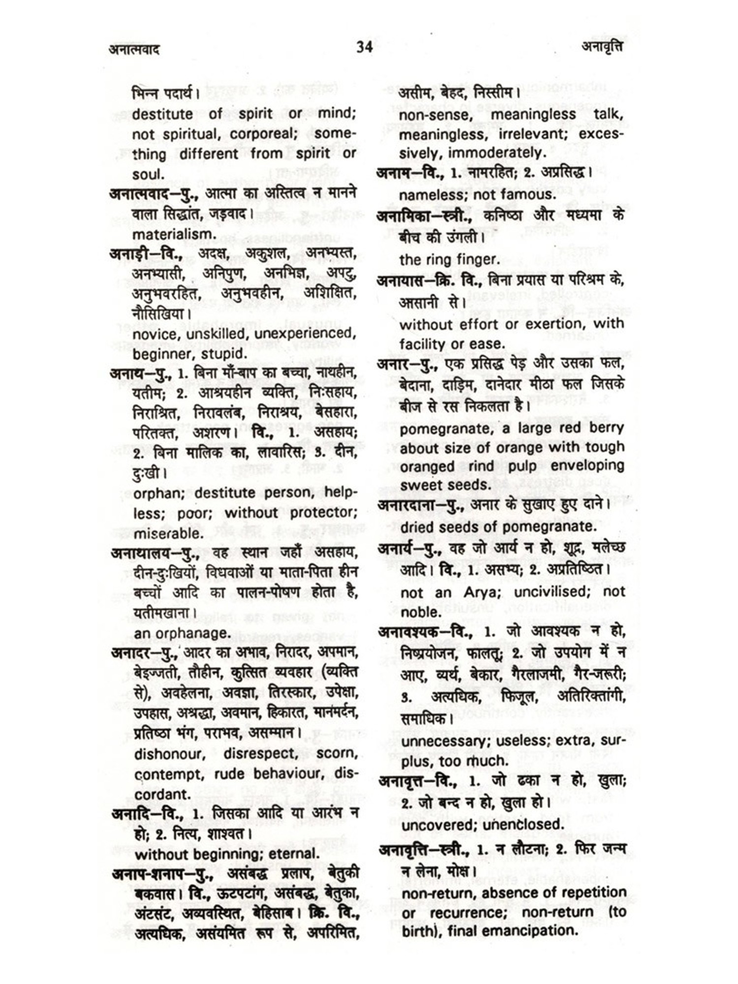 The various meanings of the Hindi words are made clear by additional indications in brackets and are immediately followed by the English equivalents. Different shades of meaning are separated by a semi-colon. The meanings are normally numbered; where this was deemed superfluous the different meanings are separated by a semi-colon.