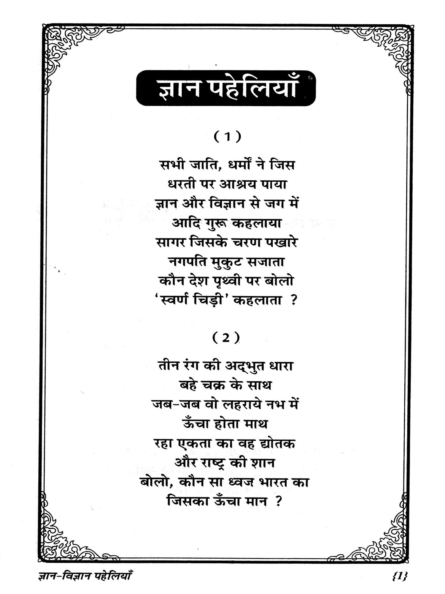 "सभी जाति, धर्मों ने जिस धरती पर आश्रय पाया ज्ञान और विज्ञान से जग में आदि गुरु कहलाया सागर जिसके चरण पखारे, नगपति मुकुट सजाता कौन, देश पृथ्वी पर बोलो, 'स्वर्ण चिड़ी' कहलाता ?"