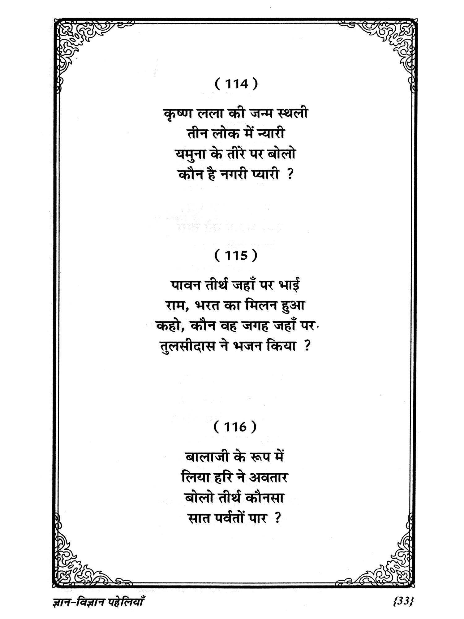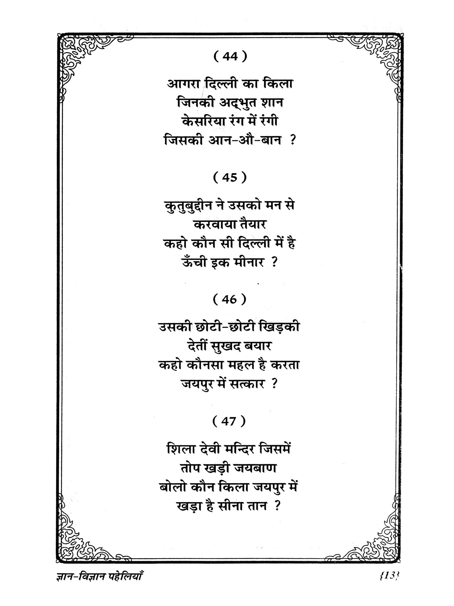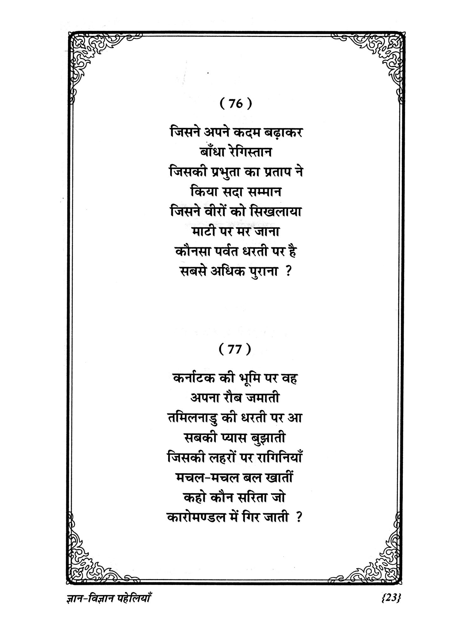 अभीष्ट उत्तर हल्दीघाटी है। यहाँ केवल सूचना के लिए पहेली की रचना नहीं की गई है। आजादी की लड़ाई लड़ने वाले महाराणा प्रताप की वीरता और जोखिम भरे जीवन की याद दिलाने वाली है। उसके साथ-साथ चेतक की स्वामिभक्ति, मन्ना का त्याग, भामाशाह का त्याग के साथ उदारता की गाथाओं का स्मरण कराने वाली एक ही पहेली में गागर में सागर भर दिया है। ऐसी ही पहेलियाँ हैं जिनके उत्तर हैं पानीपत, कालापानी, जलियाँवाला बाग, चित्तौड़, विजय स्तम्भ, झाँसी, शीशगंज साहब आदि। भारत की पावन नदियों पर आधारित कुछ पहेलियाँ हैं जिनके किनारे संस्कृति पनपी है सरयू, गंगा, यमुना, नर्मदा, क्षिप्रा, गोमती, कावेरी, कृष्णा आदि पर पहेलियाँ गढ़ी हैं।