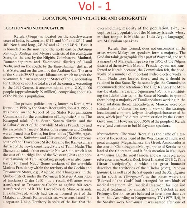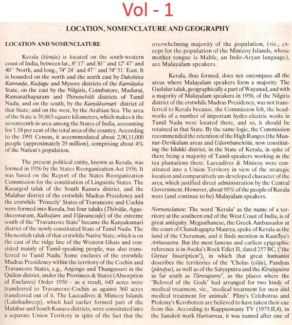 The International School of Dravidian Linguistics (ISDL), in its series of handbooks on the States of India. has already issued one on Tamil Nadu, and a two-volume work on West Bengal. This, the third, is on Kerala. It will be in two volumes, and like its predecessors, will encompass available information as close to the date of its issue as possible The compilations are not intended to be like Government gazetteers, but much less structured. Far from uncritically presenting the achievements of the Government, several of our articles are critical of policy and practice