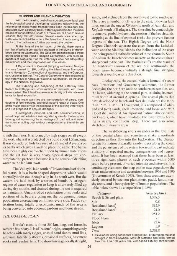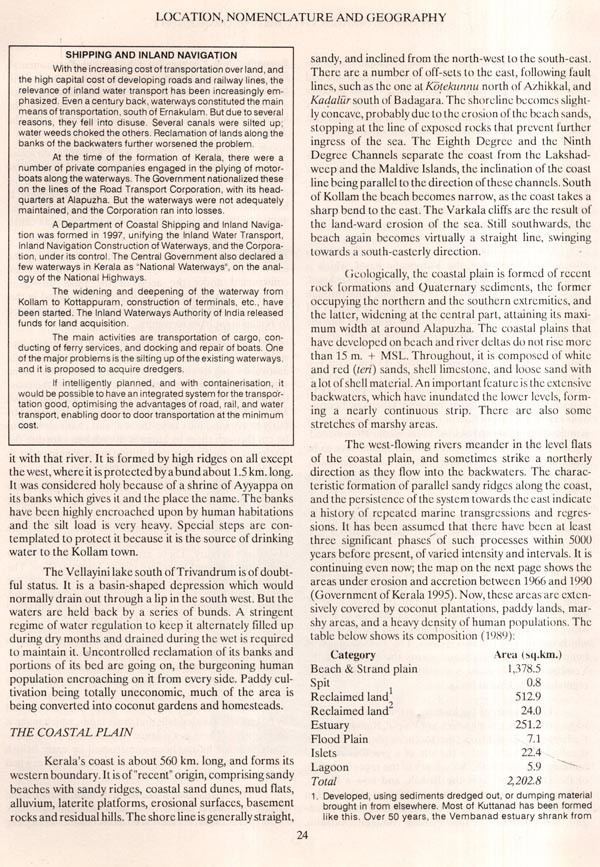 This, the first volume, covers the geomorphology and geography of Kerala, history, the major religions to which its people subscribe (or have, through history, subscribed), and economy. The articles in the series on geomorphology and geography include materials on the water wealth and ecology of Kerala. We hasten to acknowledge our debt of gratitude to the Centre for Earth Science Studies (CESS), Thiruvananthapuram, and the Centre for Water Resources Development and Management, Kozhikode, whose directors and scientists opened to us their libraries and their expertise, supplied us materials and information, and spared time to educate us on these matters. An important point that emerged was that, as Dr. Basak pointed out during discussions and in his contribution, which we feature, rather than gross totals of annual precipitation and run-off, what is important and relevant is per capita availability of water. Judged thus, the belief that Kerala has "abundant water resources turns out to be only a myth. Our 41 west-flowing 'rivers' are of minor significance judged according to all-India standards, the combined discharge of all of them is only a small fraction when measured against that of a single South Indian river like the Godavari. The Director of CESS presented us with some valuable publications including the Resource Atlas of Kerala; these have enriched our Ilibrary.