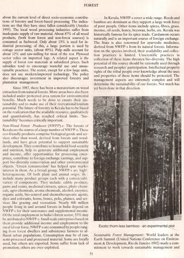 We have devoted a lot of space to articles on the forests of Kerala. Dr. Chandrasekharan (the author of the definitive Forest Resources of Kerala) and Sri. Madhavan Pillal are our contributors in this section, and we thank them sincerely. We have articles on the wildlife and flora of the State; we felt justified in detalling them because many of them are threatened by thoughtless misuse by a highly avaricious human population. Even if we may not be able to influence a change from this suicidal behaviour, we hope that we may leave behind a record of the biotic wealth available in our forests, as at the end of the 20th century.