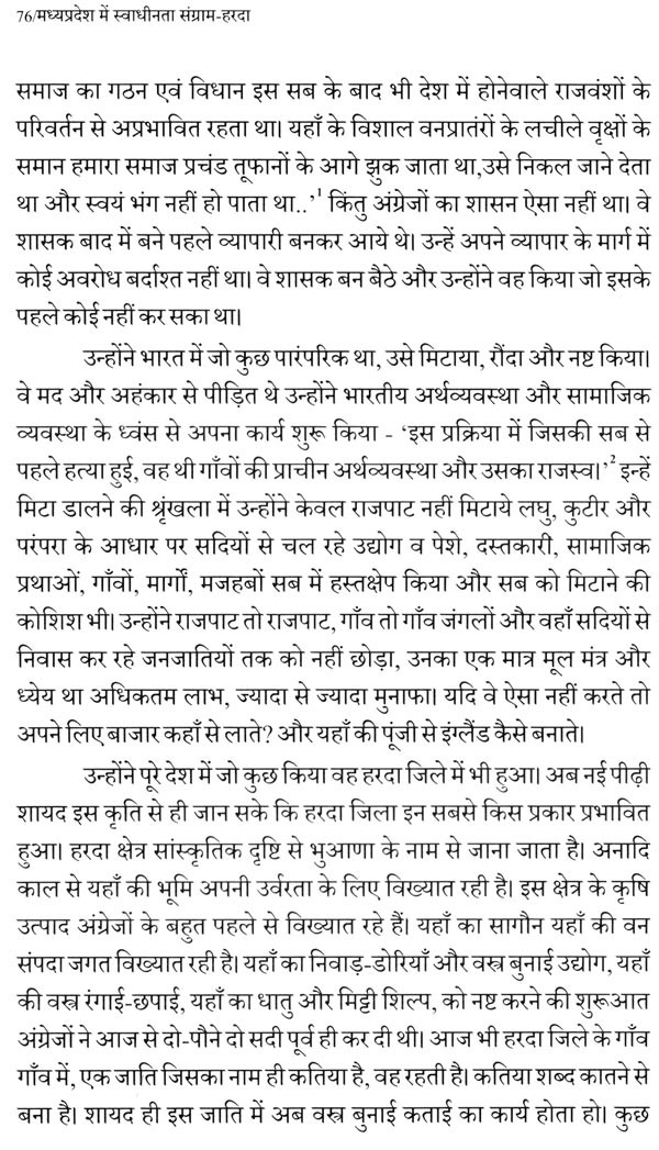 लोक और जनजातीय संस्कृति के साथ क्षेत्रीय इतिहास मेरी अभिरुचि और जिज्ञासा का विषय रहा है। ये तीनों बहुत अभिन्न हैं। हरदा अंचल के स्वातंत्र्य इतिहास पर शोधकार्य कर मुझे बहुत आह्लाद मिला है। सिर्फ हरदा को केन्द्र में रखकर लिखी गई कोई विशेष सामग्री अब तक उपलब्ध नहीं थी। जो कुछ जानकारियाँ थी वे गजेटियर आधारित ज्यादा थी। सन् 1857 की क्रांति में हरदा की भूमिका पर तो बहुत ही अल्प सामग्री जानकारी में थी। अंग्रेजों ने हरदा के क्रांतिकारी सिपाहियों, नागरिकों के बलिदान और कष्ट को बहुत प्रकाश में भी नहीं आने दिया। इनके विषय में अंग्रेजों ने न केवल अपमानजनक भाषा का प्रयोग किया बल्कि इनके योगदान को कम दिखाने की भी कोशिश की। किंतु वास्तविकता ऐसी नहीं थी। इसी प्रकार अंग्रेजों ने जनजातीय आक्रोश के प्रतीक टंट्या भील की क्रांति और बलिदान को भी रेखांकित नहीं होने दिया। अंग्रेज हरदा अंचल में कब और कैसे आये, उन्होंने कैसे यहाँ की भूमि, यहाँ के प्रशासन और यहाँ के ग्रामीण कुटीर उद्योग धंधों, व्यापार, हस्तकला, खेती-किसानी और सामाजिक ताने बाने का ध्वंस किया, यह सब आंचलिक परिप्रेक्ष्य में कम ही लोग जानते हैं। अब समय आ गया है कि हम जाने कि यह सब कैसे और क्यों हुआ। हम यह भी जाने कि अंग्रेज हमारे समाज, शासन और प्रशासन को वे तौर तरीके दे गये जिन्हें कदाचित भारतीय नहीं कहा जा सकता। आवश्यकता है कि हम अपनी परंपरा और संस्कृति से भारतीय तत्वों की इस बहाने खोज करें।