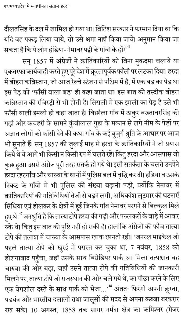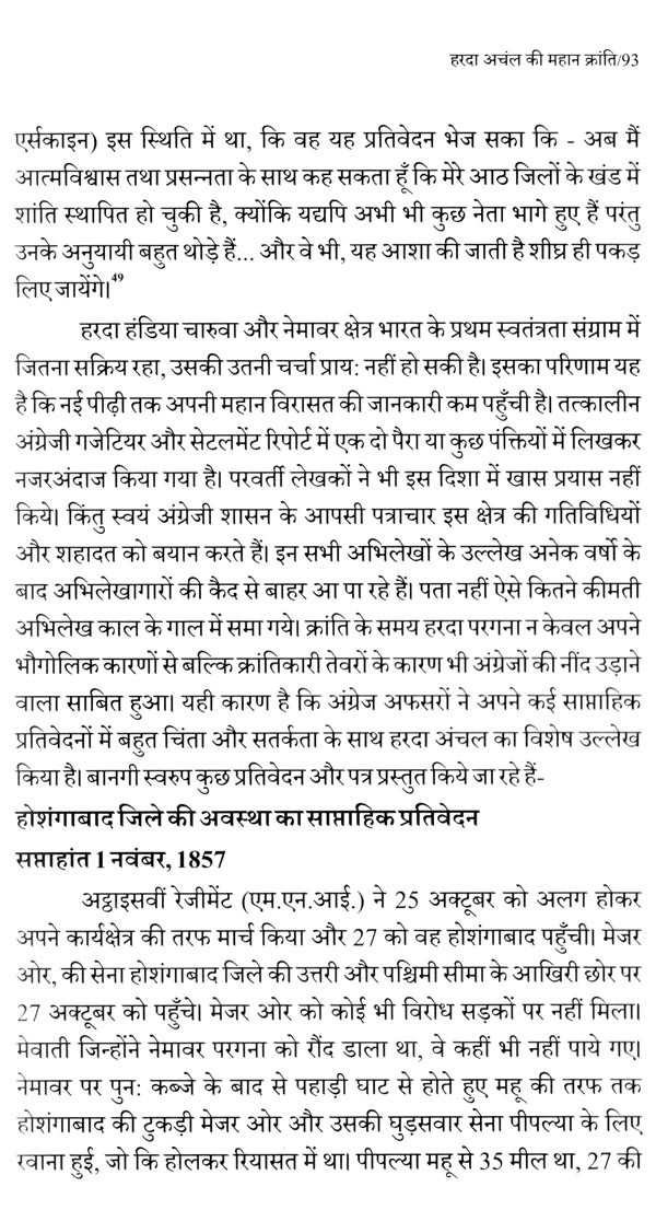 मेरा अपना विनम्र अनुमान है कि विरासत से कटते और दिशा से भटकते हुए समय में यह सामग्री और भी उपयोगी हो जायेगी। सन् 2057 में मेरी आयु 90 वर्ष हो जायेगी यदि जीवित रहा तो प्रथम स्वतंत्रता संग्राम के दो सौ वर्षों के आयोजन, चिंतन, मूल्यांकन, अन्वेषण को देखना समझना चाहूँगा। यदि 80 वर्ष की आयु जी सका तो स्वतंत्रता की पहली शती का उत्सव देखने की मेरी उत्कट अभिलाषा पूरी होगी। मुझे लगता है आंचलिक संदर्भों में तब यह पुस्तक ज्यादा काम की हो जायेगी। हो सकता है मेरा यह आकलन सही न हो। इस दिशा में मैंने एक प्रयास किया है। इसके बाद भी संभावना बची है। अध्येता आये और अपने मसि ऋण को पूरा करें। इस पुस्तक में पहली बार हरदा पुलिस के लगभग सौ वर्ष पुराने रिकॉर्ड और हरदा तहसील कांग्रेस कमेटी के कार्यवाही रजिस्टर में दर्ज तथ्यों के प्रकाश में हरदा के स्वाधीनता संग्राम को देखने की कोशिश की गई है। इन दो सामग्रियों के आधार पर ही मुझे सन् 1910 से लगभग सन् 1930 के बीच में सक्रिय रहे स्वतंत्रता संग्राम सेनानियों, विचारकों के विषय में ज्ञात हो सका। इनमें से कई नाम तो ऐसे हैं जिनके परिजन भी इस विषय में ज्यादा नहीं जानते, हरदा और विविध थानों के दस्तावेज इसमें मेरे सहायक बने। ये दो ऐसे प्रामाणिक रिकॉर्ड है जिसकी तराजू पर हरदा के स्वतंत्रता संग्राम सेनानियों की भूमिका को पहचाना जा सकता है।