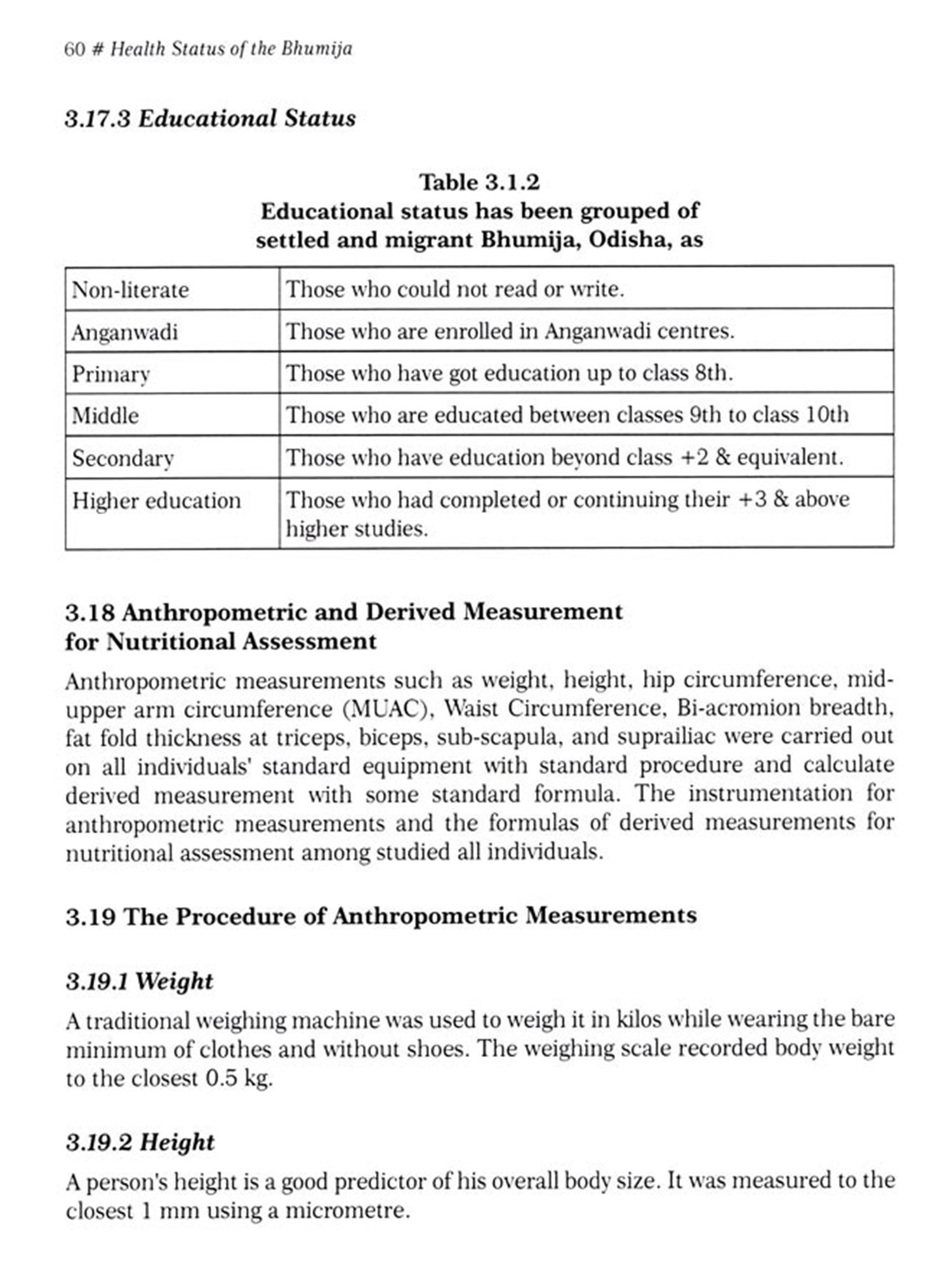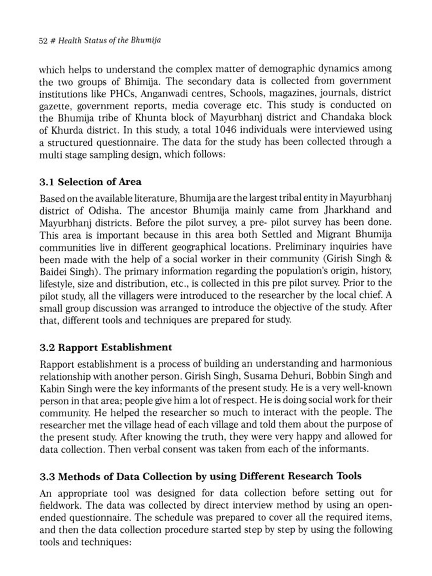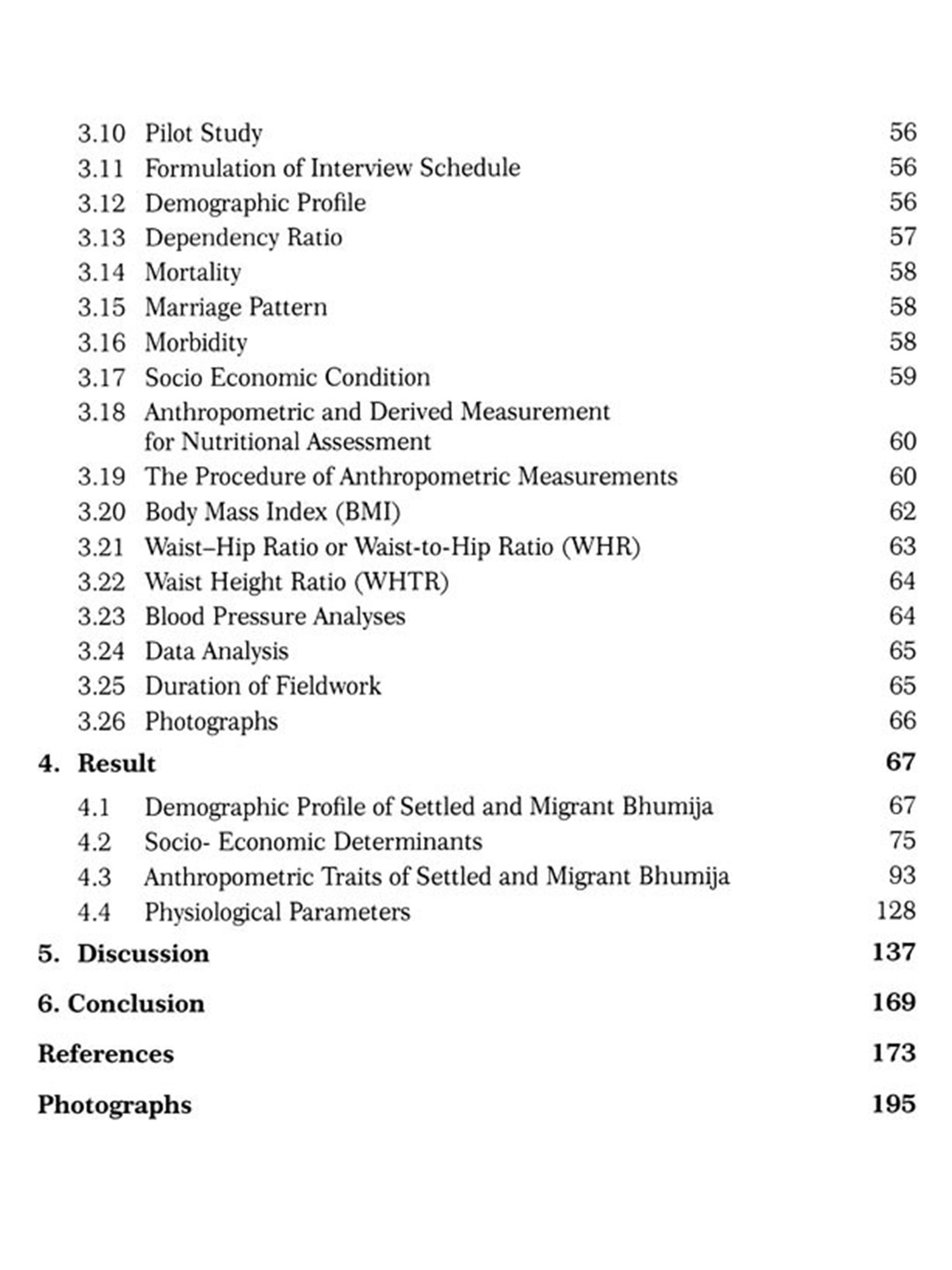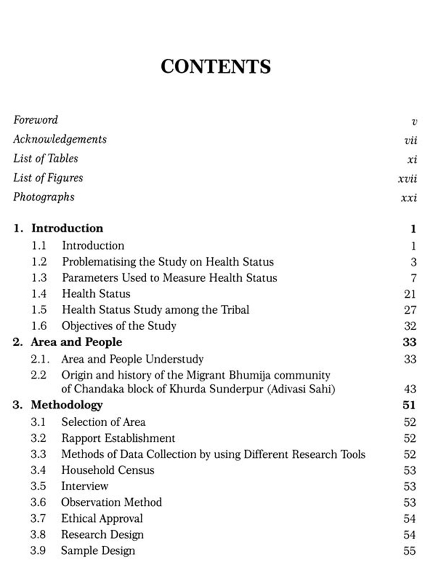 Based on empirical study among the settled and migrant Bhumija tribal community of Mayurbhanj and Khurda districts of Odisha, this book looks at the changing perspectives of health. It viewed Health Status, mainly looking at health from physiological and physical status of the body. In order for a comparative perspective of the changing health status among the settled and migrant Bhumijas, it has taken into consideration three important domains of health status such as; Demographic (fertility, mortality & morbidity characteristics), Nutritional (BMI, MUAC, stunting, wasting and underweight), and Physiological (SBP, DBP, consumption of tobacco etc.). The study reveals a perceptible difference between the settled and migrant Bhumija with respects to educational attainment, income status, fertility and mortality parameters, nutritional and physiological parameters.