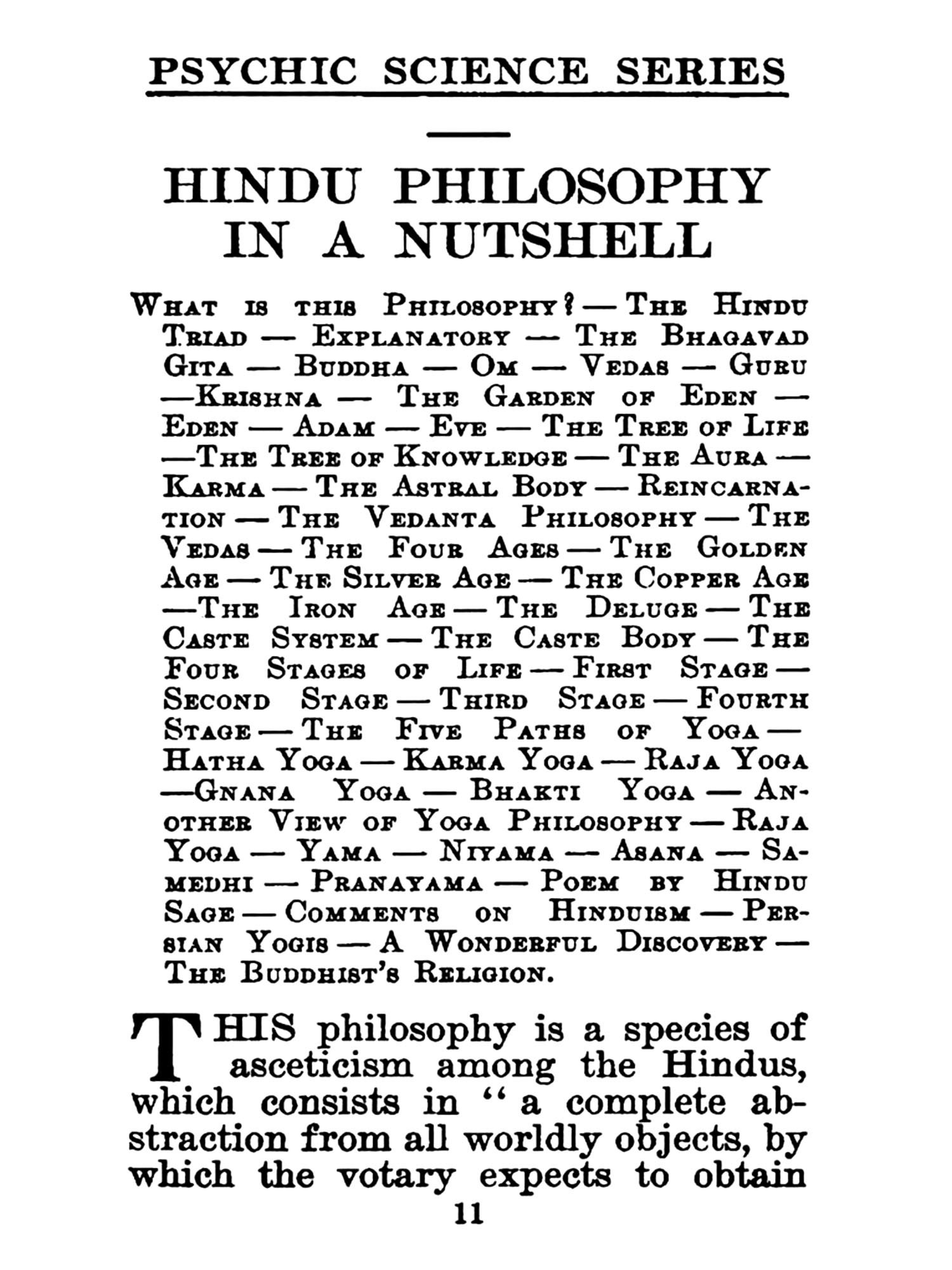 Hindu Philosophy in a Nutshell is a concise work that offers an overview of the core principles of Hindu philosophy. Part of the Psychic Science Series, the book aims to distill the complex and diverse teachings of Hindu thought into an accessible format. It explores key concepts such as the nature of the self (Atman), the ultimate reality (Brahman), karma, reincarnation, and moksha (liberation). The work highlights the philosophical underpinnings of various Hindu schools of thought, providing readers with a foundational understanding of the religion's spiritual and metaphysical ideas. It serves as an introductory guide to Hindu philosophy.