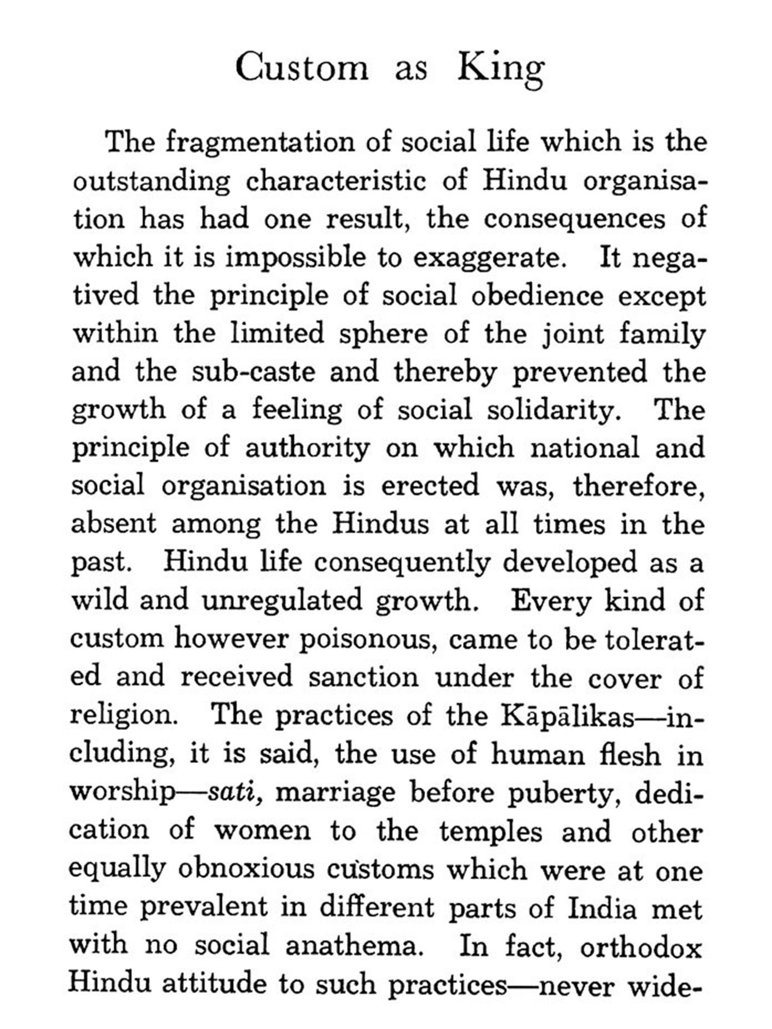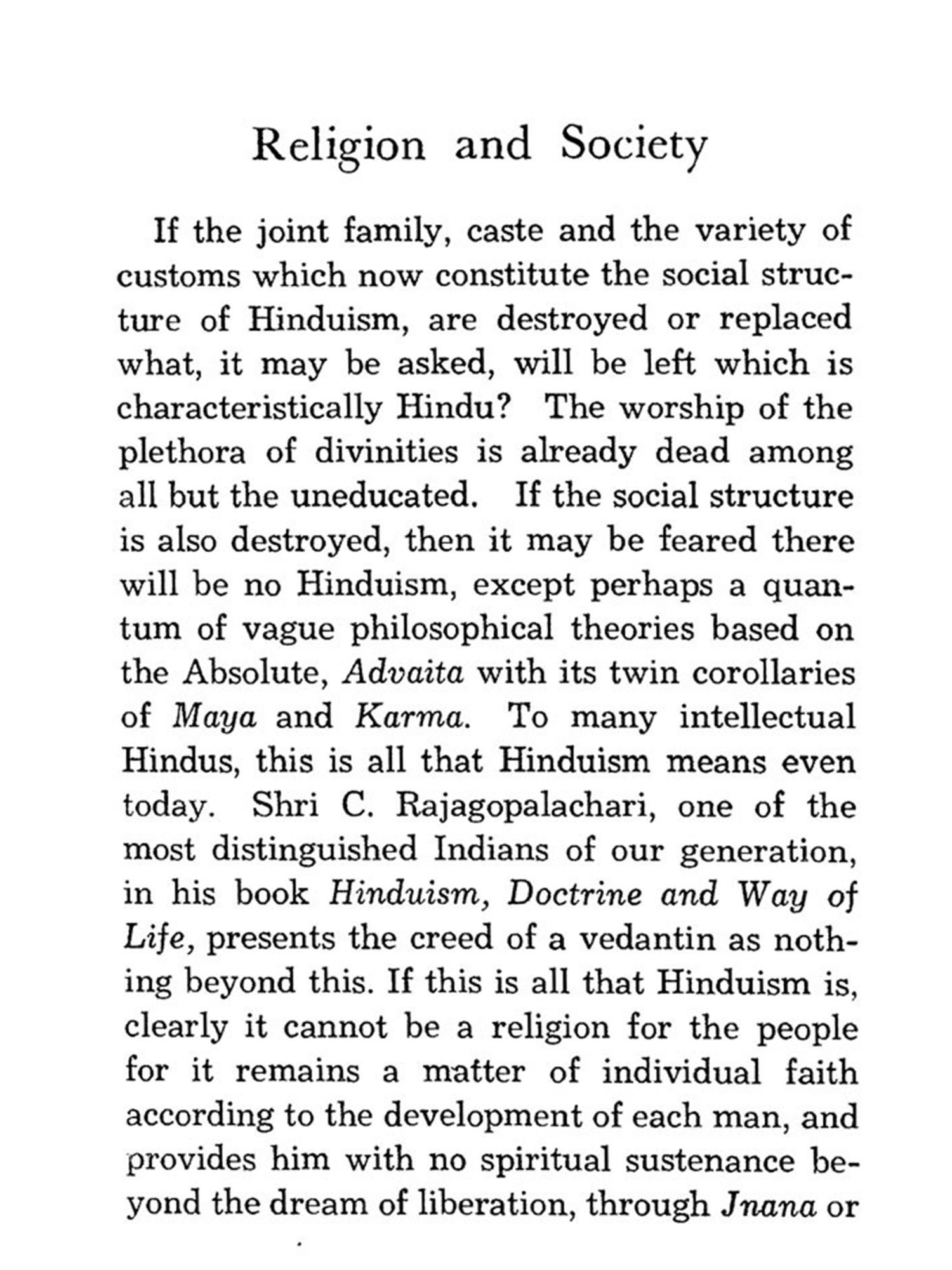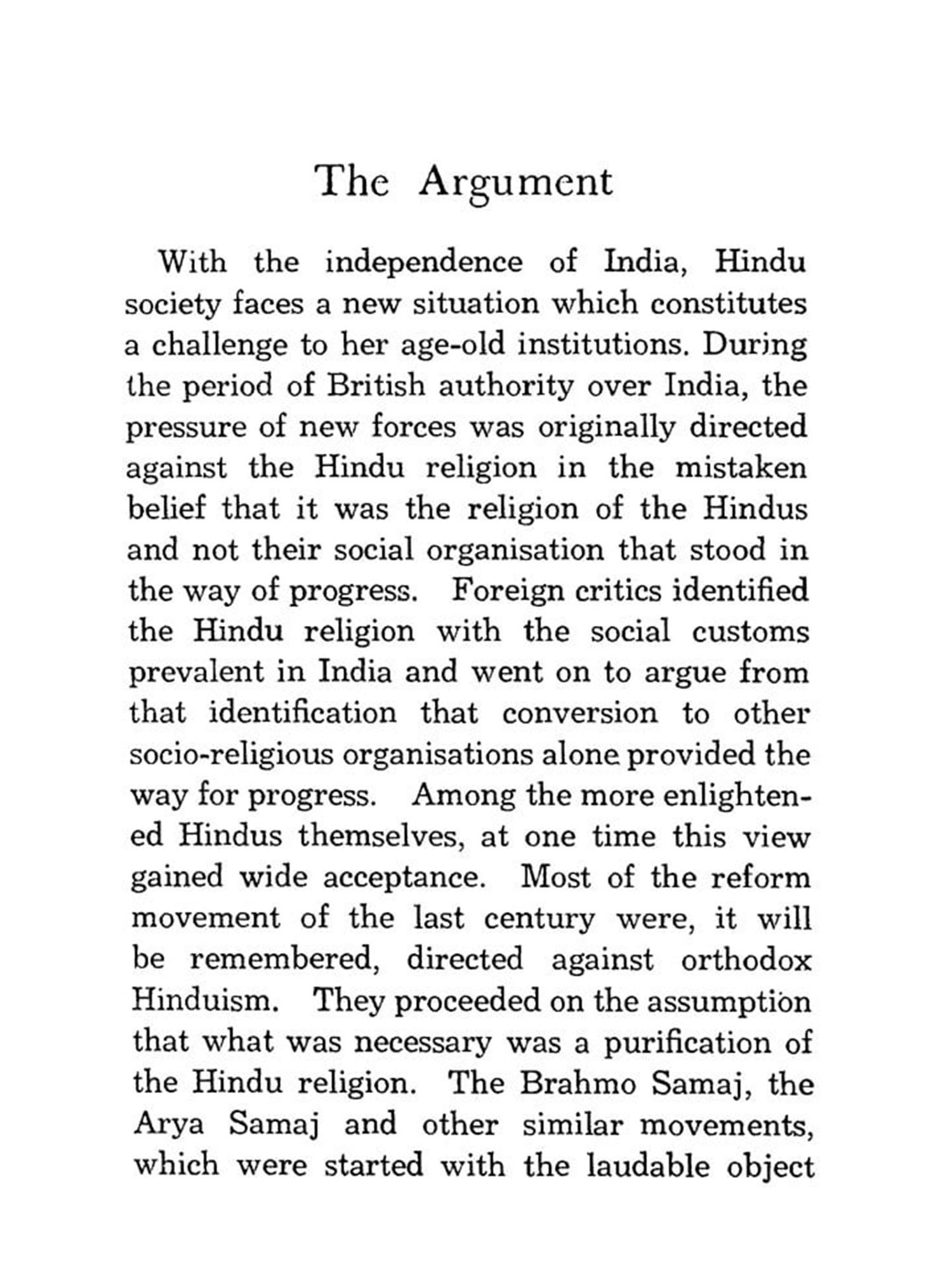 The Hindu society is no longer at cross roads. Since the publication of this book in 1955 the Hindu people have made their choice and have elected to march along the road of progress. When the book was written legislative measures for changing the social structure of Hinduism were under the consideration of Parliament. Bills meant to provide Hindu society with uniform laws in such important matters as marriage and succession were under consideration. The Great Debate was on, but the decision, though never in doubt, had not been finally taken. Today these changes which, it may well be said revolutionize Hindu society, have been placed on the statute book without creating any social or political upheaval.