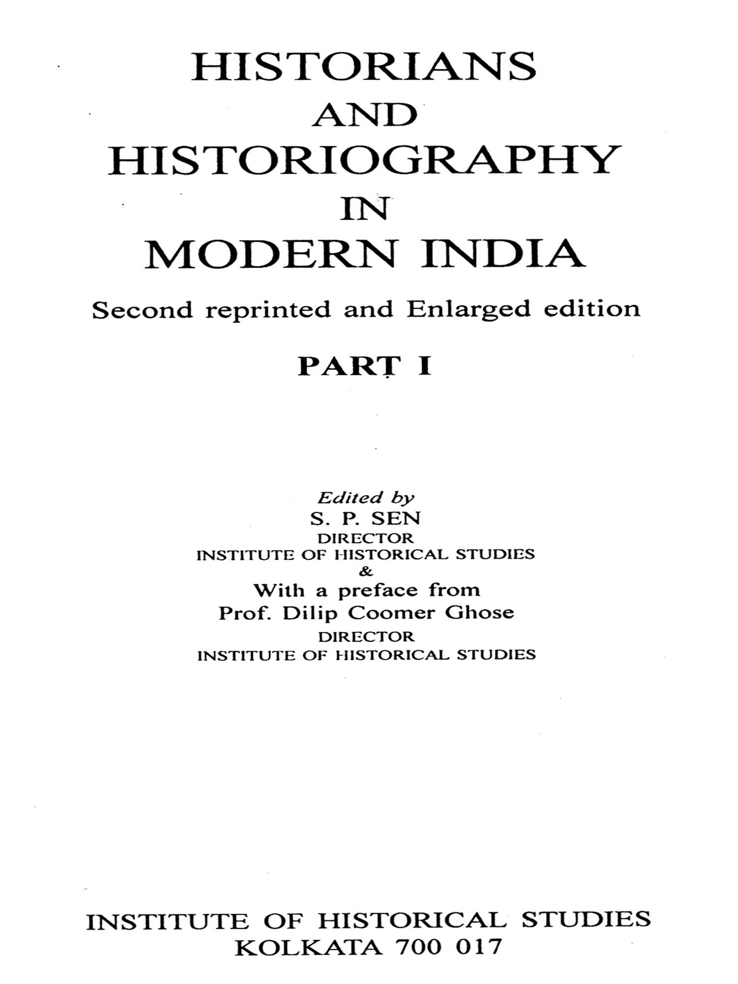 The principal theme of the Conference, which is now taken as the title of the volume, was 'Historians and Historiography in Modern India. The objective was to give a full account of the development of Indian Historiography in the nineteenth and twentieth centuries through the writings of some selected eminent historians from the middle of the nineteenth century to the middle of the twentieth. Altogether forty historians have been selected representing different parts of India, different periods and different fields of interest in historical studies. Of these forty, seven are British historians, writing on Indian history, and thirty-three are Indian historians.