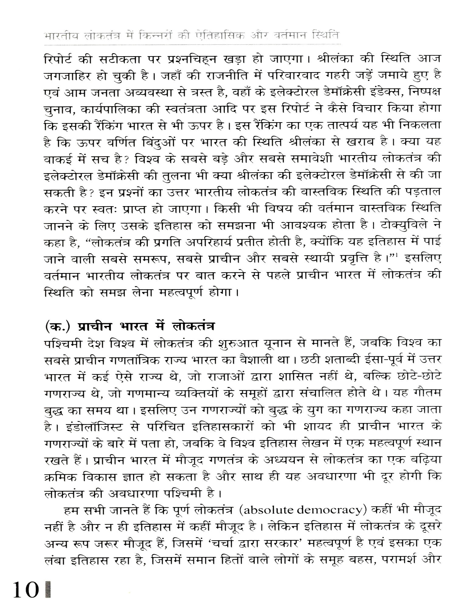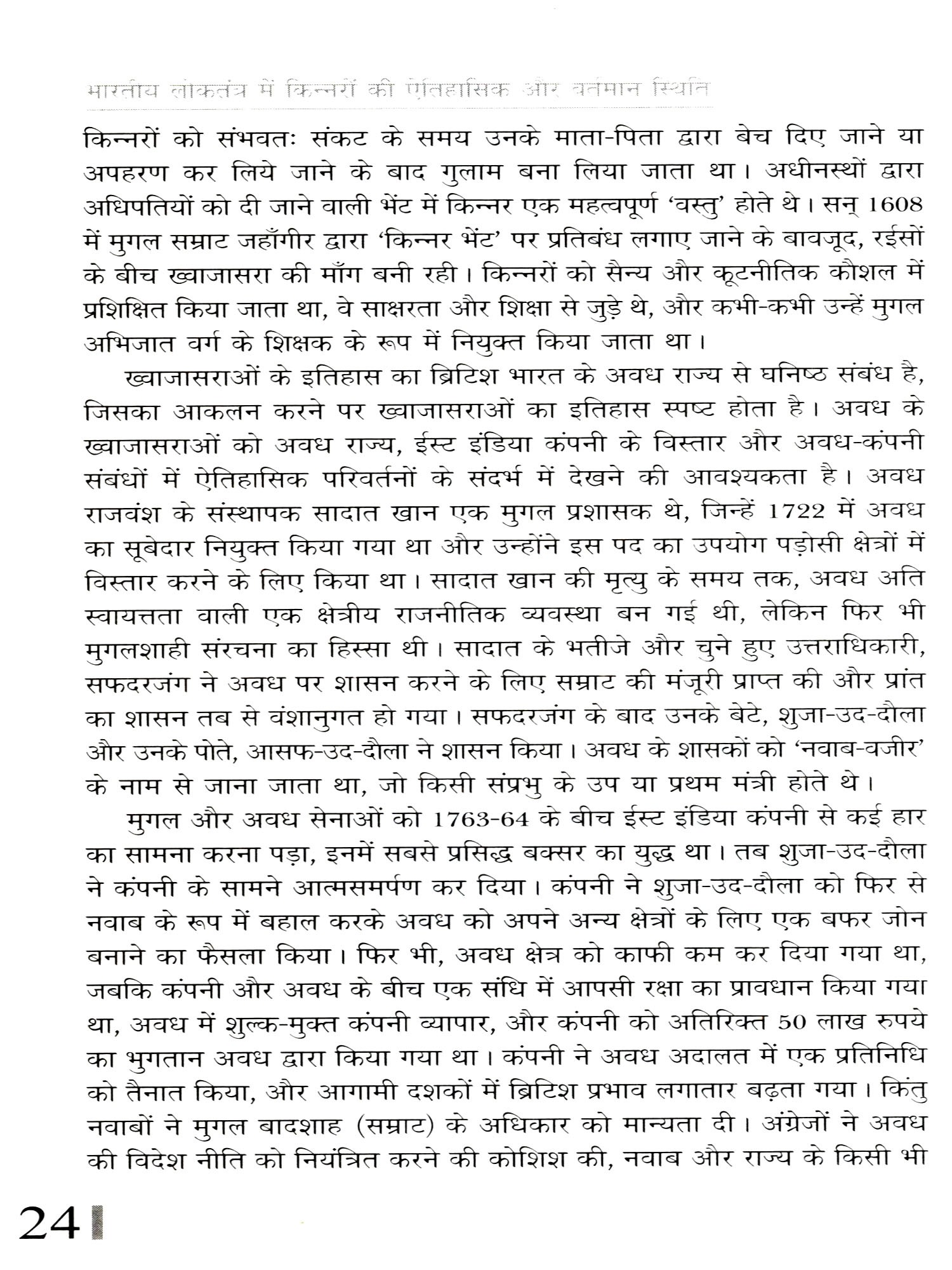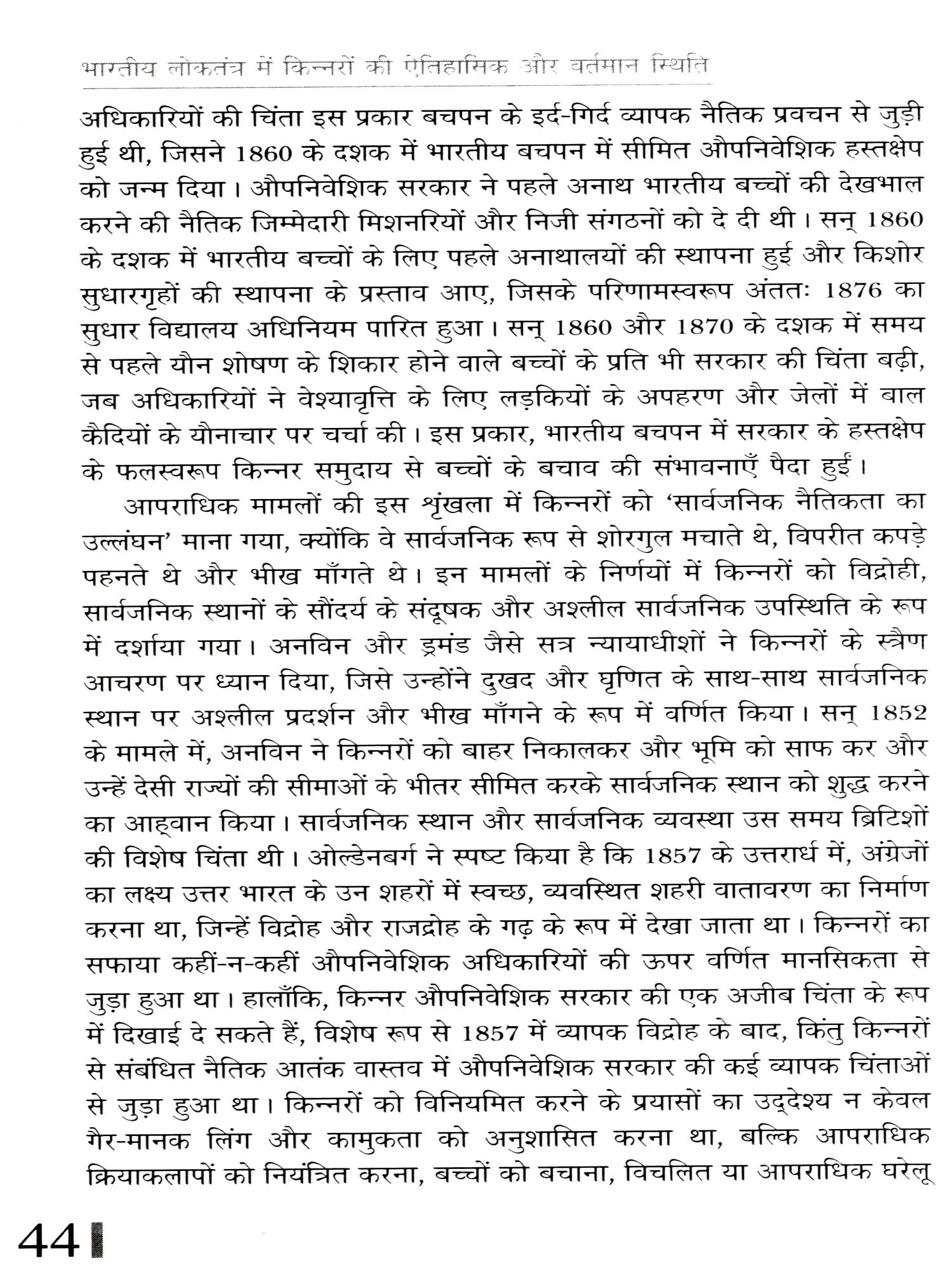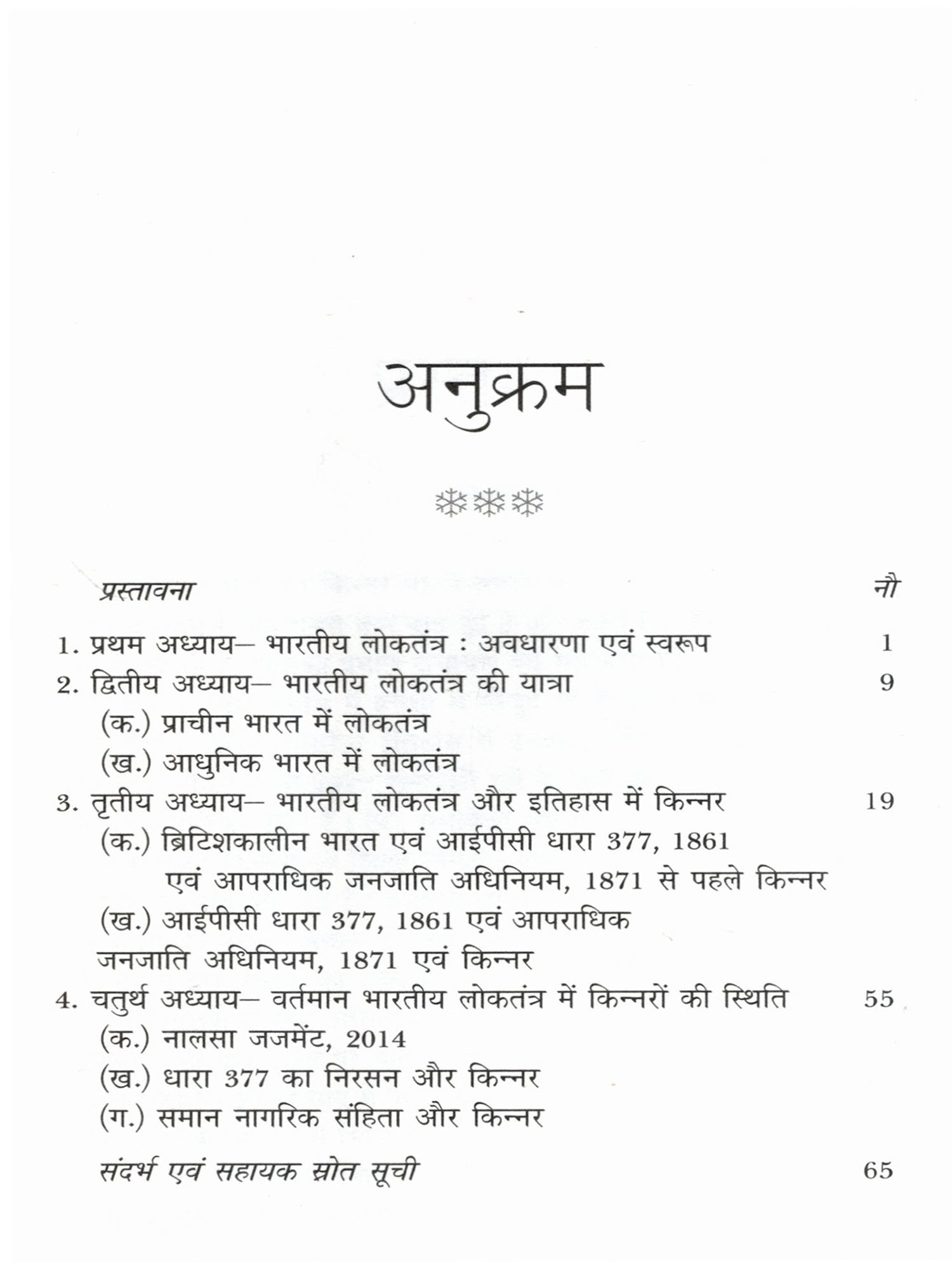 मानव-समाज में स्थित किन्नर मानव-समाज के वे सदस्य हैं, जिन पर इतिहास में, और वर्तमान में भी, सबसे कम बात हुई है और होती है। किंतु वे हमारे बीच हमेशा से मौजूद रहे हैं, जिसका प्रमाण रामायण एवं महाभारत में उनके उल्लेख के रूप में है। यदि वे हमारे समाज में हमेशा से मौजूद रहे हैं, तो अवश्य ही उनका इतिहास भी होगा। लेकिन भारतीय इतिहास में इनका उल्लेख न के बराबर मिलता है। भारतीय लोकतंत्र की प्रकृति समावेशी रही है, जहाँ हर धर्म, हर जाति एवं हर वर्ग के लोग मिलकर रहते हैं। फिर समावेशी भारतीय लोकतंत्र में वे क्या कारण रहे, जिनके चलते किन्नरों की स्थिति बिगड़ी? क्यों वे हमारे बीच ही रहते हुए भी तीसरी दुनिया के लोग कहलाते हैं? वर्तमान समय में उनकी स्थिति क्या है और भारतीय लोकतंत्र को मजबूत बनाने में उनकी क्या भूमिका है? इन सारे प्रश्नों की पड़ताल करना ही इस पुस्तक का ध्येय है।