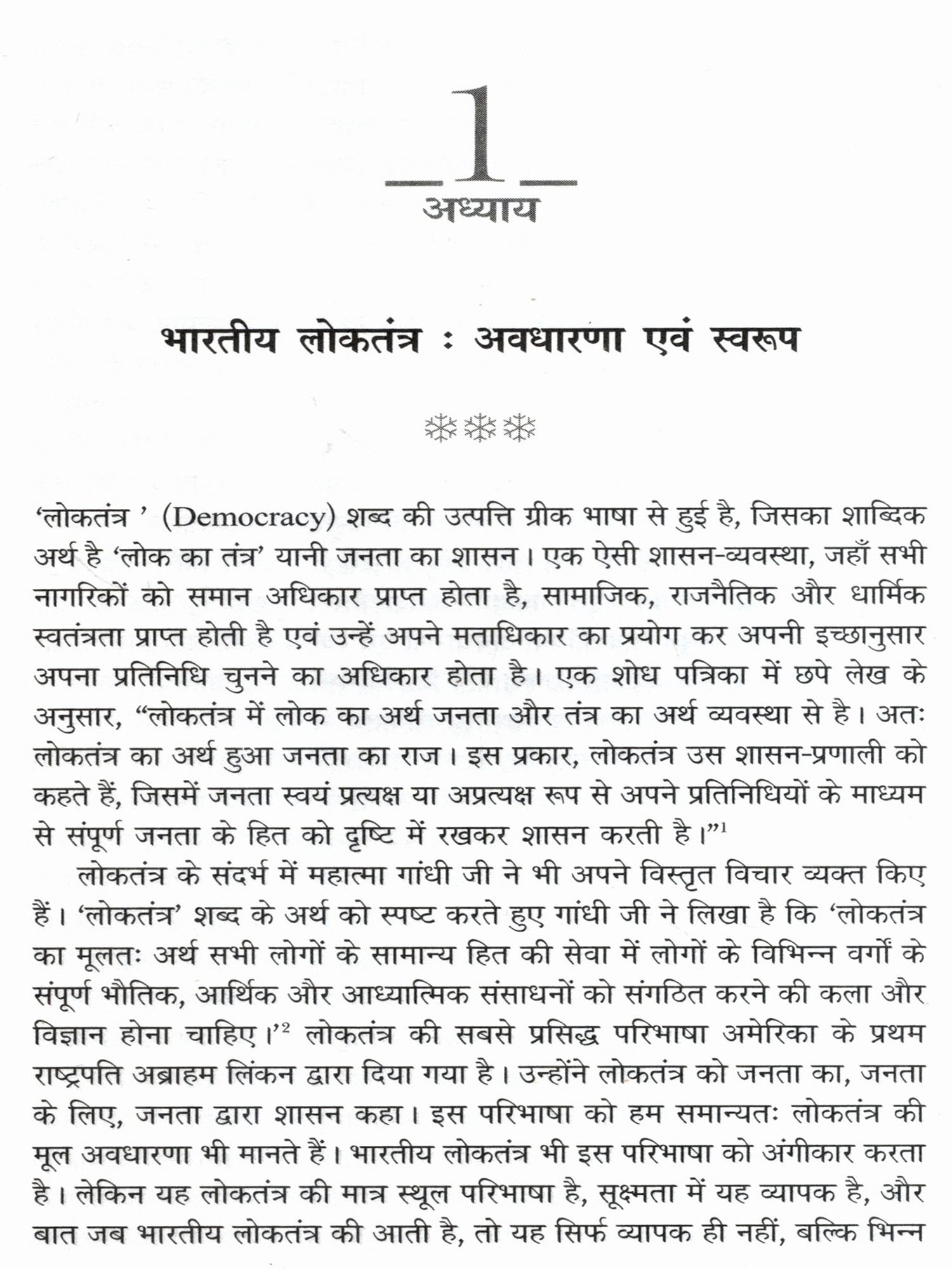 इस पुस्तक के प्रथम अध्याय 'भारतीय लोकतंत्र अवधारणा एवं स्वरूप' में भारतीय लोकतंत्र की अवधारणा पर बात करते हुए उसके अपने रूप यानी स्वरूप को स्पष्ट किया गया है। इस अध्याय में यह दिखाया गया है कि भारतीय लोकतंत्र विश्व के अन्य देशों के लोकतंत्र से कैसे भिन्न है। जब हम कहते हैं कि भारत विभिन्नताओं का देश है, तब यह सिर्फ एक कथन नहीं होता, इसके साथ भारत का इतिहास, भूगोल, संस्कृति, भाषा, धर्म, जाति, लोग आदि सब जुड़े होते हैं और ये सब भारत में इतने भिन्न हैं कि कई विद्वानों ने भारत की एक देश के रूप में कल्पना करना ही आश्चर्य माना था। इतनी अधिक विभिन्नताओं को समाहित करते हुए भी अगर भारत आज एक मजबूत लोकतांत्रिक देश के रूप में खड़ा है, तो इसके पीछे भारत की मजबूत लोकतांत्रिक अवधारणा ही है। इन सब बातों को समेटते हुए इस अध्याय में भारतीय लोकतंत्र की एक पूर्ण तस्वीर प्रस्तुत करने की कोशिश की गई है।