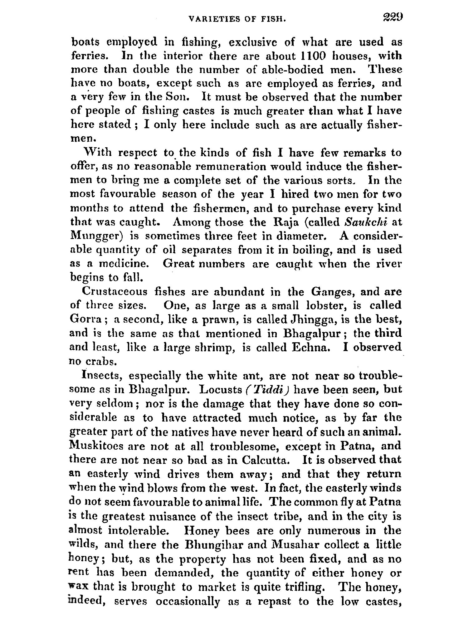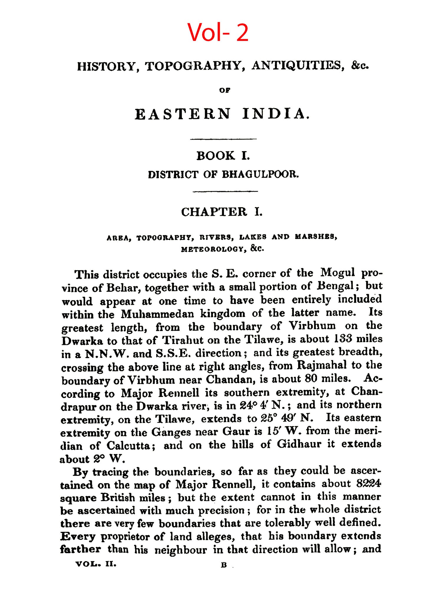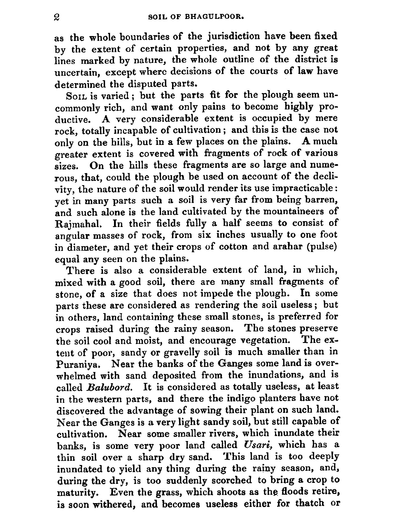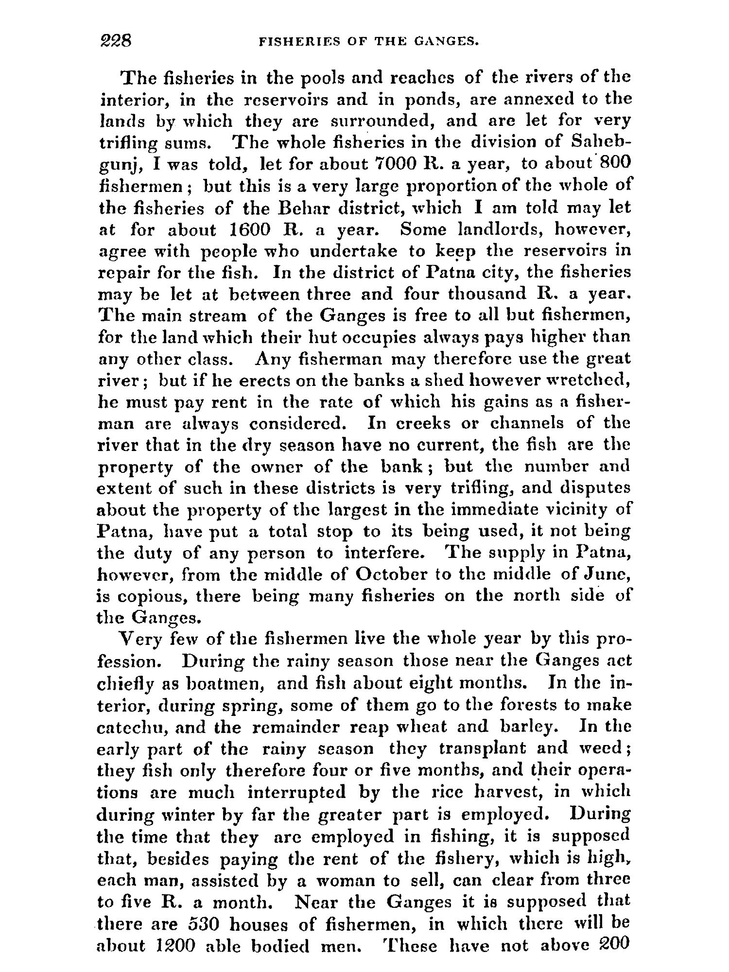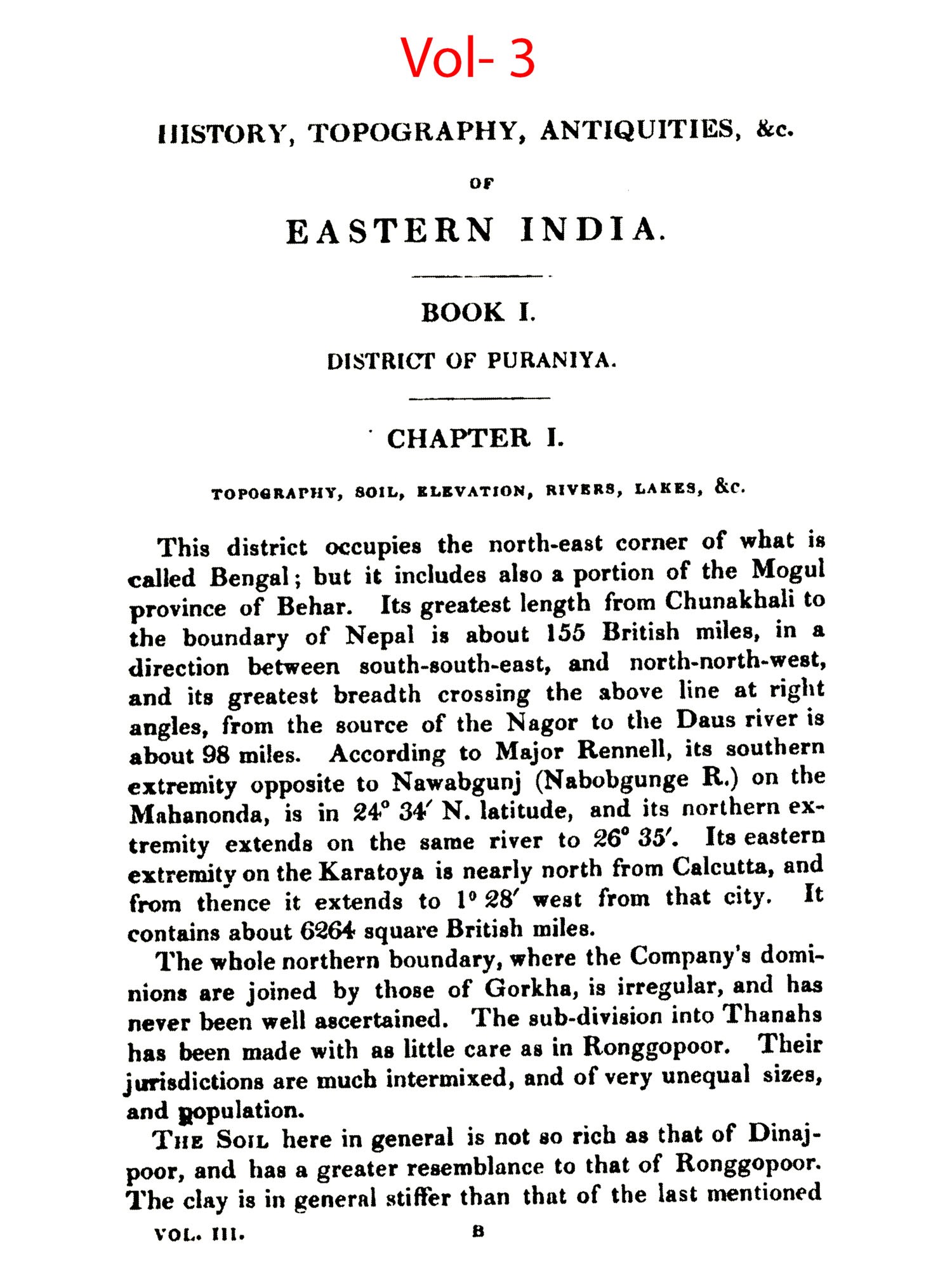 The survey of the districts of Behar and Patna, of Shahabad, Bhagulpoor, Dinajipoor, Goruckpoor, Puraniah, Rung-poor, and Assam, forming the Eastern territories of British India, and containing upwards of 60,000 square miles and nearly 15,000,000 of British subjects, was executed by the Supreme Government of Bengal, under orders from the Court of Directors of the Honourable East India Company, dated the 7th of January, 1807, wherein the honourable Court observe, "We are of opinion that a statistical survey of the country, under the immediate authority of your Presidency, would be attended with much utility; we therefore recommend proper steps to be taken for carrying the same into execution." The Court further added, that Dr. Francis Buchanan, who had been employed by the Marquess Wellesley in the survey of Mysore, and to whom his Lordship had confided the management of the establishment which the noble Marquess formed at Barrackpore for investigating the natural history of India,† should be appointed to undertake the survey. The Governor-General in Council, in conformity with these orders, nominated Dr. F. Buchanan for this important duty, with an allowance of 1500 sicca rupees monthly, exclusive of the pay and batta of his rank, and efficient learned assistants, draftsmen, &c. were appointed to execute his instructions. The extent of the investigation will be seen from the directions issued for the guidance of the survey by the Supreme Government under date 11th Sept. 1807. which were as follows:- "Your inquiries are to extend throughout the whole of the territories subject to the immediate authority of the Presidency of Fort William. "The Governor General in Council is of opinion that these inquiries should commence in the district of Rungpur, and that from thence you should proceed to the westward through each district on the north side of the Ganges, until you reach the western boundary of the Honourable Company's provinces. You will then proceed towards the south and east, until you have examined all the districts on the south side of the great river, and afterwards proceed to Dacca, and the other districts towards the eastern frontier. "It is also desirable, that you should extend your inquiries to the ad-jacent countries, and to those petty states with which the British Govern-ment has no regular intercourse. In performing this duty, however, you are prohibited from quitting the Company's territories, and are directed to confine your inquiries to consulting such of the natives of those countries as you may meet with, or natives of the British territories who have visited the countries in question. "Your inquiries should be particularly directed to the following sub-jects, which you are to examine with as much accuracy as local circum-stances will admit. "1. A Topographical account of each district, including the extent, soil, plains, mountains, rivers, harbours, towns, and subdivisions; together with an account of the air and weather, and whatever you may discover worthy of remark concerning the history and antiquities of the country. "II. The Condition of the Inhabitants; their number, the state of their food, clothing, and habitations; the peculiar diseases to which they are liable; together with the means that have been taken or may be proposed to remove them the education of youth; and the provision or resources for the indigent. "III. Religion; the number, progress, and most remarkable customs of each different sect or tribe of which the population consists; together with the emoluments and power which their priests and chiefs enjoy; and what circumstances exist or may probably arise that might attach them to Government, or render them disaffected. "IV. The Natural Productions of the Country, animal, vegetable, and mineral; especially such as are made use of in diet, in medicine, in commerce, or in arts and manufactures. The following works deserve your particular attention: "Ist. The fisheries, their extent, the manner in which they are con-ducted, and the obstacles that appear to exist against their improvement and extension. "2nd. The forests, of which you will endeavour to ascertain the extent and situation, with respect to water conveyance.