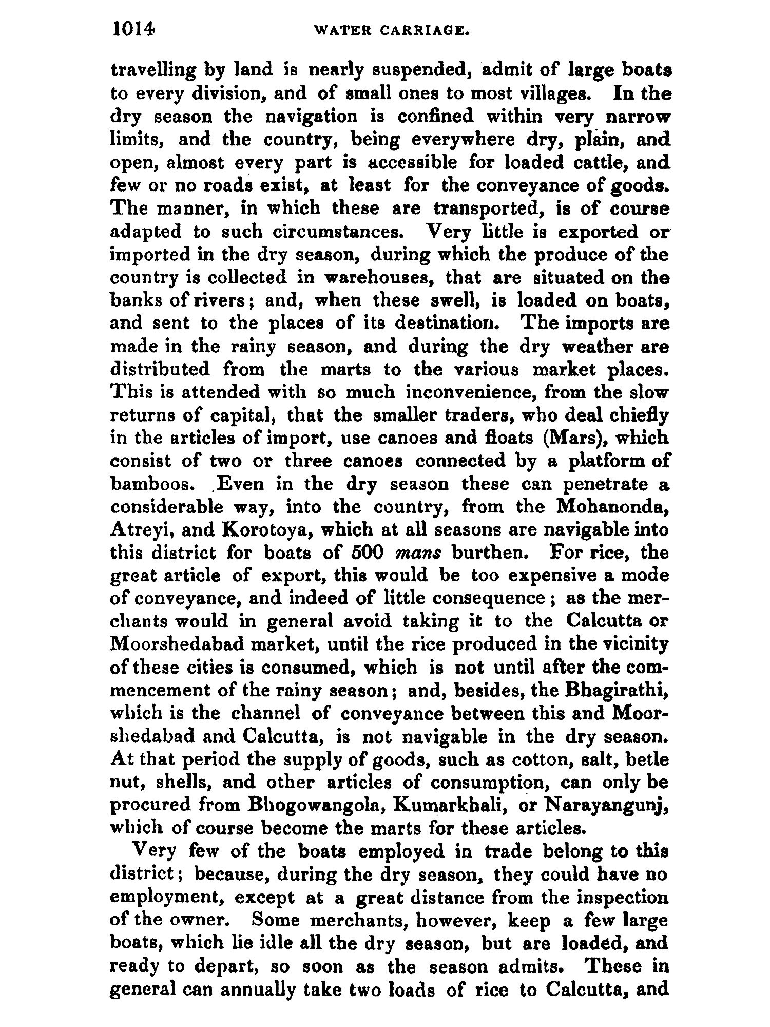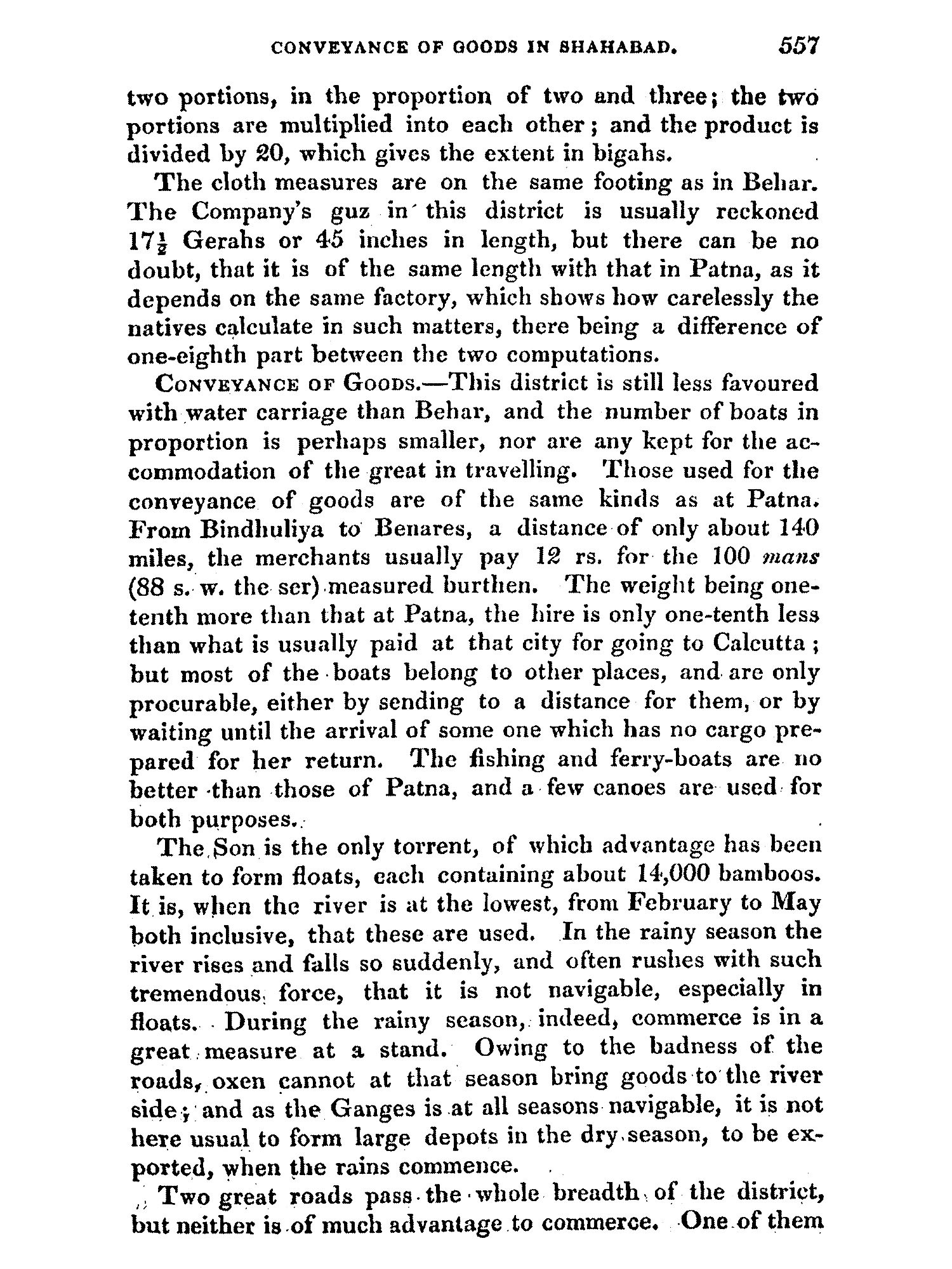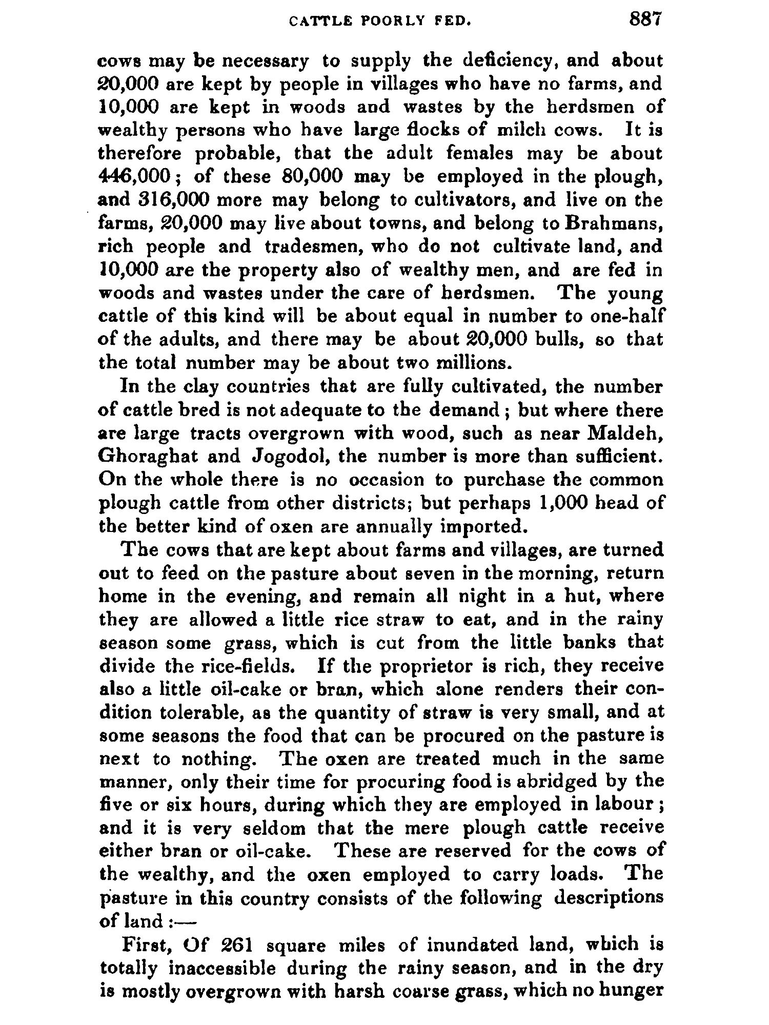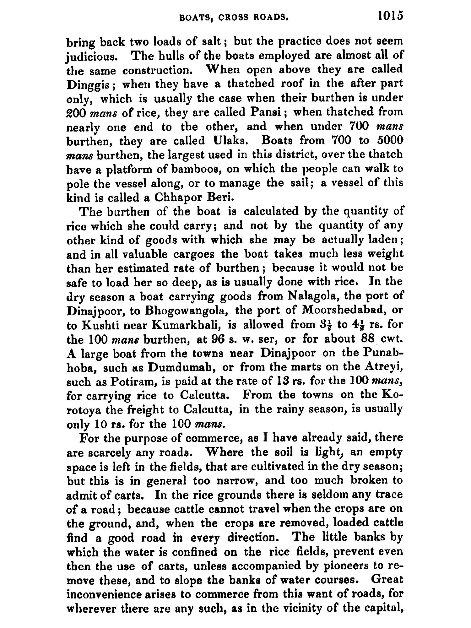 The survey of the districts of Behar and Patna, of Shahabad, Bhagulpoor, Dinajipoor, Goruckpoor, Puraniah, Rung-poor, and Assam, forming the Eastern territories of British India, and containing upwards of 60,000 square miles and nearly 15,000,000 of British subjects, was executed by the Supreme Government of Bengal, under orders from the Court of Directors of the Honourable East India Company, dated the 7th of January, 1807, wherein the honourable Court observe, "We are of opinion that a statistical survey of the country, under the immediate authority of your Presidency, would be attended with much utility; we therefore recommend proper steps to be taken for carrying the same into execution." The Court further added, that Dr. Francis Buchanan, who had been employed by the Marquess Wellesley in the survey of Mysore, and to whom his Lordship had confided the management of the establishment which the noble Marquess formed at Barrackpore for investigating the natural history of India,† should be appointed to undertake the survey. The Governor-General in Council, in conformity with these orders, nominated Dr. F. Buchanan for this important duty, with an allowance of 1500 sicca rupees monthly, exclusive of the pay and batta of his rank, and efficient learned assistants, draftsmen, &c. were appointed to execute his instructions. The extent of the investigation will be seen from the directions issued for the guidance of the survey by the Supreme Government under date 11th Sept. 1807. which were as follows:- "Your inquiries are to extend throughout the whole of the territories subject to the immediate authority of the Presidency of Fort William. "The Governor General in Council is of opinion that these inquiries should commence in the district of Rungpur, and that from thence you should proceed to the westward through each district on the north side of the Ganges, until you reach the western boundary of the Honourable Company's provinces. You will then proceed towards the south and east, until you have examined all the districts on the south side of the great river, and afterwards proceed to Dacca, and the other districts towards the eastern frontier. "It is also desirable, that you should extend your inquiries to the ad-jacent countries, and to those petty states with which the British Govern-ment has no regular intercourse. In performing this duty, however, you are prohibited from quitting the Company's territories, and are directed to confine your inquiries to consulting such of the natives of those countries as you may meet with, or natives of the British territories who have visited the countries in question. "Your inquiries should be particularly directed to the following sub-jects, which you are to examine with as much accuracy as local circum-stances will admit. "1. A Topographical account of each district, including the extent, soil, plains, mountains, rivers, harbours, towns, and subdivisions; together with an account of the air and weather, and whatever you may discover worthy of remark concerning the history and antiquities of the country. "II. The Condition of the Inhabitants; their number, the state of their food, clothing, and habitations; the peculiar diseases to which they are liable; together with the means that have been taken or may be proposed to remove them the education of youth; and the provision or resources for the indigent. "III. Religion; the number, progress, and most remarkable customs of each different sect or tribe of which the population consists; together with the emoluments and power which their priests and chiefs enjoy; and what circumstances exist or may probably arise that might attach them to Government, or render them disaffected. "IV. The Natural Productions of the Country, animal, vegetable, and mineral; especially such as are made use of in diet, in medicine, in commerce, or in arts and manufactures. The following works deserve your particular attention: "Ist. The fisheries, their extent, the manner in which they are con-ducted, and the obstacles that appear to exist against their improvement and extension. "2nd. The forests, of which you will endeavour to ascertain the extent and situation, with respect to water conveyance.