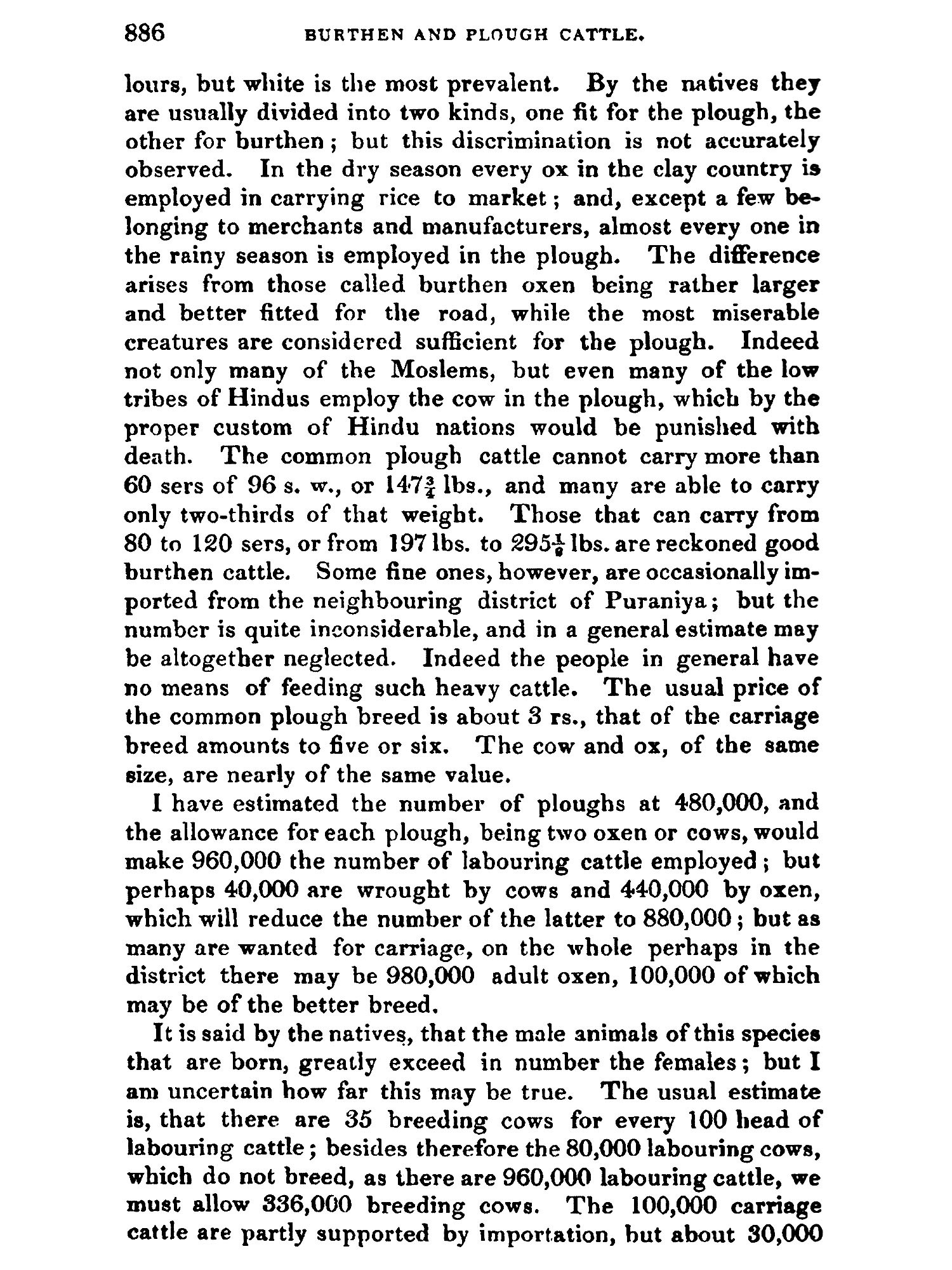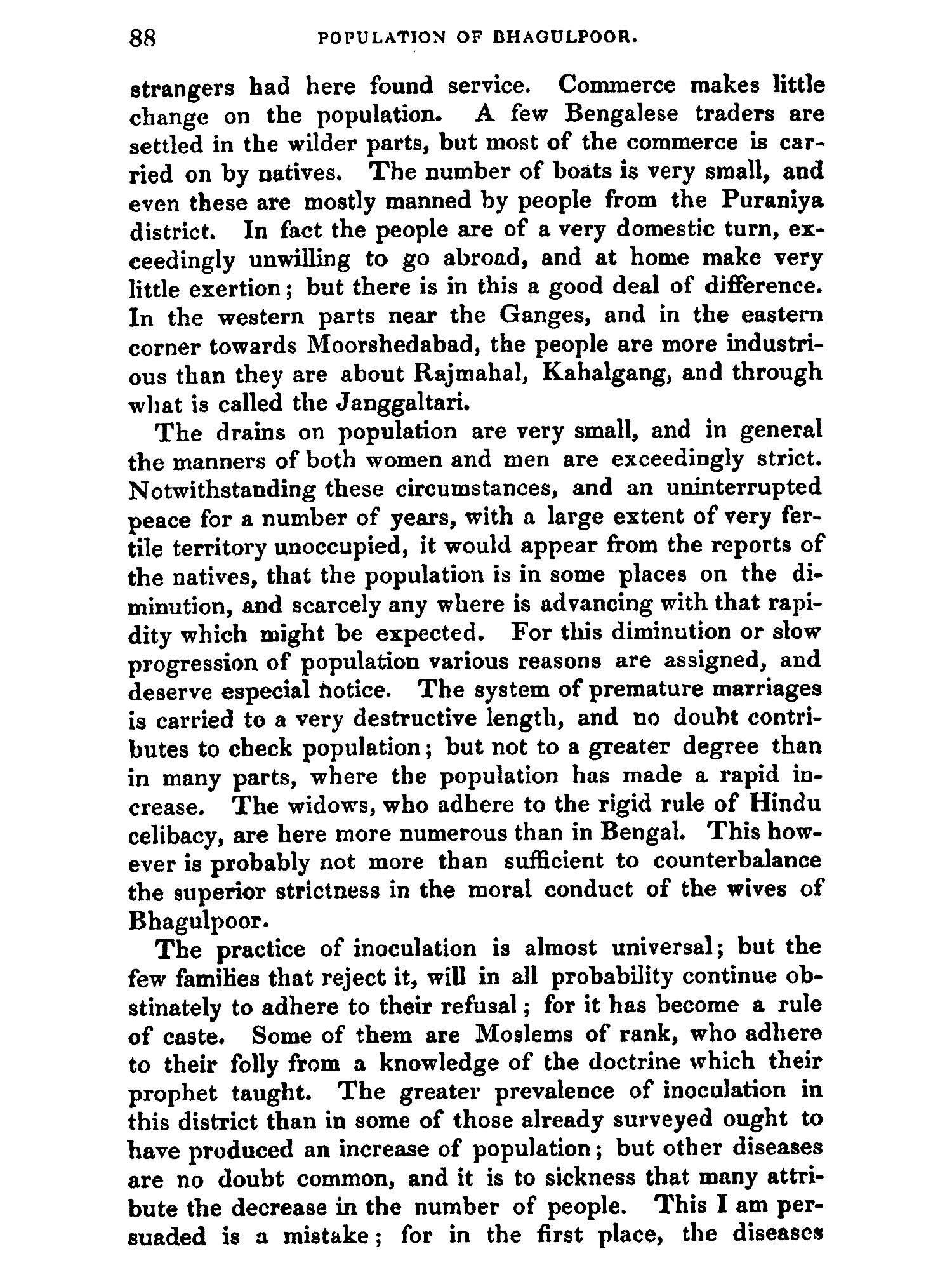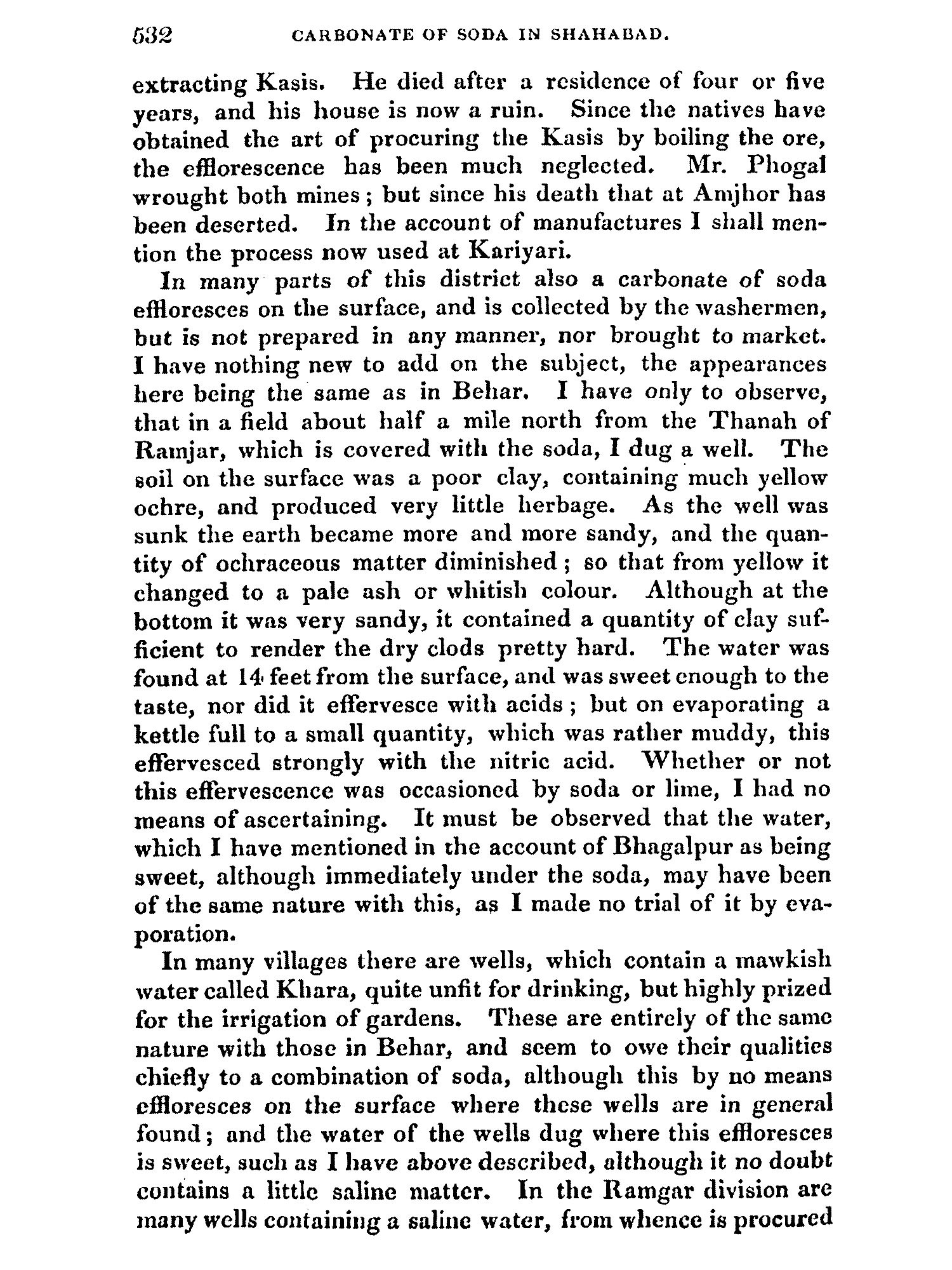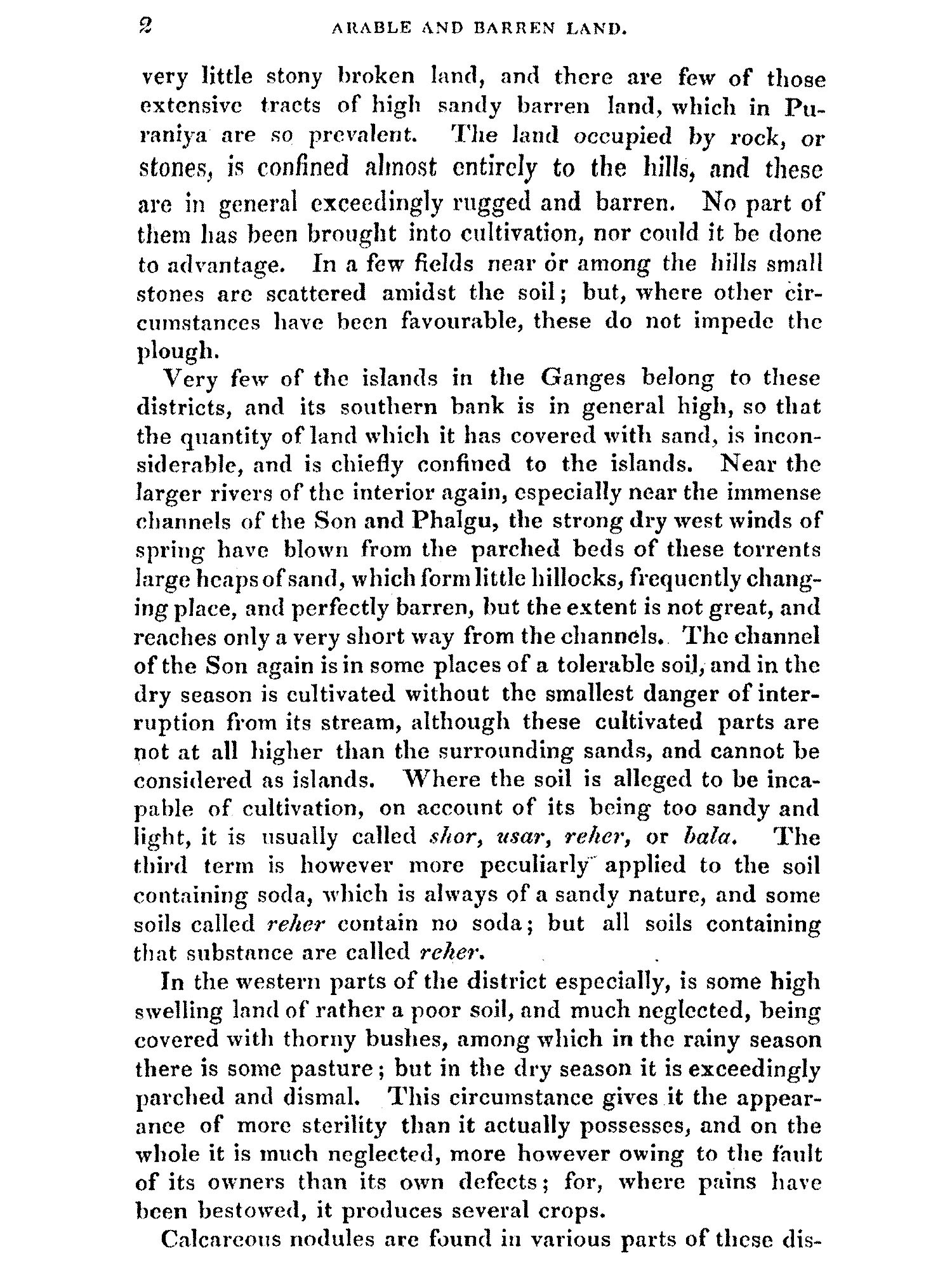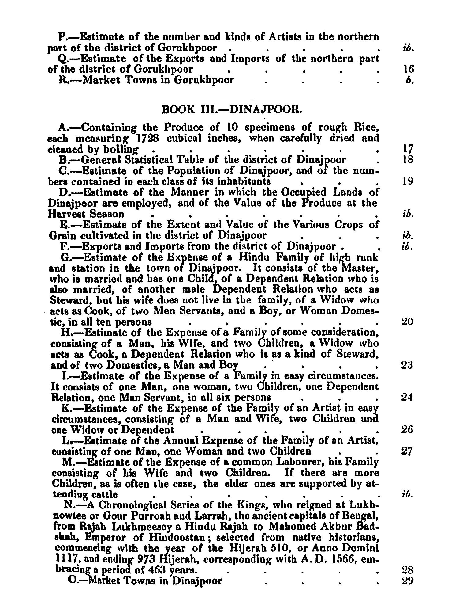 The survey of the districts of Behar and Patna, of Shahabad, Bhagulpoor, Dinajipoor, Goruckpoor, Puraniah, Rung-poor, and Assam, forming the Eastern territories of British India, and containing upwards of 60,000 square miles and nearly 15,000,000 of British subjects, was executed by the Supreme Government of Bengal, under orders from the Court of Directors of the Honourable East India Company, dated the 7th of January, 1807, wherein the honourable Court observe, "We are of opinion that a statistical survey of the country, under the immediate authority of your Presidency, would be attended with much utility; we therefore recommend proper steps to be taken for carrying the same into execution." The Court further added, that Dr. Francis Buchanan, who had been employed by the Marquess Wellesley in the survey of Mysore, and to whom his Lordship had confided the management of the establishment which the noble Marquess formed at Barrackpore for investigating the natural history of India,† should be appointed to undertake the survey. The Governor-General in Council, in conformity with these orders, nominated Dr. F. Buchanan for this important duty, with an allowance of 1500 sicca rupees monthly, exclusive of the pay and batta of his rank, and efficient learned assistants, draftsmen, &c. were appointed to execute his instructions. The extent of the investigation will be seen from the directions issued for the guidance of the survey by the Supreme Government under date 11th Sept. 1807. which were as follows:- "Your inquiries are to extend throughout the whole of the territories subject to the immediate authority of the Presidency of Fort William. "The Governor General in Council is of opinion that these inquiries should commence in the district of Rungpur, and that from thence you should proceed to the westward through each district on the north side of the Ganges, until you reach the western boundary of the Honourable Company's provinces. You will then proceed towards the south and east, until you have examined all the districts on the south side of the great river, and afterwards proceed to Dacca, and the other districts towards the eastern frontier. "It is also desirable, that you should extend your inquiries to the ad-jacent countries, and to those petty states with which the British Govern-ment has no regular intercourse. In performing this duty, however, you are prohibited from quitting the Company's territories, and are directed to confine your inquiries to consulting such of the natives of those countries as you may meet with, or natives of the British territories who have visited the countries in question. "Your inquiries should be particularly directed to the following sub-jects, which you are to examine with as much accuracy as local circum-stances will admit. "1. A Topographical account of each district, including the extent, soil, plains, mountains, rivers, harbours, towns, and subdivisions; together with an account of the air and weather, and whatever you may discover worthy of remark concerning the history and antiquities of the country. "II. The Condition of the Inhabitants; their number, the state of their food, clothing, and habitations; the peculiar diseases to which they are liable; together with the means that have been taken or may be proposed to remove them the education of youth; and the provision or resources for the indigent. "III. Religion; the number, progress, and most remarkable customs of each different sect or tribe of which the population consists; together with the emoluments and power which their priests and chiefs enjoy; and what circumstances exist or may probably arise that might attach them to Government, or render them disaffected. "IV. The Natural Productions of the Country, animal, vegetable, and mineral; especially such as are made use of in diet, in medicine, in commerce, or in arts and manufactures. The following works deserve your particular attention: "Ist. The fisheries, their extent, the manner in which they are con-ducted, and the obstacles that appear to exist against their improvement and extension. "2nd. The forests, of which you will endeavour to ascertain the extent and situation, with respect to water conveyance.
