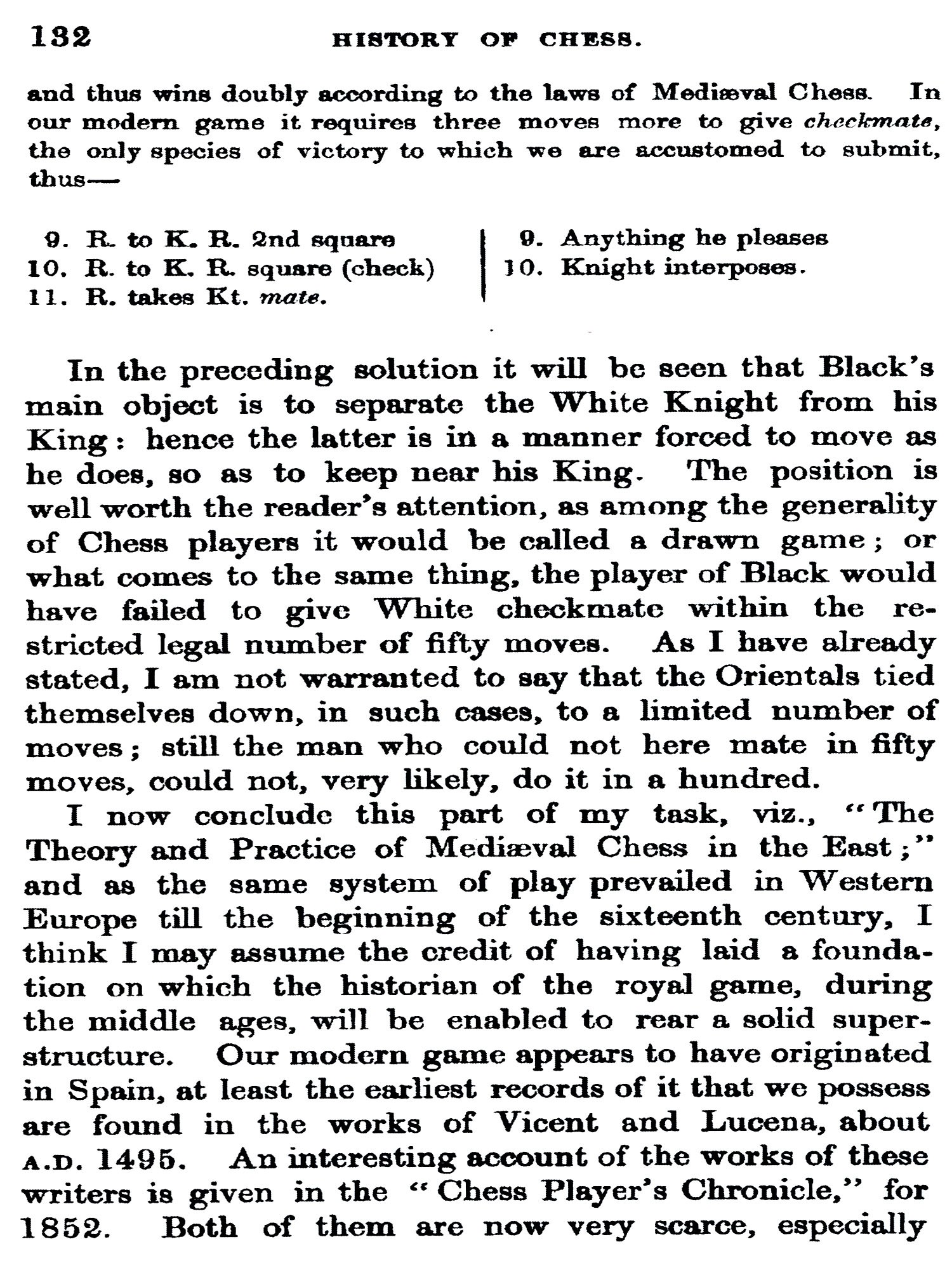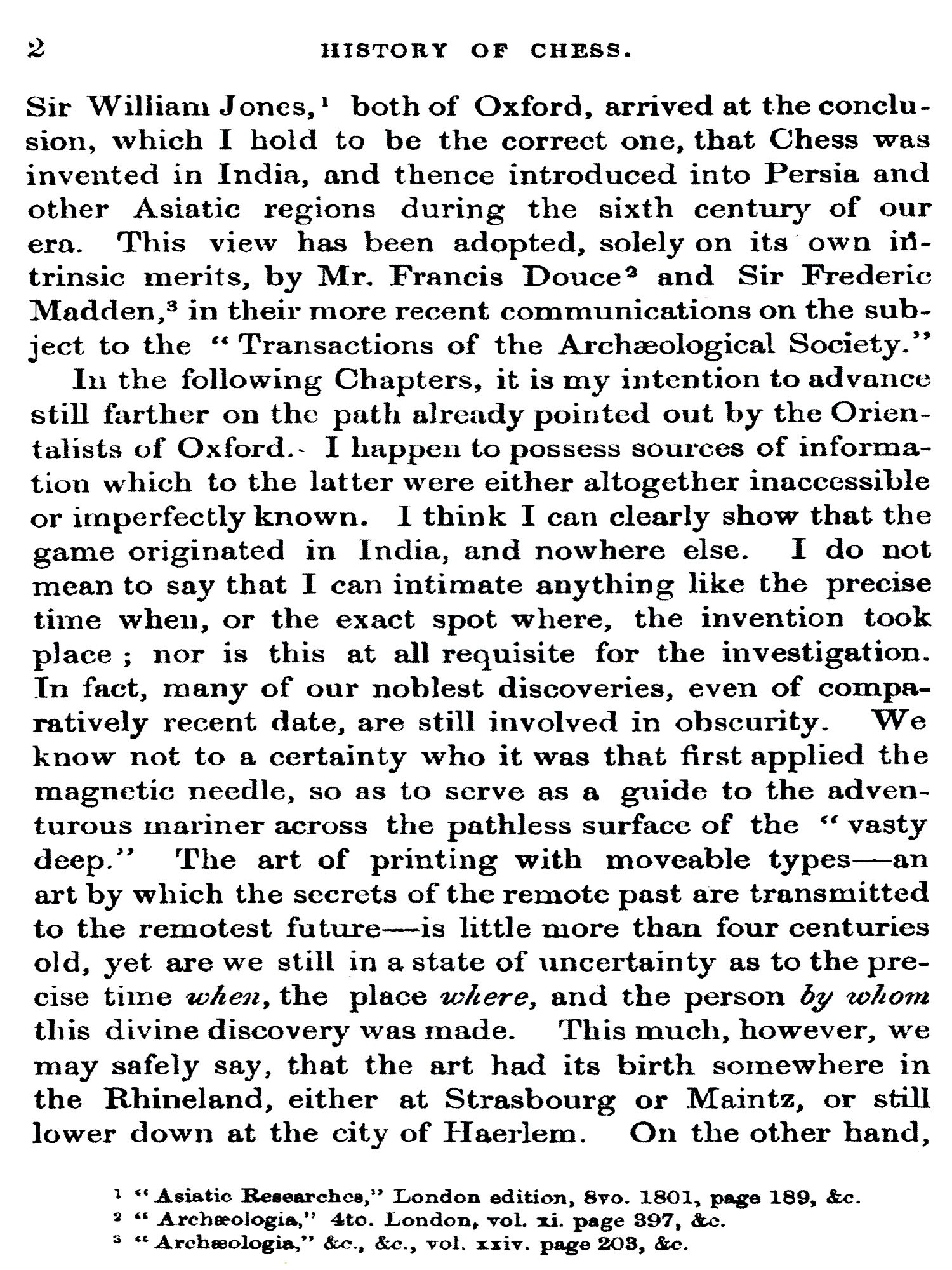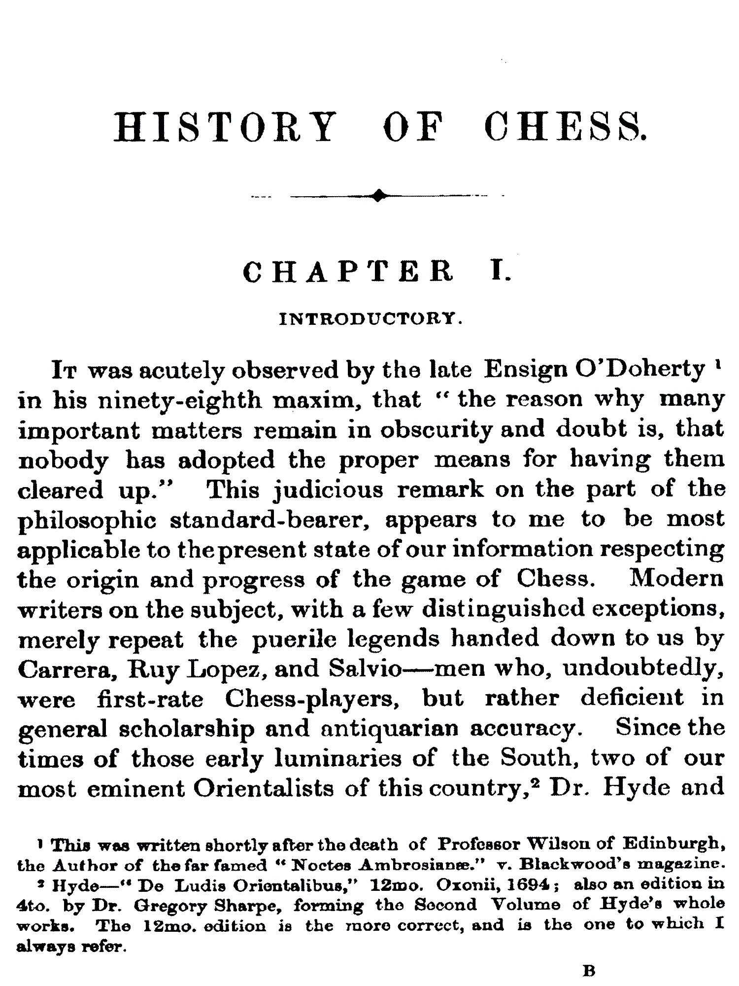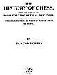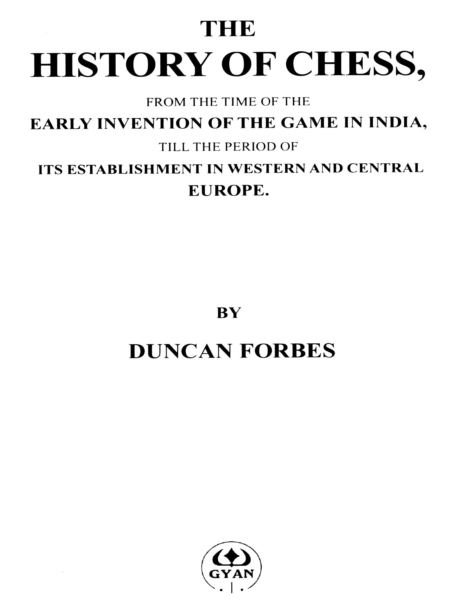 "The History of Chess: From the Time of the Early Invention of the Game in India, Till the Period of its Establishment in Western and Central Europe" is an authoritative book by Duncan Forbes, published in 1860. It offers an in-depth exploration of the origins and evolution of chess, tracing its roots back to ancient India where it started as Chaturanga. Forbes meticulously documents the game's passage through Persia (where it became known as Shatranj) before spreading to the Arab world and eventually reaching Europe. The work highlights the cultural exchanges and transformations chess underwent along this journey. Forbes' extensive research provides valuable insights into the historical and social impacts of chess, underscoring its significance in cross-cultural interactions over centuries.