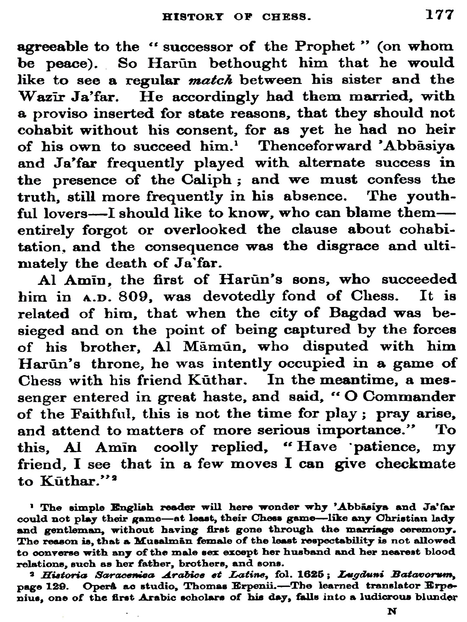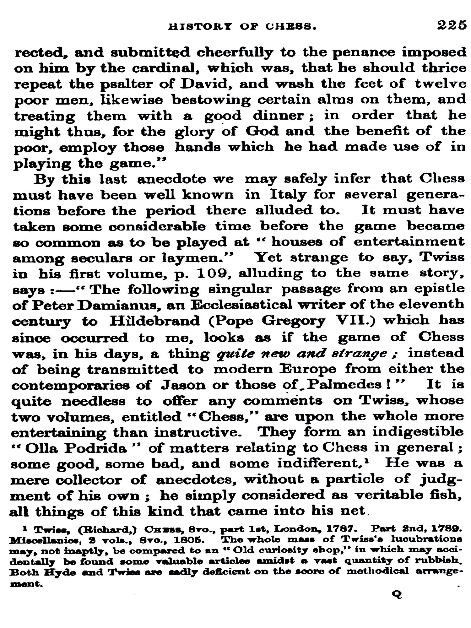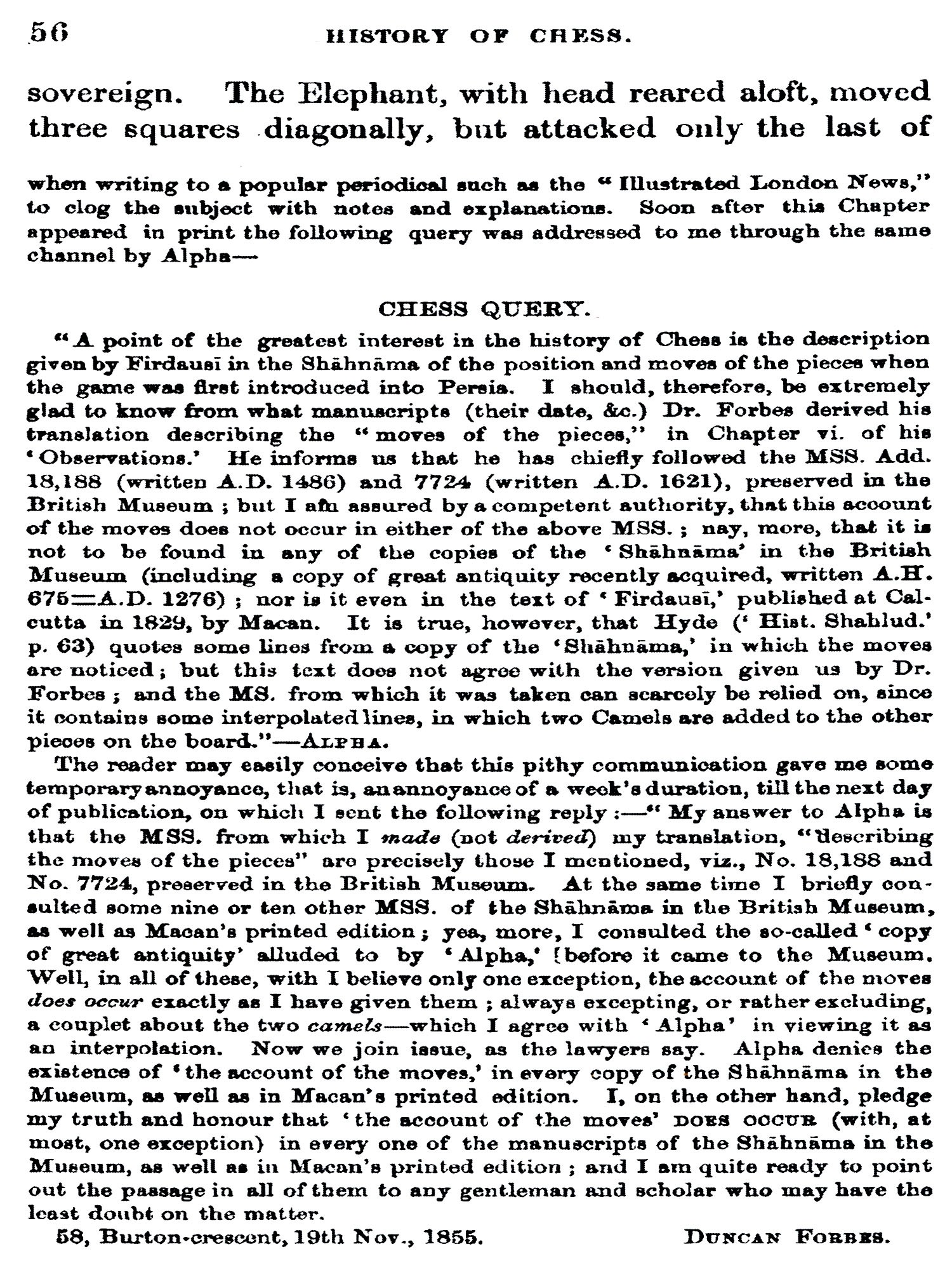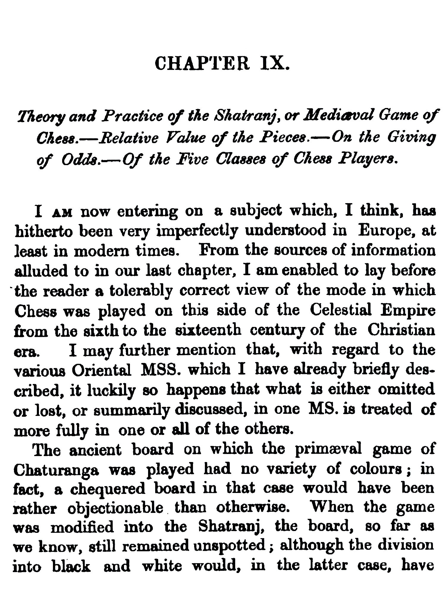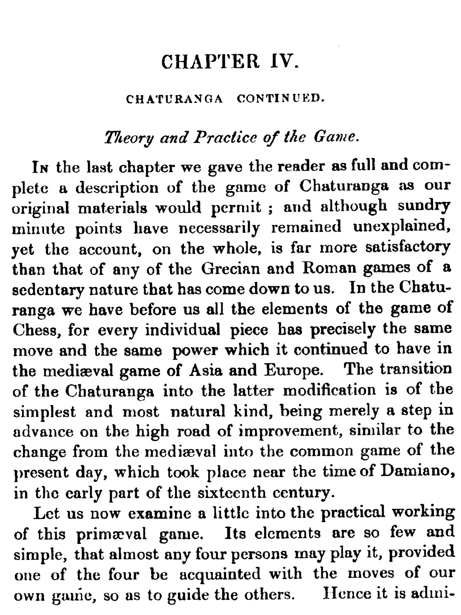 "The History of Chess: From the Time of the Early Invention of the Game in India, Till the Period of its Establishment in Western and Central Europe" is an authoritative book by Duncan Forbes, published in 1860. It offers an in-depth exploration of the origins and evolution of chess, tracing its roots back to ancient India where it started as Chaturanga. Forbes meticulously documents the game's passage through Persia (where it became known as Shatranj) before spreading to the Arab world and eventually reaching Europe. The work highlights the cultural exchanges and transformations chess underwent along this journey. Forbes' extensive research provides valuable insights into the historical and social impacts of chess, underscoring its significance in cross-cultural interactions over centuries.