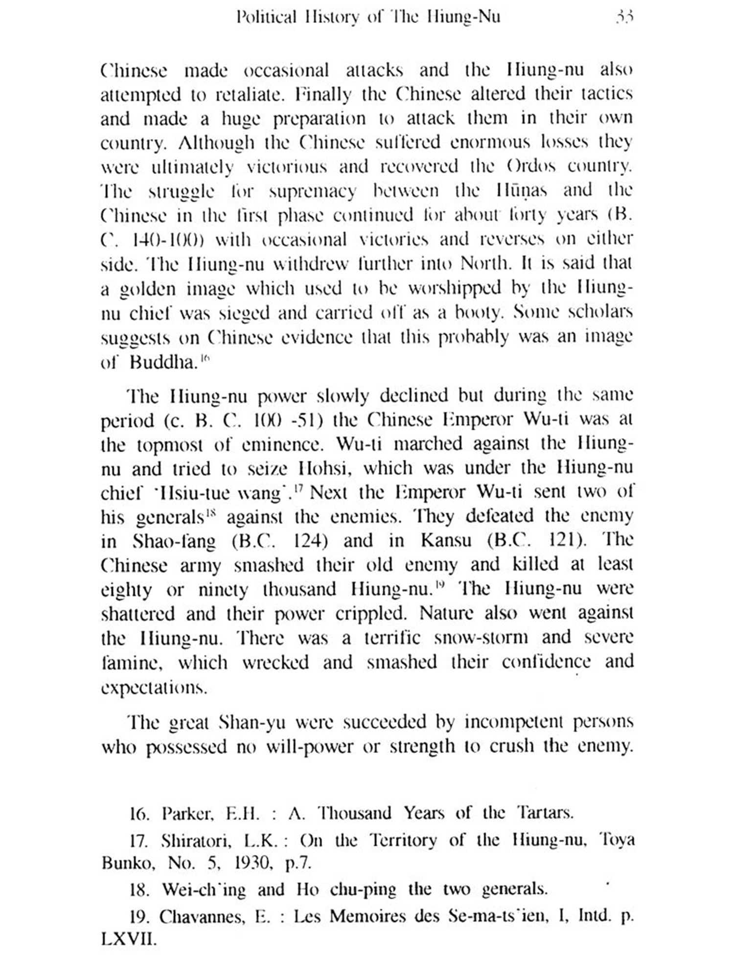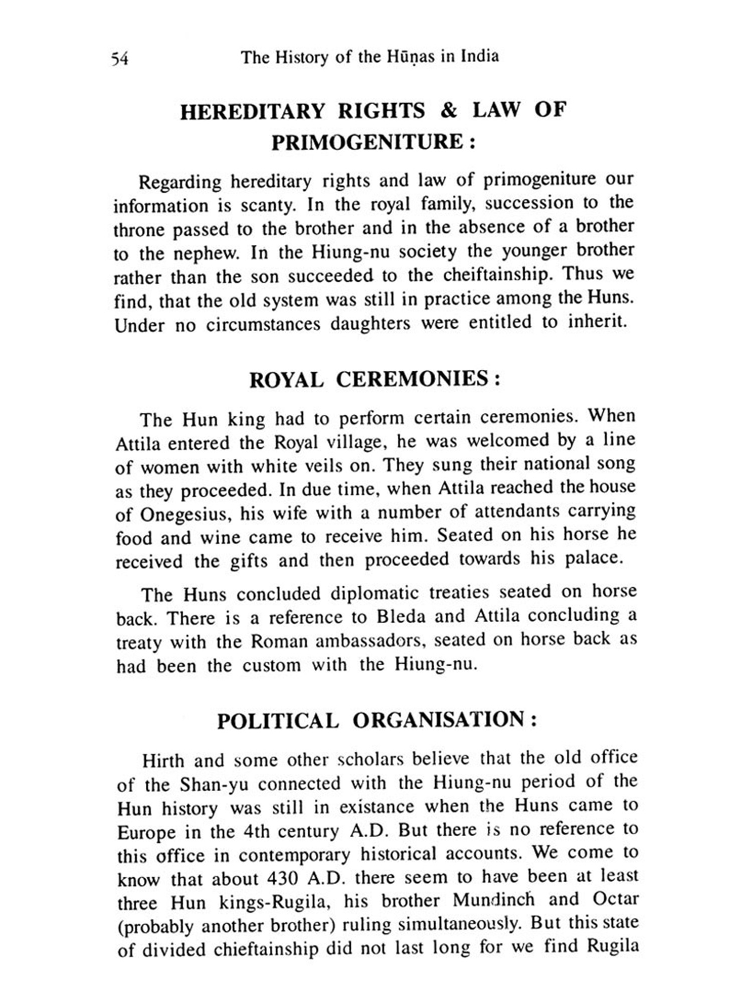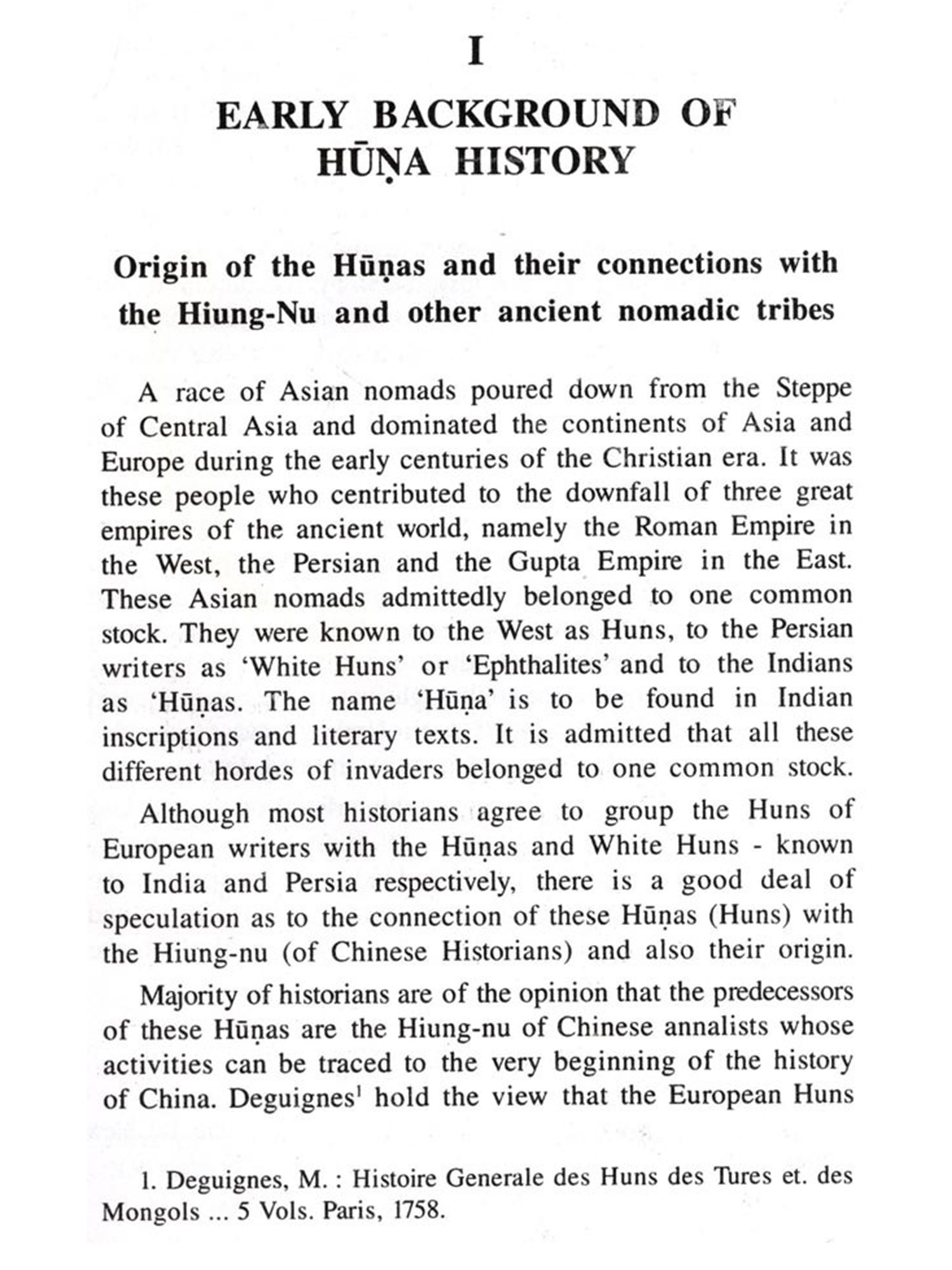 The advent of the Hunas in India was an event of far-reaching consequences in Her history. The Hūņas contributed substantially towards the destruction of the great empire of the Guptas. They established their political power in some parts of India. After the downfall of the Imperial Guptas, when the Pushyabhutis of Thaneswar attempted to build up another empire they had to confront the Hüņas against whom they had to proceed with their army. The rise of the Maukharis, the Pushyabhutis of Thaneswar and several other dynastic of indigenous origin introduced some amount of political unity which had been disrupted as a consequence of Hūņa invasion. The Hūnas continued to rule for several centuries as references to their political and military activities are to be found in literature and inscriptions down to about 11th century A.D. The Hūņas were Hinduised and according to many eminent Historians they came to be known as Rajputs, who defended Hindu culture and religion against later invaders of India. The actual contributions of the Hūņas in social, cultural and political fields have not yet been fully obtainable and ascertained. But a critical analysis of the materials relating to the different aspect of Indian history from about 5th century A.D. onwards which is proposed to be conducted by me is expected to throw important light on the problems (specially of political history connected with the Hūņas. For a complete study of the part history of India it is necessary that their origin and early antecedent history before they came into contact with India.