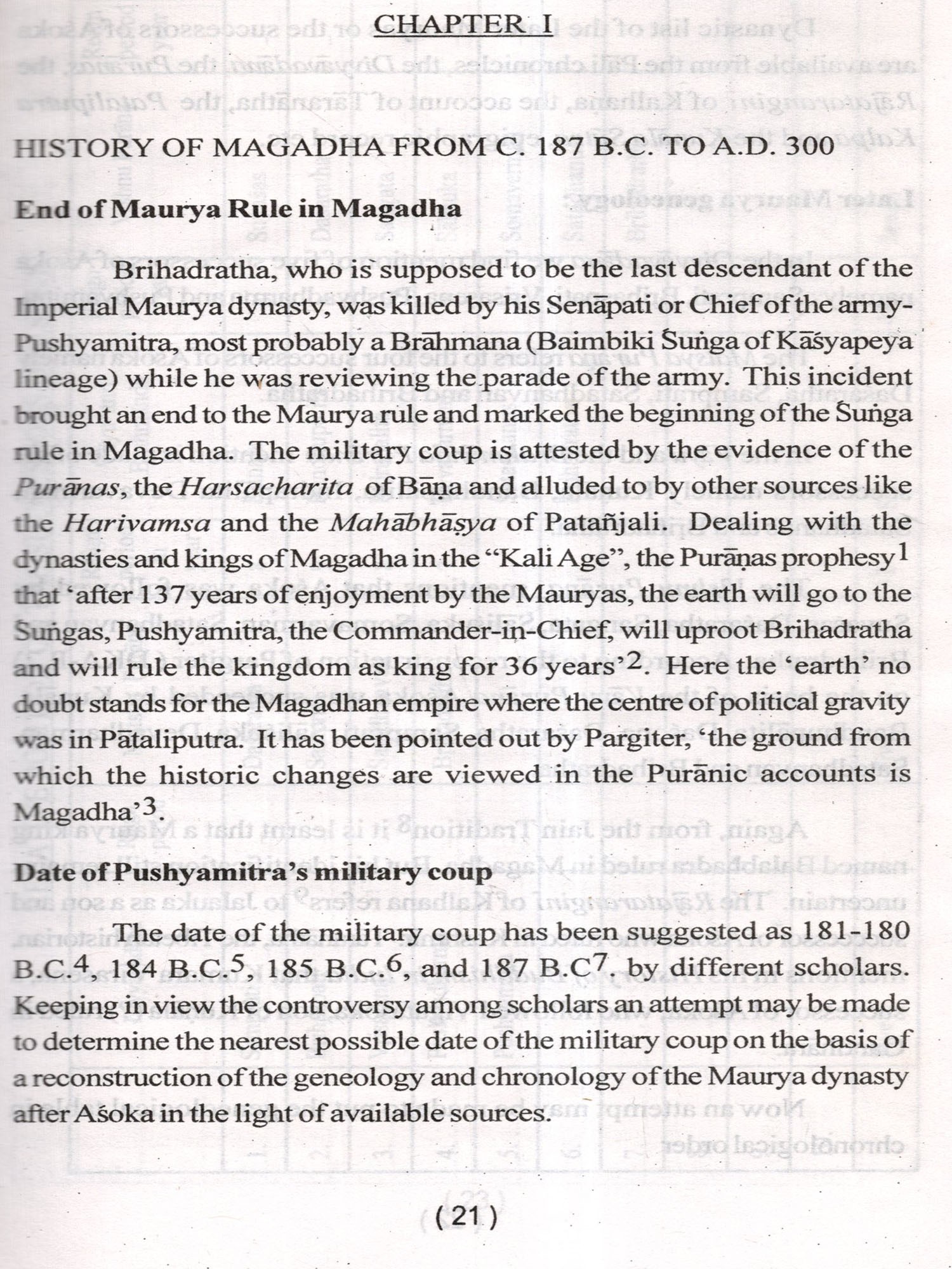 We have chosen the early history of Magadha (c. 187 В.С. -A.D. 300) as the field of our investigation. There are reasons more than one. Firstly, Magadha is located in Eastern India and the history of Magadha epitomises the history of Eastern India since sixth century B.C. It is reasonable to undertake an investigation into a regional history of India than the whole of Indian history. Secondly, considerable work has already been done by a host of scholars on Magadha either as a part of Indian history as a whole or as a separate regional history. But inspite of their best efforts they failed to throw light on the entire early history of Magadha, because they had suffered from dearth of materials. Thirdly, the history of Magadha from the fourth century B.C. to the second century B.C. and again from the fourth century A.D. to the sixth century A.D. has been more or less, well-constructed. But the Magadhan history in between those two periods remains still an enigma to the historians. Because, scholars have failed to provide a connected history of Magadha of the period concerned. Whatever they have written so far seems to indicate that for a long period Magadha lost its identity in the ongoing historical process. This position can hardly be accepted. Fourthly, whenever there is dearth of material, scholars often take resort to theorisation. Sometimes an attempt has been made to interprete the available historical data in such design that a favourite theory fits in it. But if we are genuinely interested in reconstructing the history of Magadha during the period between the downfall of the Mauryas and the rise of the Guptas, we have to seek and sort out the material in order to find out the actual trend of history which directly or indirectly involved Magadha. Lastly, in recent times epigraphists, numismatists and archaeologists have discovered some new material which has to be utilised with caution and care to throw light on the so-called 'dark period of Magadhan history.
