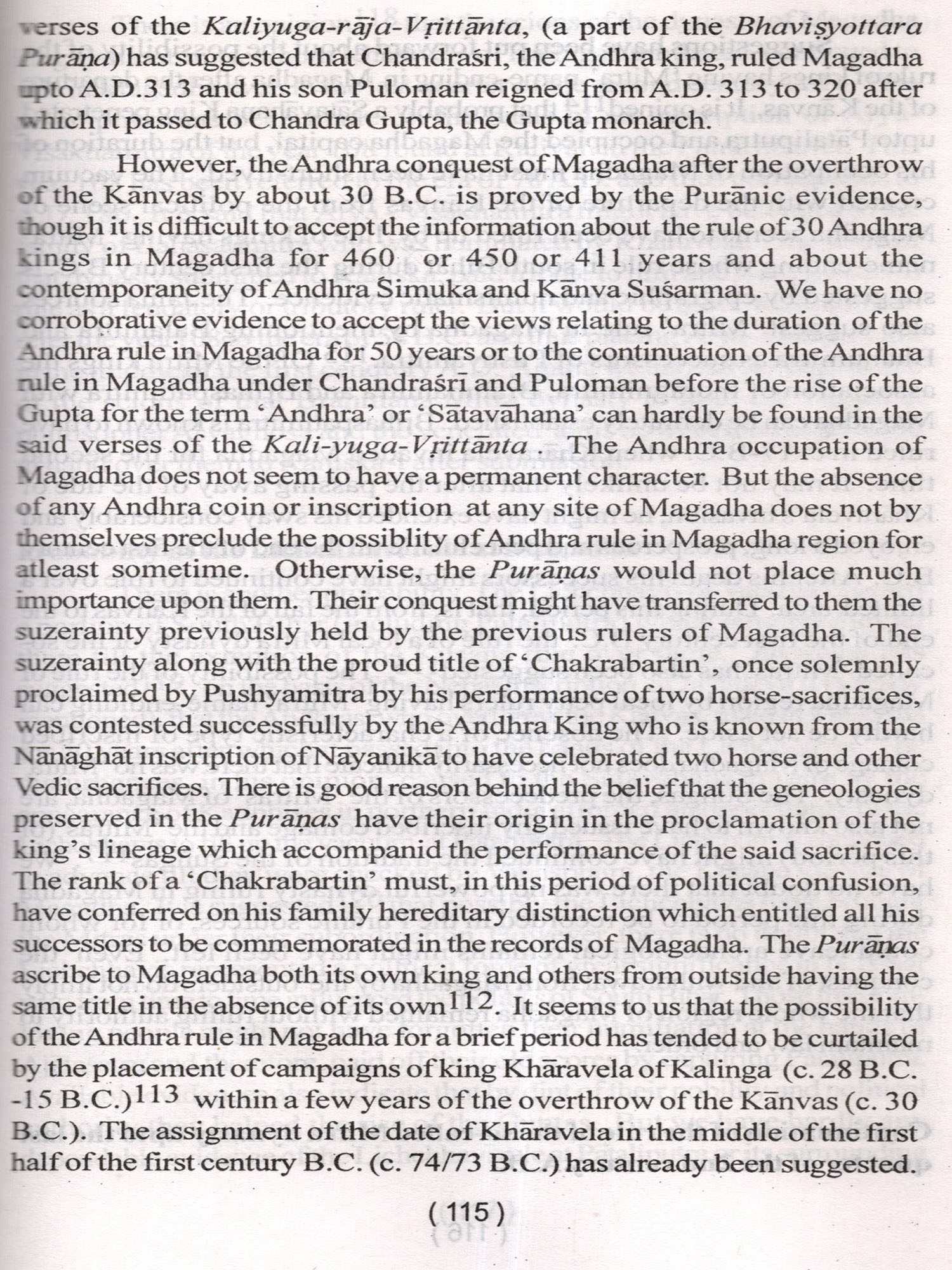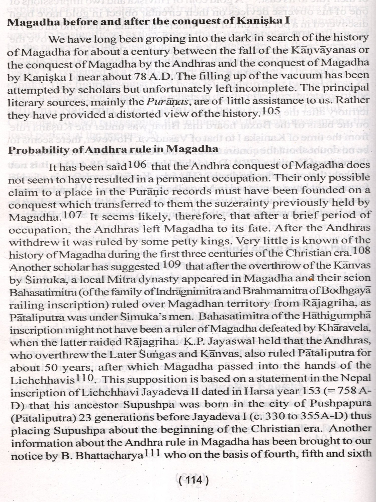 In fact, scholars who are accustomed to treat political history as the only history might fail to find out a connected history of Magadha during the Post-Maurya period. But, in fact, polity, society and economy of Magadha were in no way dissociated from those of Northern India. The process of development, change and progress, that constitutes the main theme of history was almost the same in Magadha as in other parts of the Ganga Valley. Therefore, the theory of 'dark period' may be reasonably ruled out.