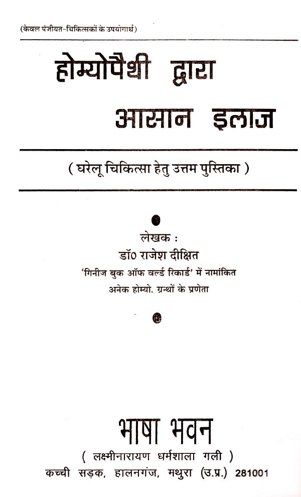 प्रस्तुत पुस्तक होम्योपैथिक चिकित्सा की एक अनुपम पुस्तक है जिसमें सामान्य रोगों के उपचार द्वारा शरीर को स्वस्थ एवं निरोगी बनाऐ रखने की चिकित्सा का अनुपम वर्णन किया गया है