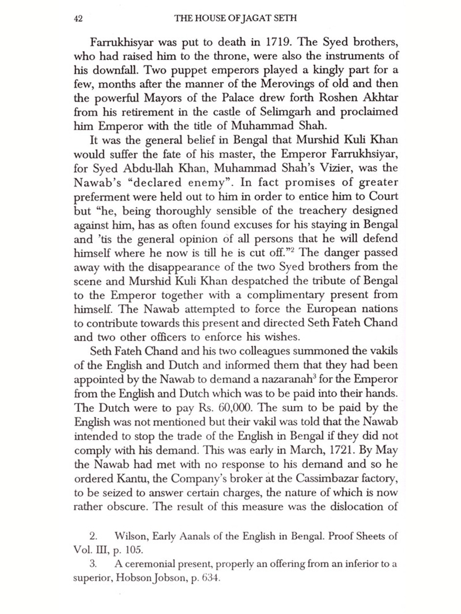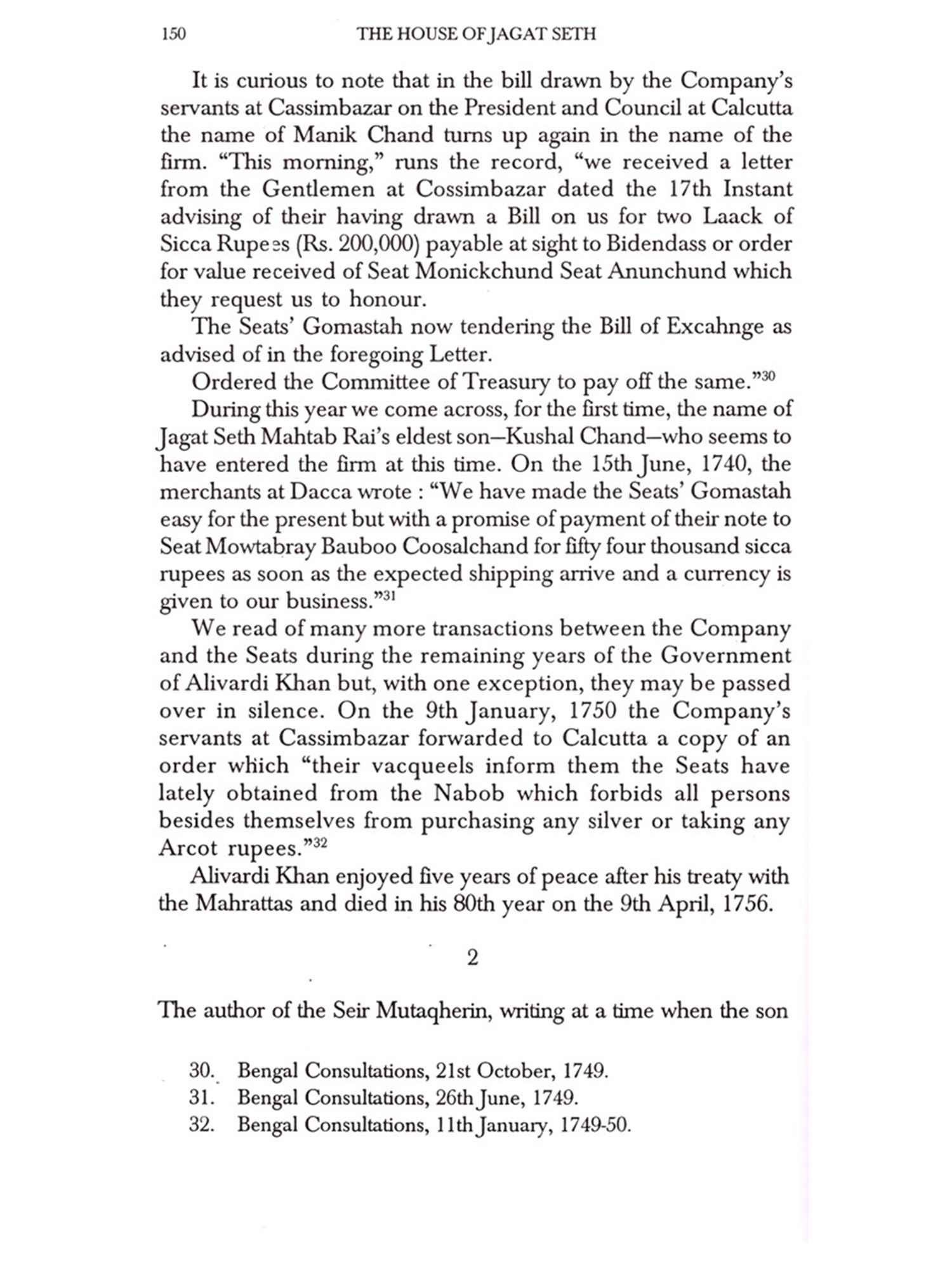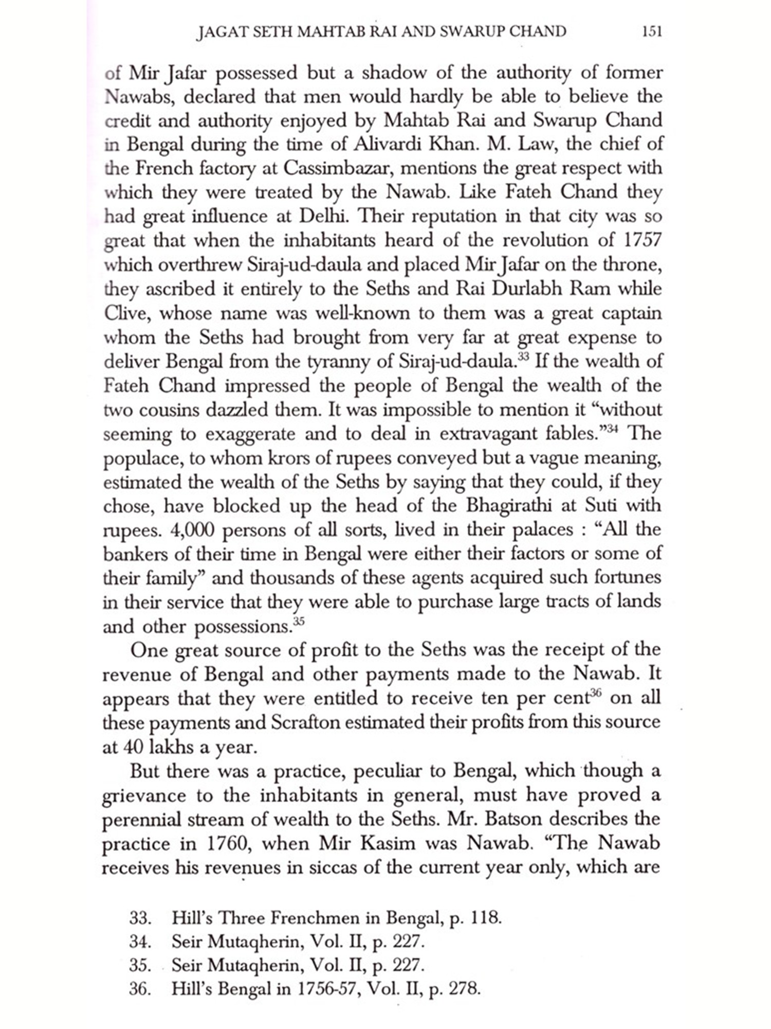 J. H. Little's The House of Jagat Seth appeared in two instalments in the pages of Bengal Past and Present (vols. XX and XXII) in 1920-1921. Mr. Little was Headmaster of Nawab Bahadur's Institution in Murshidabad, the Pre-British capital of Bengal. As he was staying at Murshidabad he had easy access to both original and secondary sources of the history of Bengal in the eighteenth century which has been described by some scholars as that of anarchy and disorder. Little collected his materials from India Office Library and the Company's Correspondence with the home government preserved in India. These were published in the Fort William - India House series edited by renowned scholars. Our historian also collected some first hand materials from the family archives of the Jagat Seths. For secondary sources he depended on Ghulam Hussain Tabatabai's Siyar-Mutakherin (history of modern times) and Ghulam Hussain Salim's Riyaz-us-Salatin. The English rendering of these Persian works was avail-able in his time. For English version of the story he consulted Scrafton's Reflections, Vansittart's Narrative and C. R. Wilson's Annals. He has also extensively quoted from Law's Memoirs and Hill's Bengal in 1756-57.