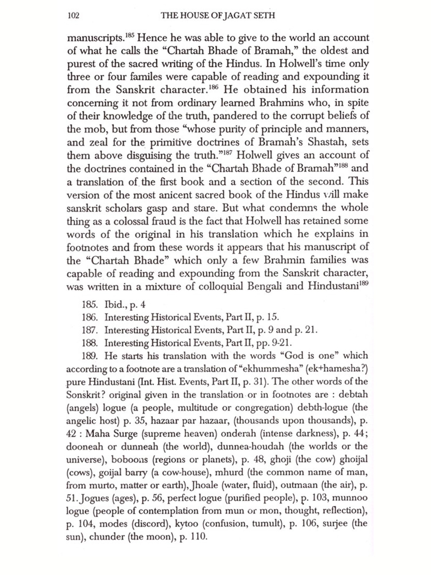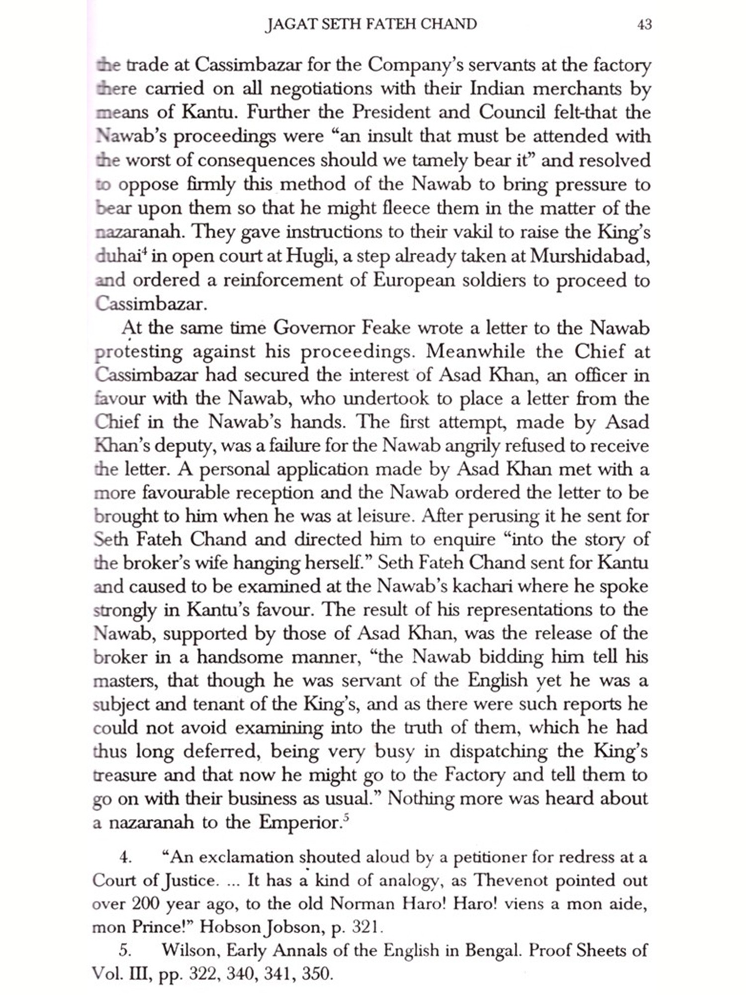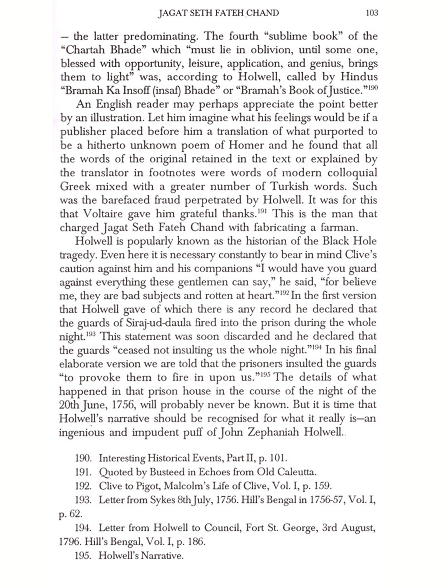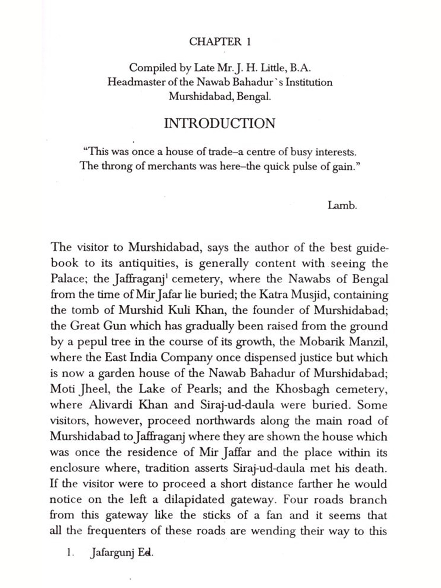 J. H. Little's The House of Jagat Seth appeared in two instalments in the pages of Bengal Past and Present (vols. XX and XXII) in 1920-1921. Mr. Little was Headmaster of Nawab Bahadur's Institution in Murshidabad, the Pre-British capital of Bengal. As he was staying at Murshidabad he had easy access to both original and secondary sources of the history of Bengal in the eighteenth century which has been described by some scholars as that of anarchy and disorder. Little collected his materials from India Office Library and the Company's Correspondence with the home government preserved in India. These were published in the Fort William - India House series edited by renowned scholars. Our historian also collected some first hand materials from the family archives of the Jagat Seths. For secondary sources he depended on Ghulam Hussain Tabatabai's Siyar-Mutakherin (history of modern times) and Ghulam Hussain Salim's Riyaz-us-Salatin. The English rendering of these Persian works was avail-able in his time. For English version of the story he consulted Scrafton's Reflections, Vansittart's Narrative and C. R. Wilson's Annals. He has also extensively quoted from Law's Memoirs and Hill's Bengal in 1756-57.
