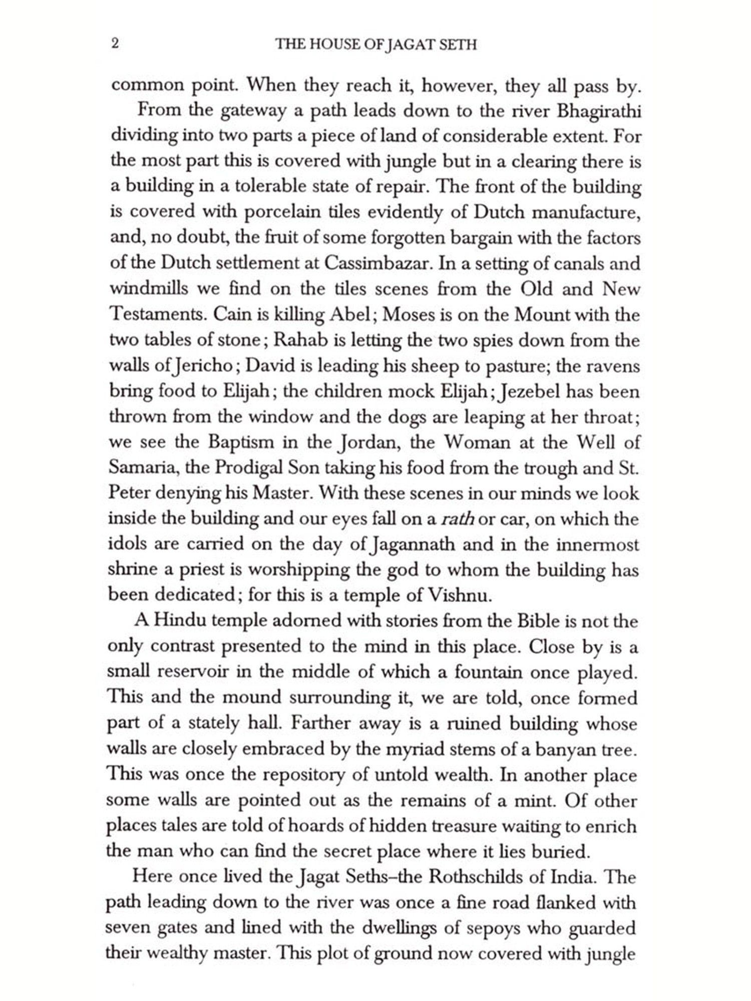 The House of Jagat Seth is the history of a great Banking family of India in the eighteenth century. Professor N. K. Sinha has compared their role in money and politics with that of the Fuggers of Augsburg and the Medicis of Florence. The Augsburg family was the banker of the Spanish royal family. The Medicis were the bankers of the Pope and the Valois of France. The European bankers enjoyed their days of glory and power in the sixteenth century while the Jagat Seth family flourished and enjoyed power and wealth in the first half of the eighteenth century. They reached the climax of their wealth and power between 17171767. In banking, exchange, minting of coins and many other areas of finance the Jagat Seth house enjoyed almost the monopoly of power. They had a tendency to monopolise finance capital. At this period there was no other banking family who could compete with them. This banking family hailed from Nagar in Marwar and by religion they were Jains. Though they lived in Bengal for generations and there were as many as eight Jagat Seths in the family they normally kept aloof from Bengali language and culture. Consequently this wealthy house which has been compared by Edmund Burke with the Bank of England could not leave any permanent mark on the cultural history of Bengal. The Medicis made Florence the cultural capital of Italy. Art, literature and culture of Bengal received nothing from this very wealthy banking family who had enormous wealth and political influence.